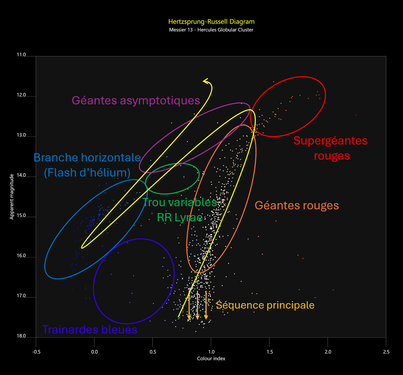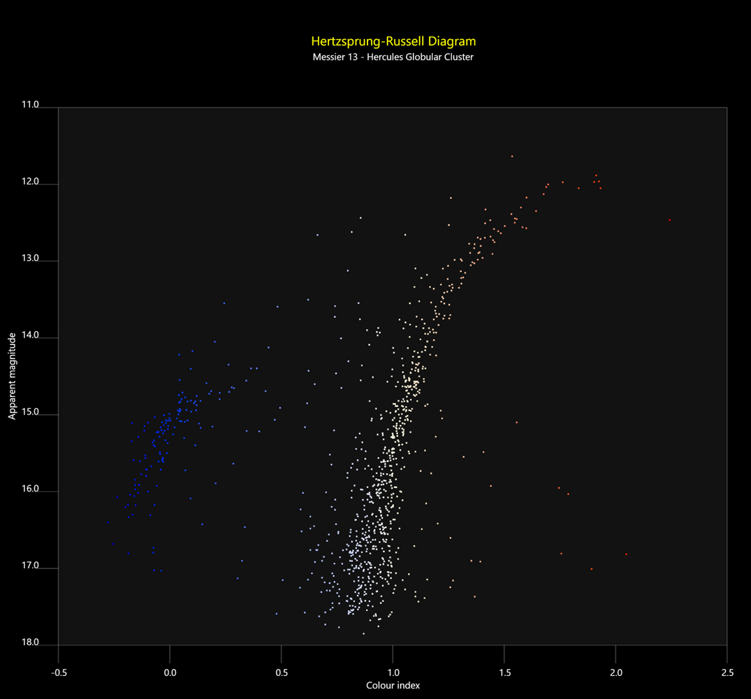 Bonjour à tous, Aujourd'hui je vous présente ma deuxième tentative sur un amas globulaire, M13, le géant de l'hémisphère nord! Toujours à l'Askar 120APO depuis la banlieue Parisienne. Pour le twist cette fois j'ai aussi récupérer un script Pixinsight qui à partir de la donnée brut en sortie d'empilement et des base astrométriques Gaia va tracer le diagramme Hertzsprung–Russell associé à l'amas à partir de l'image, ce qui permet d'analyser les populations d'étoiles qui le compose. Le script est présenté dans le lien suivant sur le forum de Pixinsight avec le lien pour le récupérer également: https://pixinsight.com/forum/index.php?threads/new-script-hertzsprungrussell.26382/ Voici d'abord l'image, on peut également y voir quelques galaxies dont NGC 6207 en bas à gauche: Et voici le diagramme HR généré à partir de l'image: J'ai effectué une annotation de ce diagramme pour y distinguer les différents type d'étoiles résolu par mon télescope, ainsi qu'afficher le "chemin de vie" standard d'une étoile d'a peu près une masse solaire: Ce diagramme "HR" trace en abscisse la couleur de l'étoile et en ordonnée sa luminosité. L'avantage d'un amas globulaire c'est que les distances et mouvement propre des étoiles qui le compose sont à peu près égal entre toute, ce qui permet des mesures cohérente sur les populations d'étoiles. Quelques explication maintenant sur ce que l'on observe et que j'ai annoté, mais disclaimer que je ne suis pas astrophysicien donc je résume ce qu'on voit avec mes connaissance "wikipédia": Les étoiles passent d’abord la majeure partie de leur vie sur la séquence principale en bas du diagramme (cf les flèches oranges). Malheuresement dans M13 elle sont trop peu lumineuse pour être vue et résolue. Elles fusionnent durant cette étape l’hydrogène dans leur cœur. Lorsque cet hydrogène est épuisé, elles débutent leurs fin de vie et quittent la séquence principale montent vers la branche des géantes rouges, devenant plus lumineuses et plus froides en surface. Ensuite, lorsque la fusion de l’hélium commence dans le cœur, les étoiles se déplacent vers la branche horizontale (on parle de flash d'hélium à ce moment). Après cette phase, elles évoluent vers la branche asymptotique des géantes (AGB), où leur luminosité augmente de nouveau. Finalement, l’étoile expulsera ses couches externes et le cœur restant devient une naine blanche, qui se refroidit progressivement. Les étoiles de type RR Lyrae sont un peu particulière car il s'agit d'étoiles variables situées sur la branche horizontale du diagramme HR. Elles pulsent régulièrement, ce qui provoque des variations périodiques de leur luminosité ce qui les rend utile pour la mesure de distance de galaxies. En pratique sur un diagramme HR de globulaire elle n'apparaissent que très peu, formant un "trou" dans le diagramme, non pas leur absence physique mais par la difficulté de leur attribué une magnitude fixe: elle oscille constamment sur la branche horizontale et apparaissent donc peu nombreuse dans leur emplacement "moyen". Enfin les étoiles trainardes bleues sont des étoiles jeunes chaudes et plus lumineuses que le reste des étoiles de la séquence principale ce qui résulte en leur apparition dans cette partie du diagramme où l'on y voit autrement des étoiles en fin de vie. Si un expert passe dans les parages je suis preneur de toute correction/précision Acquisition: Monture Skywatcher 150i Wave Askar 120APO @ 840mm f7 Touptek ATR2600M à -10°C Filtres Touptek 36mm LRVB 34×150s R, 34×150s G and 31×150s B (4h07 au total) Bortle 8 (~17.8 SQM) Astrobin Clear skies! Adrick