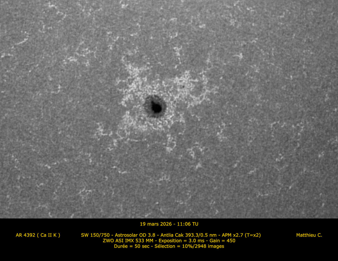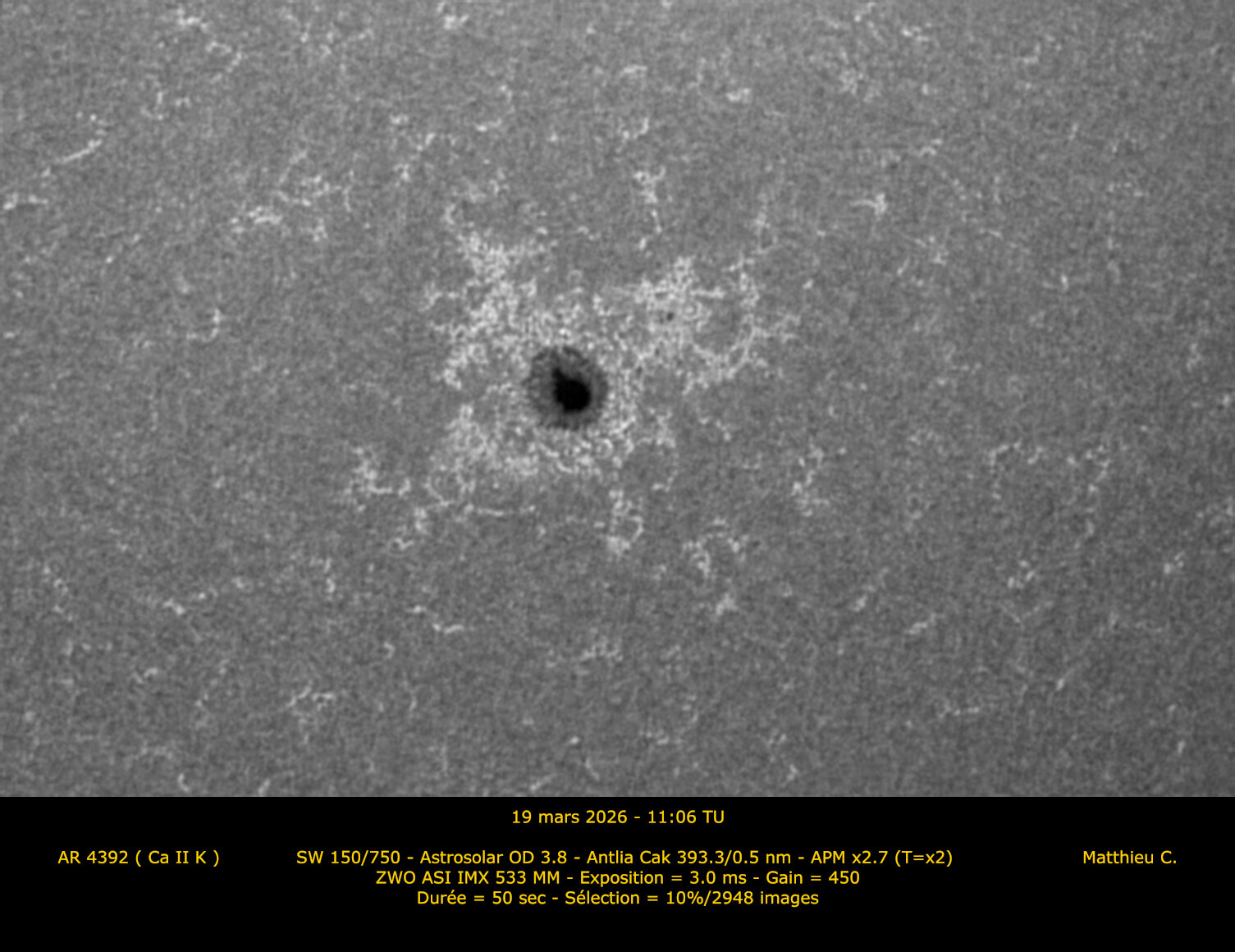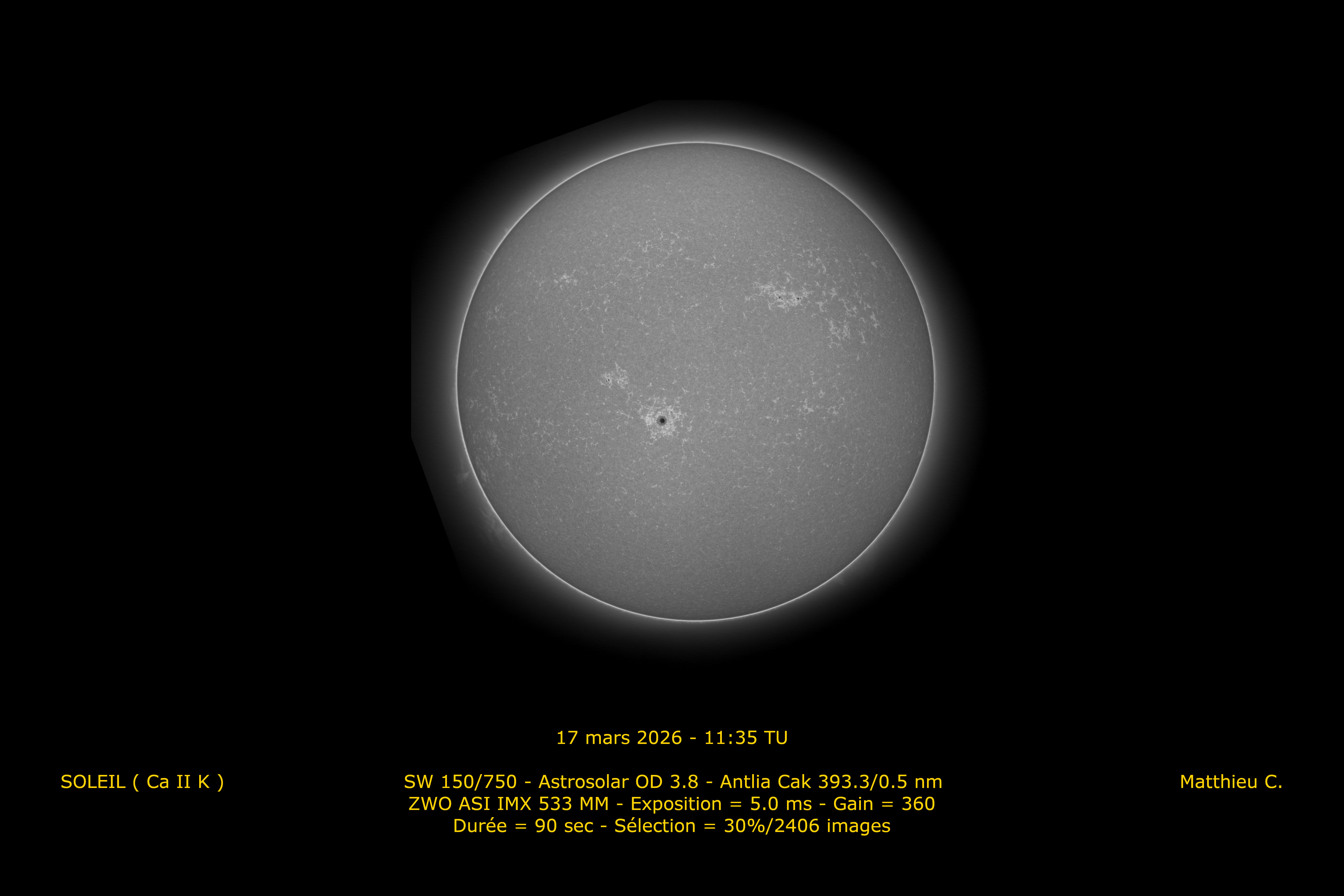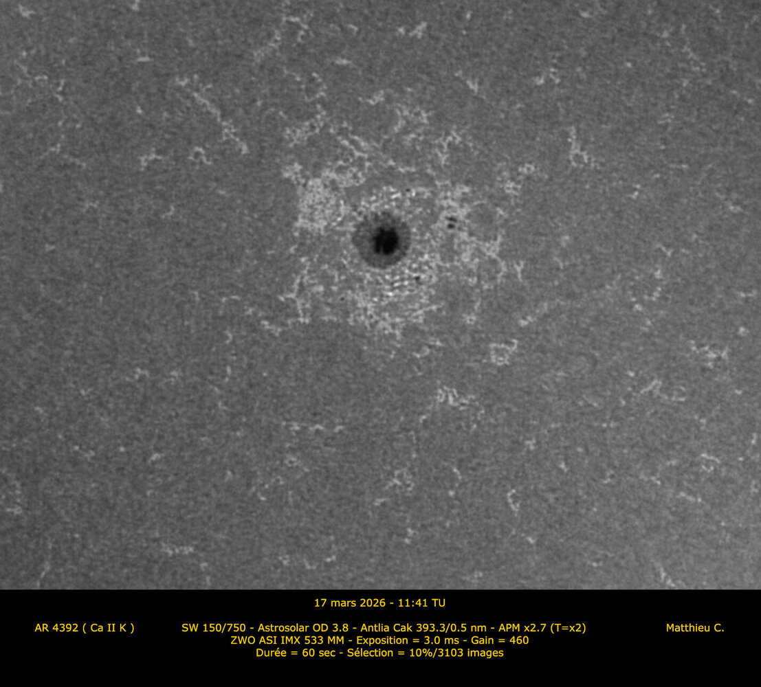2. Bonjour à tous. Après cette époque d'élections, je me permets de mettre un peu en lumière les voies minoritaires du calcium et de la lumière blanche alors que la vague Halpha a largement remporté les appréciations de ce fil ces dernières semaines.
