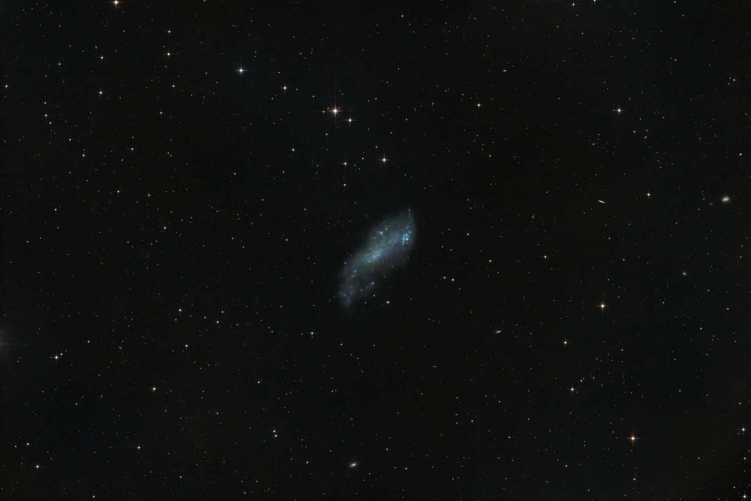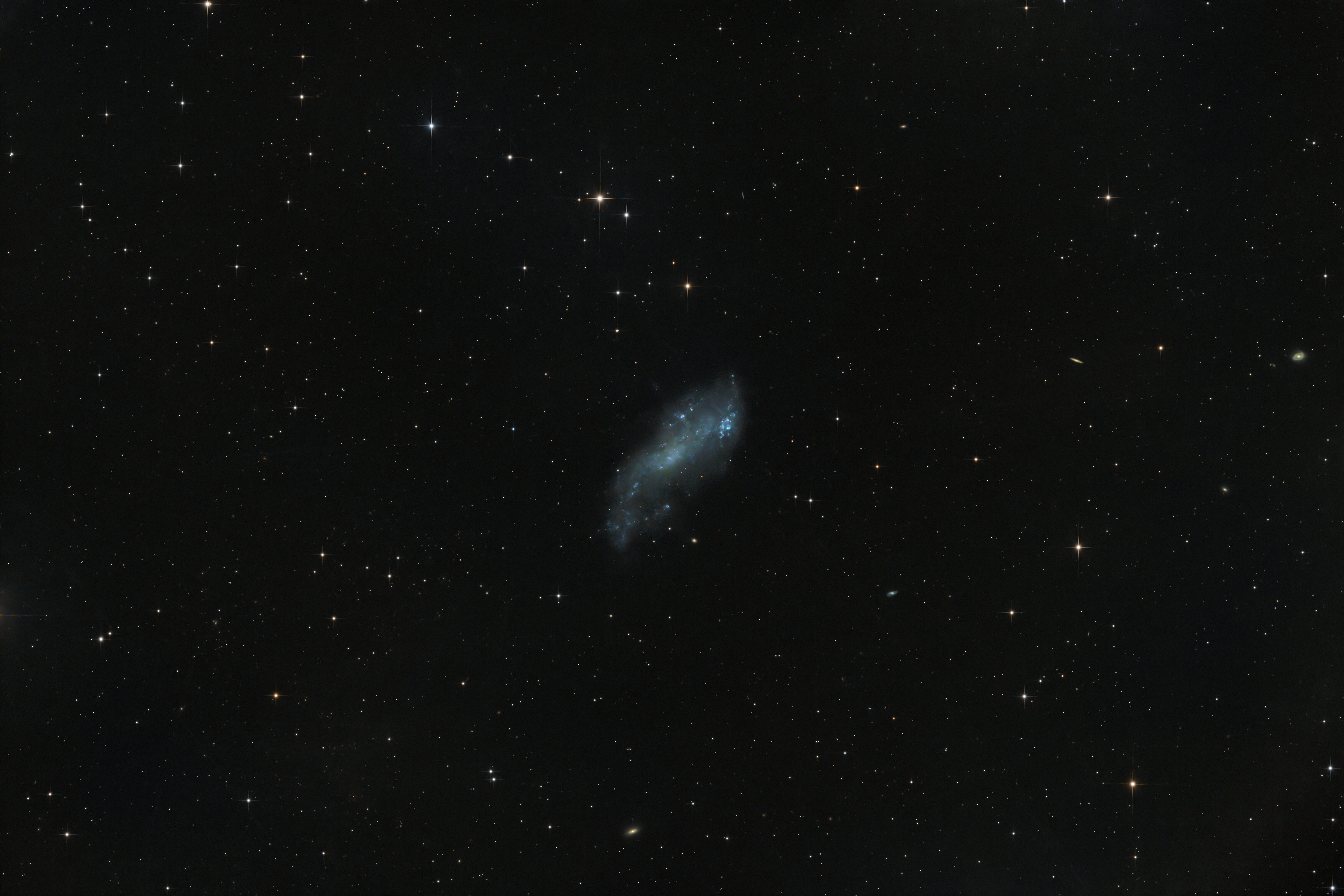 Rapidement ce soir avant l'arrivée des nuages. galaxie naine irrégulière (ou spirale barrée) située dans la constellation de la Grande Ourse, à environ 12 à 13 millions d'années-lumière de la Terre. Découverte en 1898 par l'astronome américain Edwin Coddington, cet objet mesure environ 50 000 années-lumière de diamètre et fait partie du groupe de galaxies M81 Pas de filtre ONTC 200/930mm ASI2600 MC ça manque de poses et de Ha mais je testerai avec l'ANTLIA Triband v2 pour voir ce que ça peut donner.