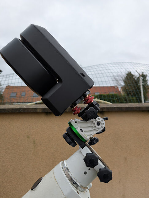 Bonjour Est ce que cette configuration va marcher d'après vous ??? Le Seestar est aligné vers la polaire.Je sais que mon EQ6 a une bonne mise en station.Quand il fera beau je ferai les ajustement à l'aide des vis de réglages du mini wedge. Cette configuration me permet de conserver la mise en station de mon EQ6 ainsi je n'ai plus qu'à fixer le Seestar et son mini wedge sur la platine de fixation de type Vixen. Malheusement avec le temps pourri actuel je n'ai pas pu tester. -