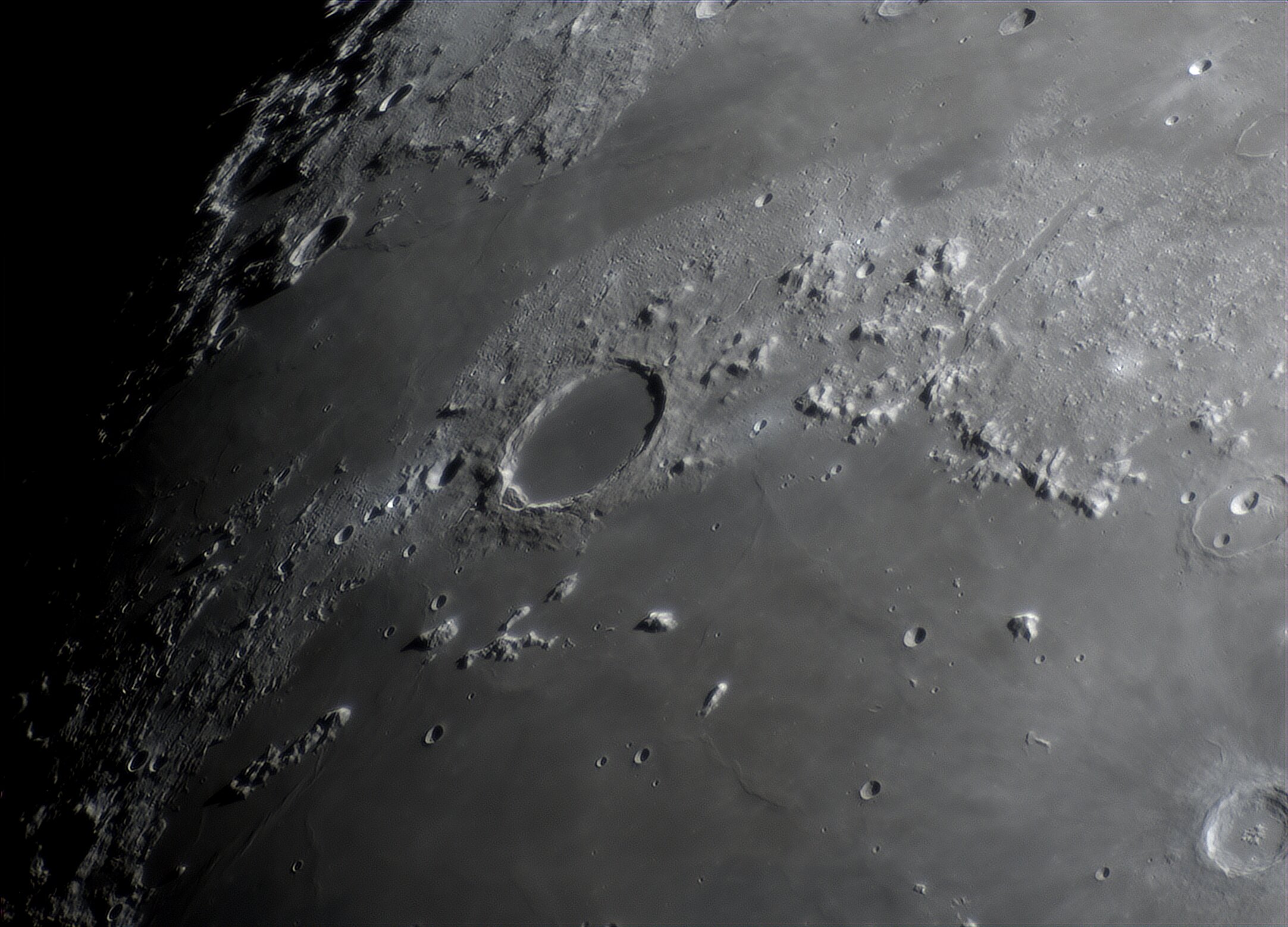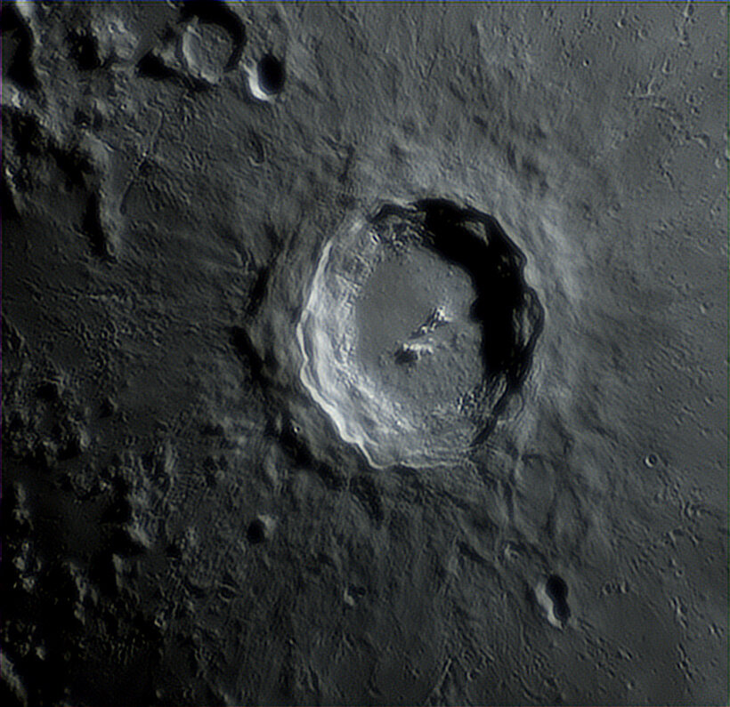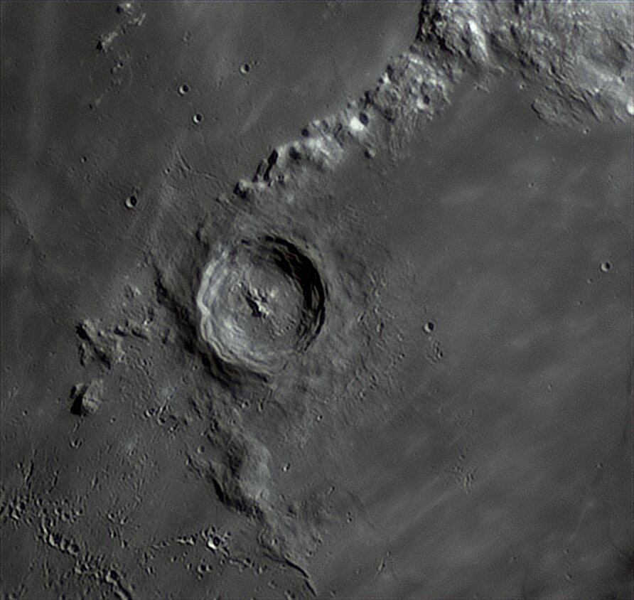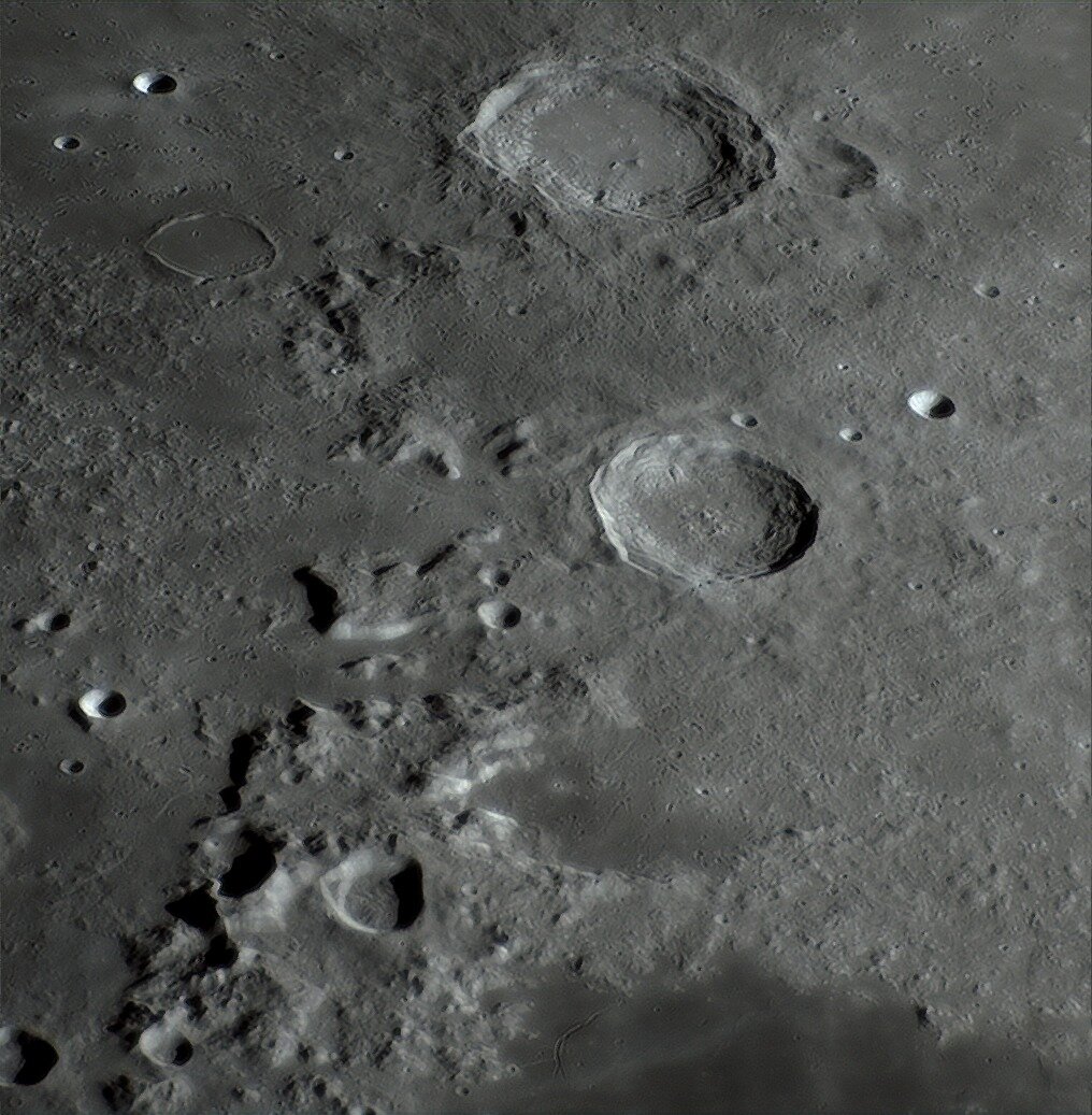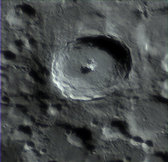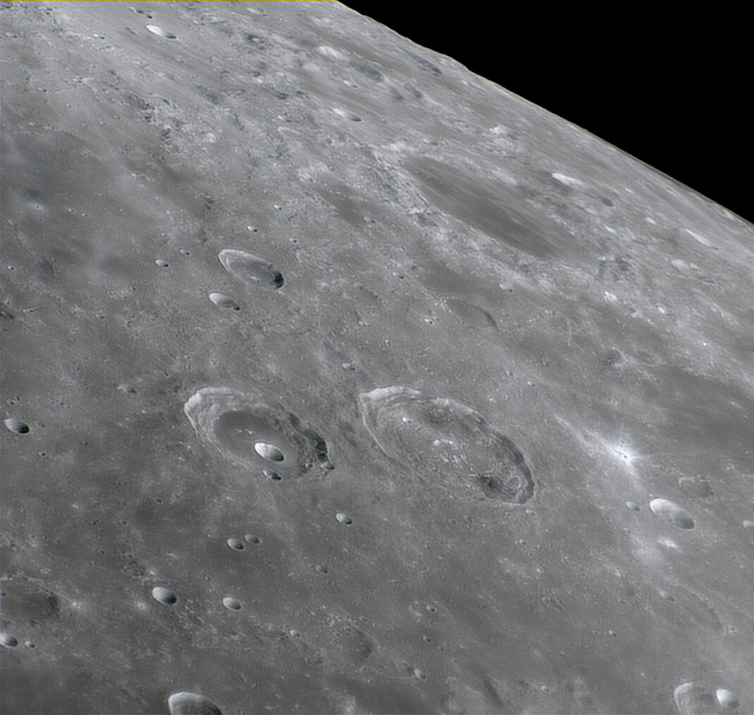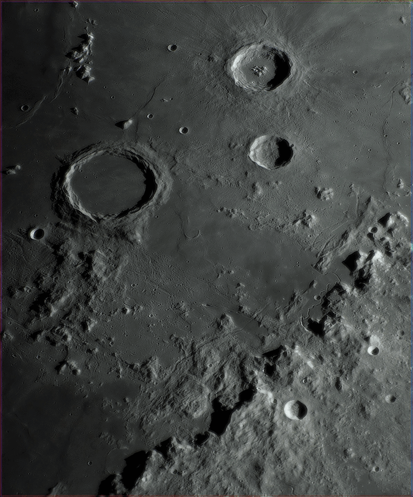 Bonsoir, Je vous propose quelques images au Newton 200/1000, camera ZWO ASI 533C, barlow x3 (x4,xx avec le tirage -> échant. entre 0.175 et 0.178 "/px). Lociciels FireCapture, AS!4, DStation, AstroSurface et Gimp. Bonnes conditions le 25, nettement moins bien le 26 car variables et pas mal de turbulences . Je commence donc par le 26 🙂 Tycho : Eratosthenes : Pitatus (en haut) : Copernicus : Le même comme "vu de face" : Le même en 3D (relief x2 env.) : Clavius : Environs Vallée des Alpes : Images du 25 février Aristoteles et Eudoxus : Hercules : Autour d'Hadley (image gif renseignée) : En version 3D (relief x1,5 env.) : Entre Ptolemaeus et Tycho (mosaïque x1,26) : Bon visionnage A+ GO