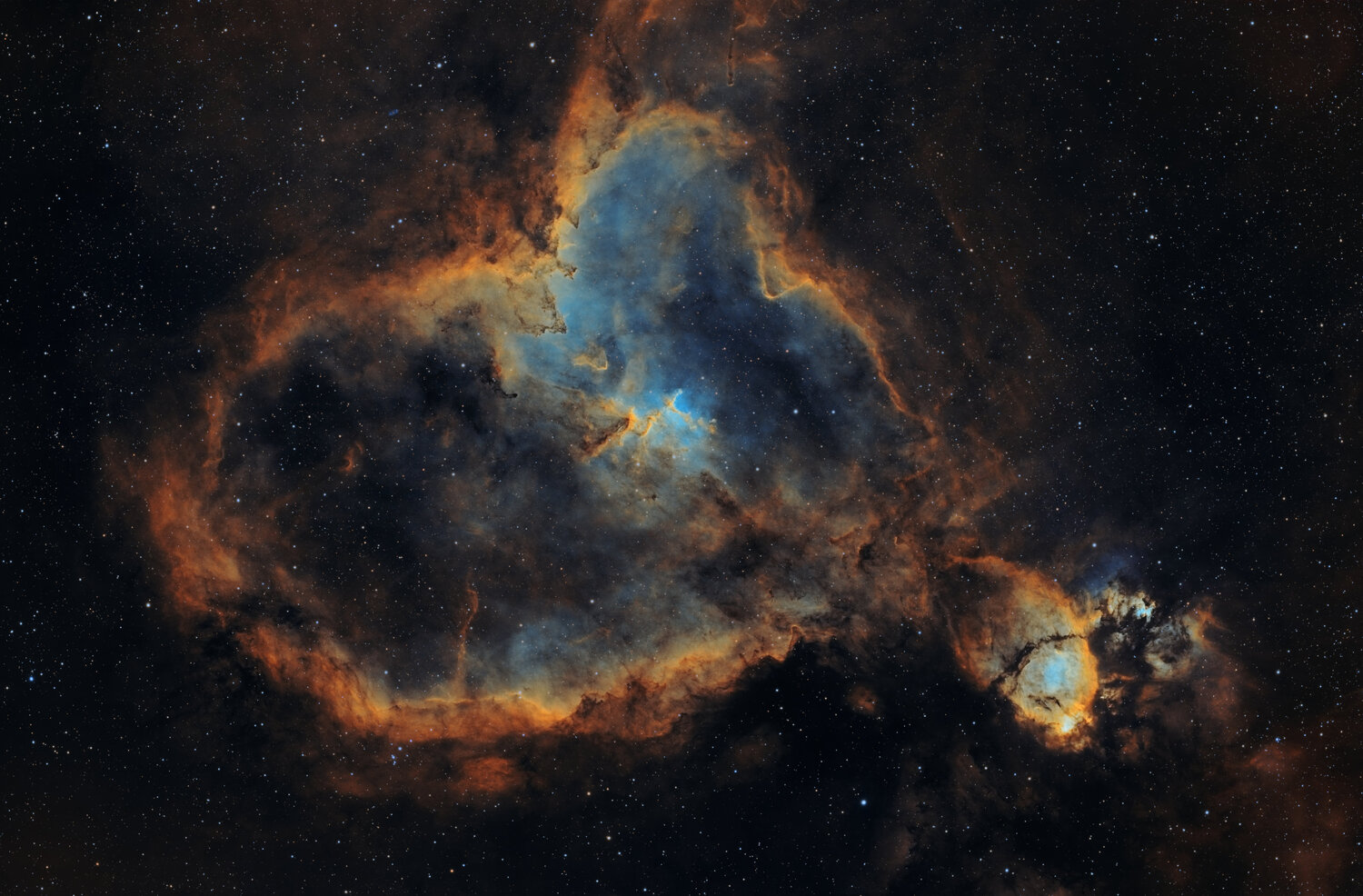 Bonjours à toutes et tous, tous mes vœux 😇 Rien d'original mais voici la nébuleuse du cœur pour une première en SHO avec mes filtres Antlia ALP-T en 3 et 3.5 nm. Les conditions n'étaient pas exceptionnelles mais il fallait absolument que je tente mes premières acquisitions, puis de passer de nombreuses heures a apprendre le process de traitement que cela implique 🙂 En même temps je suis en congé donc j'ai bien passée 2 jours complets avant de sortir cette première image. Je me doute que vous trouverez de nombreux défauts dont je pense des zones un peu cramées en bas vers le poisson. Je compte sur vous pour me faire part de vos remarques ! En vous remerciant. Données d'acquisitions sur les nuits du 27 et 28 décembre : 63x300" en Ha/Oiii 43x300" en SII/Hb 88 Darks 50 Flats 200 Offsets