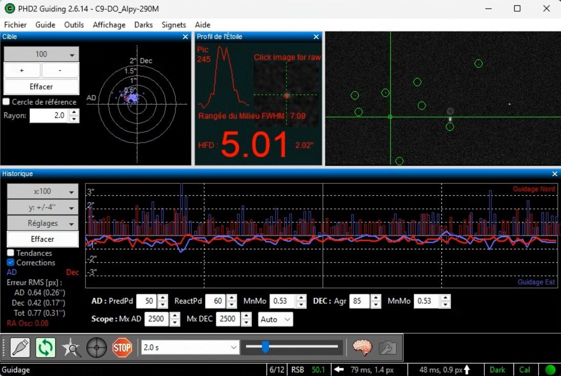 Je ne sais pas et même, je n'en suis pas certain. Attention, je parle d'une MES imparfaite, pas une MES dans les choux et c'est valable quand on guide, pas juste avec le suivi de la monture. J'avais lu il y a un bon moment maintenant qu'il valait mieux une MES légèrement déréglée plutôt qu'une MES parfaite mais comme je n'avais pas compris comment faire ce léger déréglage, je n'ai pas essayé. Pour la compréhension que je m'en suis fait, je compare ça au petit déséquilibre qu'on peut mettre sur l'axe AD avec certaines montures, ça oblige la mécanique à toujours pousser sur les dentures et surtout, ne pas se retrouver dans le jeu (backlash) de la monture. Sur la MES, ça serait la même idée, avoir toujours un peu de retard pour que le guidage donne un ordre de rattrapage plus régulier même si plus important que d'habitude mais toujours dans le même sens. Depuis il y a eu l'algo Predictif PEC et le multi étoiles dans PHD2, ce n'est peut être plus une bonne idée, quoi que.. De mémoire, c'était un post de @olivdeso, Olivier si tu passes par là.. Depuis quelques mois, je suis devenu adepte du jeté de monture sans MES systématique. J'ai des repères sur les 3 dalles sur lesquelles je pose mon setup complet en un coup (j'ai la flemme de le démonter), elle est donc toujours positionnée pratiquement pareil. Mon dernier guidage avec un C9 au foyer (2350 mm de focale) + DO pour une MES qui remonte à au moins 5 sessions (faite au Polemaster qui paraît-il serait moins précis que la méthode de Sharpcap) ça donne ça. C'est une AM5 1ère génération avec trépied en carbone soit disant souple et 13.5 kg dessus. Je vais continuer avec mon trépied mou et avec le jeté de monture.. et désolé, mais la MES au quart de poildefion je n'y crois plus un seul instant. Par contre, la monture, la monture et la monture : oui -