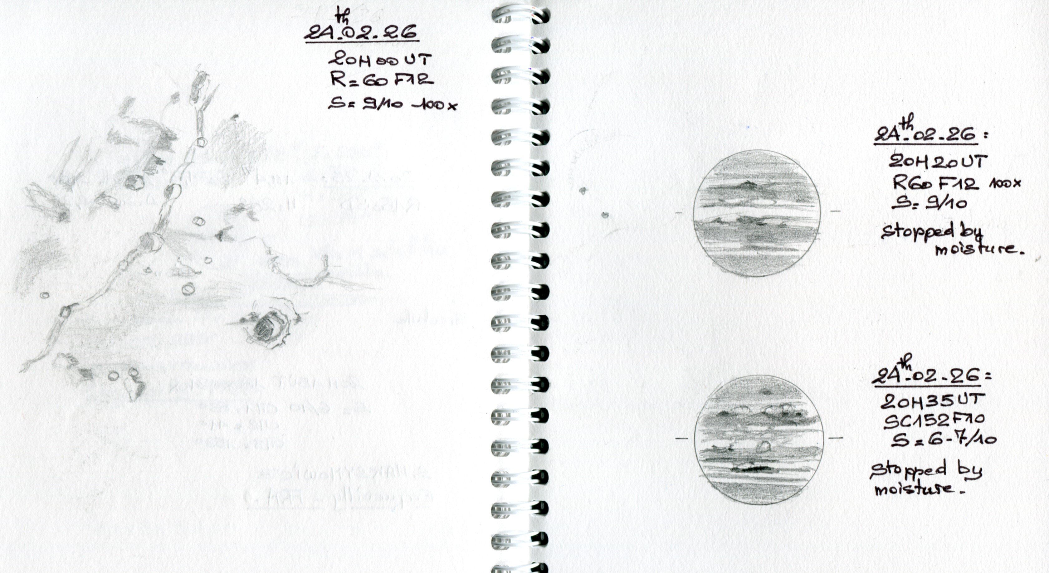 2. Quelques dessins réalisés hier soir sur le tas avec une 60mm F12 et le sc152mm F10 après quelques semaines nuageuses. Pour dérouiller les crayons HB et 2H sur le carnet de dessin. Très bonnes images à la 60 quotées 9/10, 6-7/10 avec le C6. Les objets étaient proches du méridien... La région d'Hyginus-Trisnecker rassemble tout ce qui était accessible à la 60mm sur l'instant et l'observation a été interrompu par...l'humidité et la buée démentielle. Tout comme avec le C6 qui sur jupiter pouvait montrer bien plus de structures fines. Les dessins sont pris à la volée sur le genoux et reproduits ici tel que réalisés brut. Comme dit pour dérouiller les crayons en vue de vénus et mars qui arrivent. Désolé pour le disque circulaire de jupiter, c'est plus facile à pré dessiner. Bons ciels.