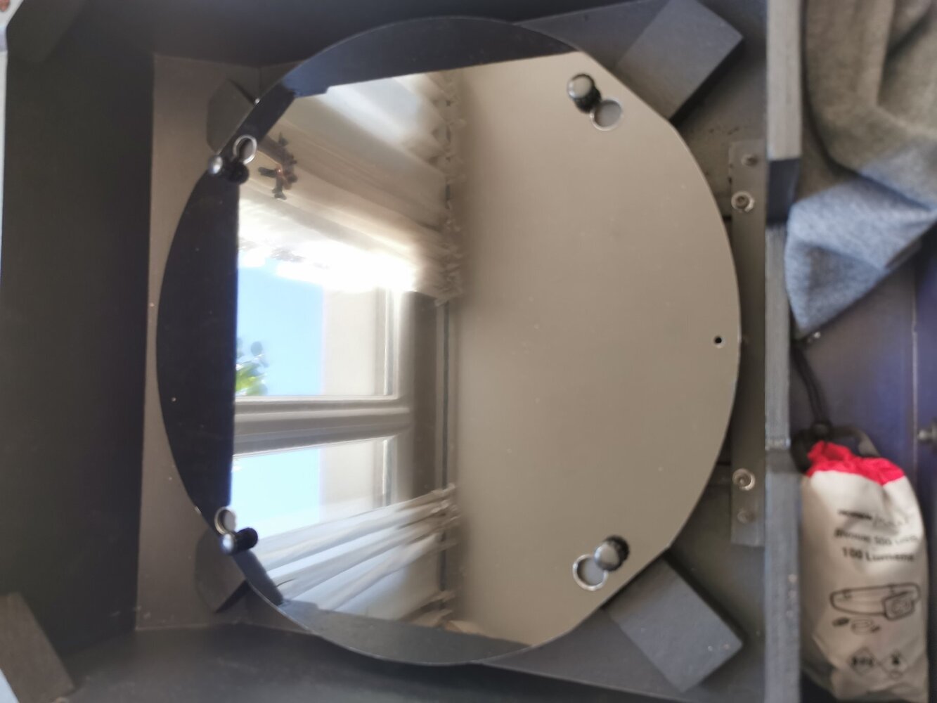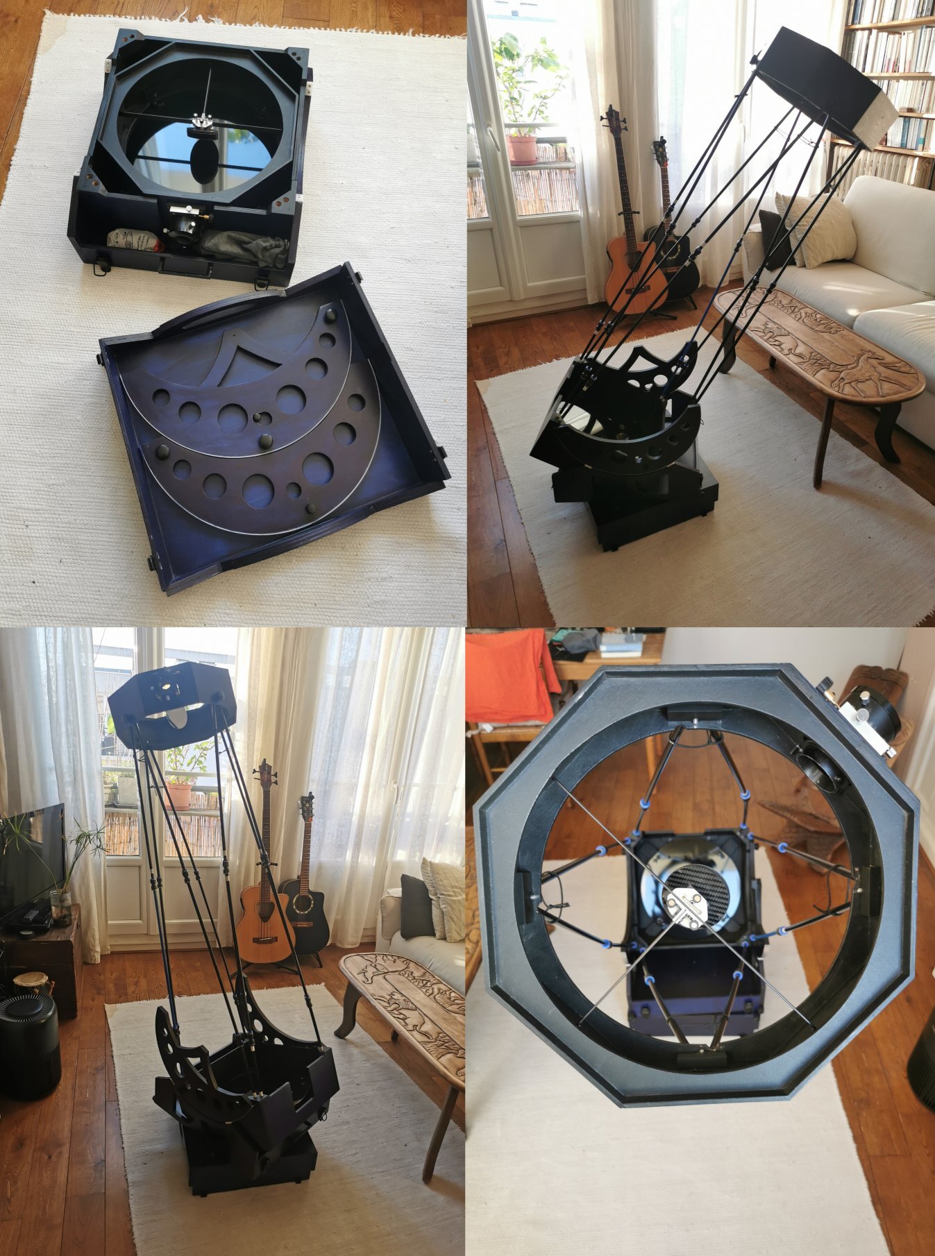 Premier montage Pour l'azimut, j'ai collé un film autocollant pour meuble Venilia et utilisé 3 patins de téflon de 20 mm. Ca colle un peu ! Même un peu beaucoup... Vous auriez une idée ? Ajouter des patins, en mettre des plus grand, sortir un pot de graisse ? Par contre, la hauteur est parfaite, aucun blocage ni point dur ! Les tubes sont assemblés avec la sublime méthode des raccords pneumatiques. Quelle bonne idée d’Anthony Chambon, cité sur le site de Magnitude 78 ! Le capotage est réalisé comme préconisé par Magnitude 78 en dibond avec de très fines lamelles de téflon (j'ai peur du grain de sable). J'ai créé des trous avec des "passages" pour les vis moletées. On place, on tourne un peu et on serre les vis. La cage secondaire hérite de quelques entailles légères pour que les vis moletées passent. La bête (un tube est mal emboité...) La bonne nouvelle, c'est que l'équilibre est très bon avec mes oculaires et un quickfinder ! Après, le plus lourd ne pèse que 380 gramme. Lors de mes essais, pour couper les tubes, j'ai pu remarquer que mon porte oculaire "saccadait" un peu. C'était lié à la gorge qui reçoit la tige de réglage qui, creusée à la fraise dremel, était carré. J'ai déposé un tout petit peu de pâte à bois maison (colle blanche et poudre d'ébène) au fond de cette gorge, monté le tout et attendu le séchage. Maintenant, la gorge épouse parfaitement la tige et ce porte oculaire est très confortable. je m'attendait à une map un peu folklorique mais pas du tout. Le mouvement est très doux et les étoiles restent en place même à fort grossissement 😉 Le machin pèse 14,4 kg sans les tubes, ni les oculaires. Il me reste à fabriquer une jupe, un chapeau clac (mais là je galère à trouver des T en 2mm) et... une table équatoriale ! Accessoirement à espérer un temps plus clément 😂 Encore MERCI aux concepteurs de ce magnifique instrument et à leur partage, à ceux qui accompagnent encore et toujours leur construction et à tous les constructeurs qui ont eu la gentillesse de publier leur réussites, galères et astuces ! (smartphone à l'arrache)
