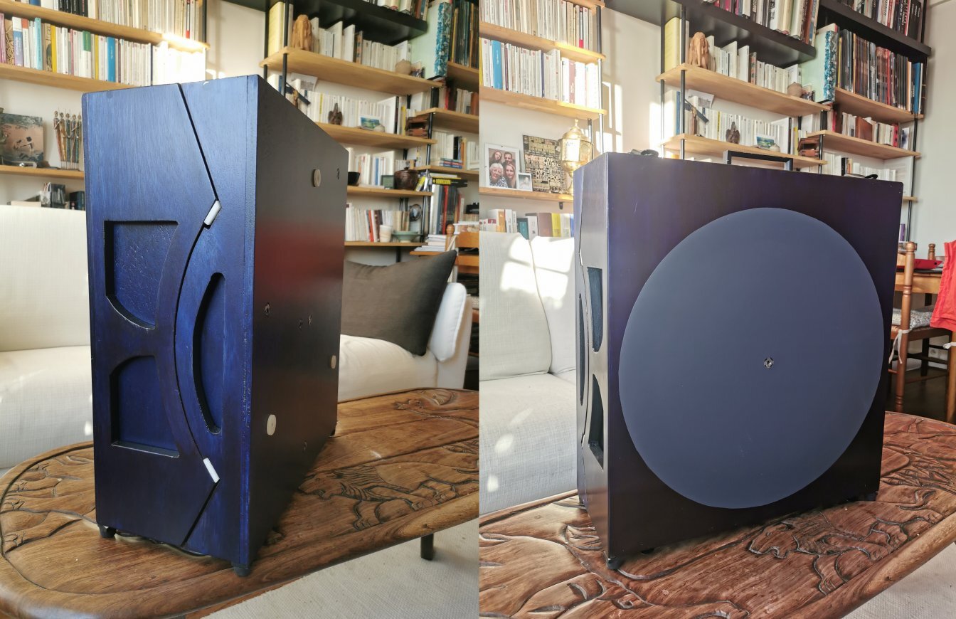 La valise Le rocker est tracé, découpé, collé et vissé. Les patins sont bricolés dans une plaque de téflon. J'ai tout installé dedans et poser le "couvercle" du socle dessus, sans les cotés, pour placer les tourillons. Là encore, ça passe, mais ça passe vraiment tout juste 😅