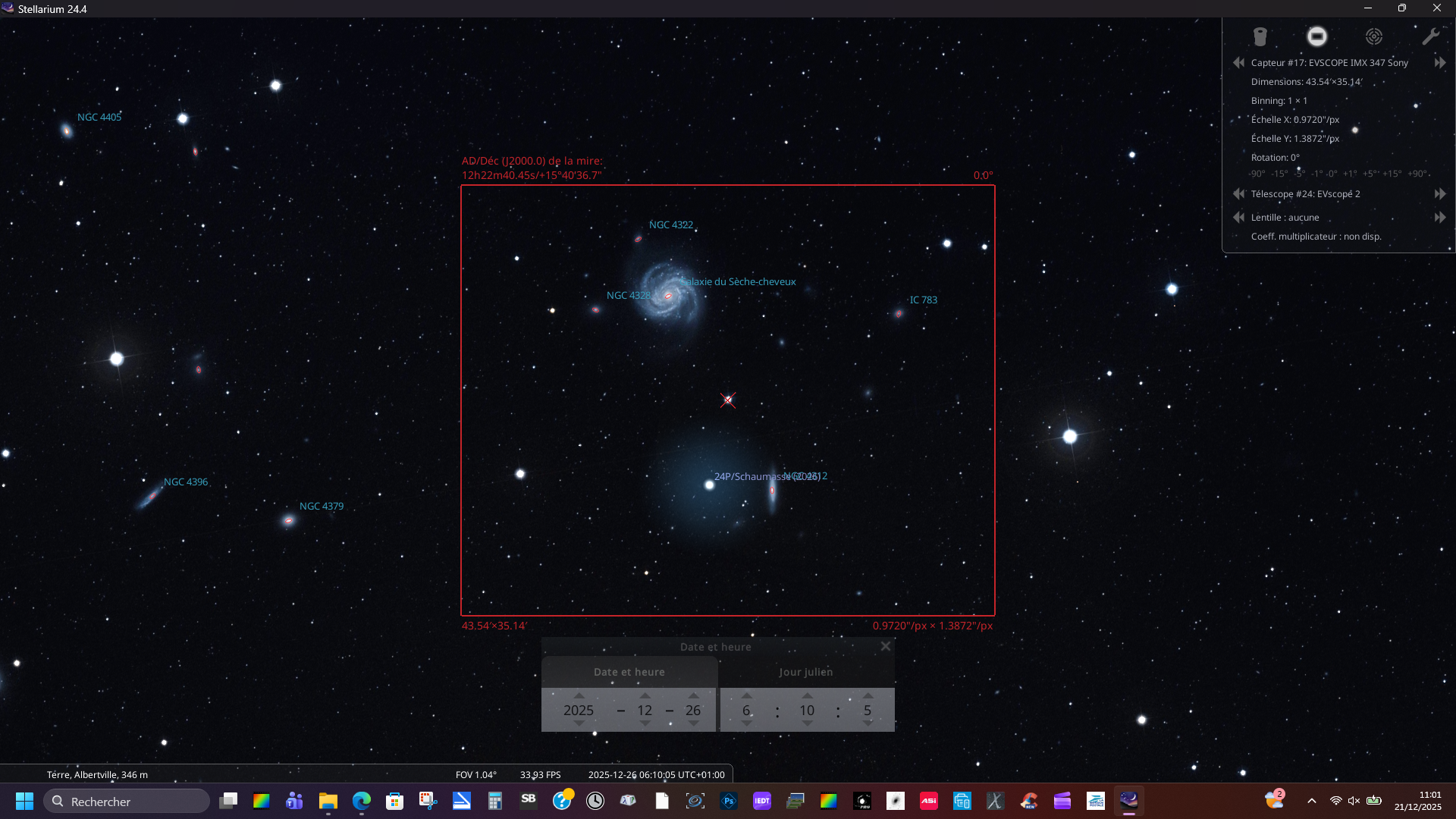 Salut Avis aux lève-tôt (ou aux couche-tard 😉) : le matin du 26 décembre 2025 la comète 24P/Schaumasse et la galaxie M100 seront dans le même champ avec un eVscope. Simulation Stellarium: Ce n'est pas une comète très spectaculaire, mais M100 en compagnie d'une comète ça n'arrive pas souvent et ça peut faire une belle capture... Eléments orbitaux de 24P/Schaumasse: https://astro.vanbuitenen.nl/comet/24 😉
