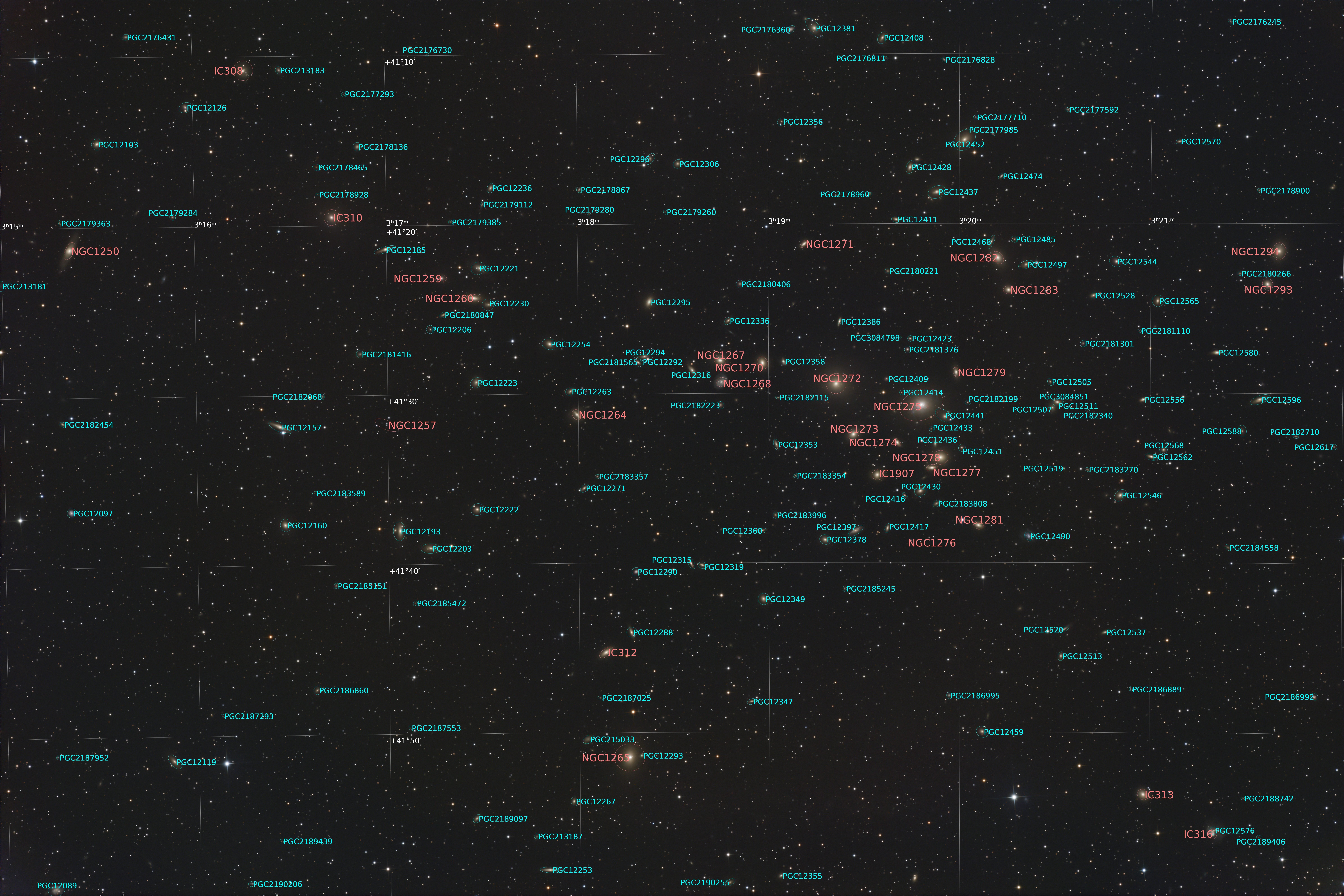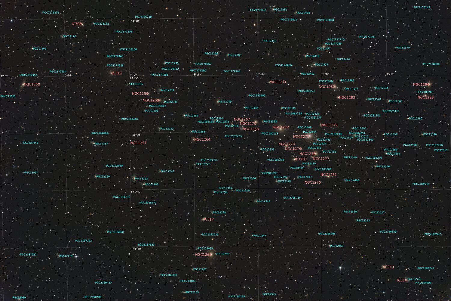 Salut, toute fraiche de cette nuit en première partie, un groupe que j'affectionne particulièrement: NGC 1275 et cousines dans Persée. J'ai pris 40 poses de 240Sec avec l'ASI6200MC sur un T 350 F4.6. La nuit aura été très productive puisque j'ai pu faire: groupe de NGC1275 NGC2174 NGC2500 NGC2770 avant d'être arrêté sur le coup de 5H par le brouillard. Mais là, je suis au max de ma productivité avec 4 cibles en une nuit. Avec la lune qui commence à être très génante, je pense que je vais refermer l'observatoire. Bref, place aux images; NGC1275 montre de beaux détails et son jet Ha: la full: la version starless avec toutes les tâchouilles: la version annotée: je l'avais faite au C14 en 2010 et la progression est manifeste: A vos commentaires a+ Serge