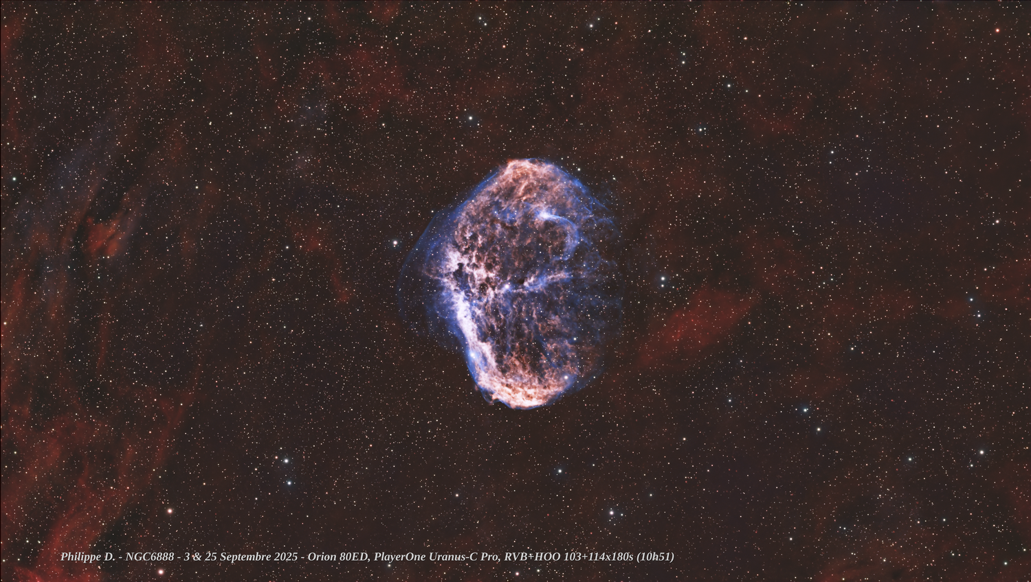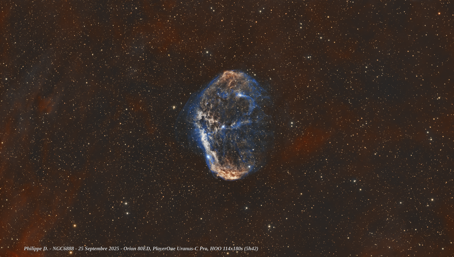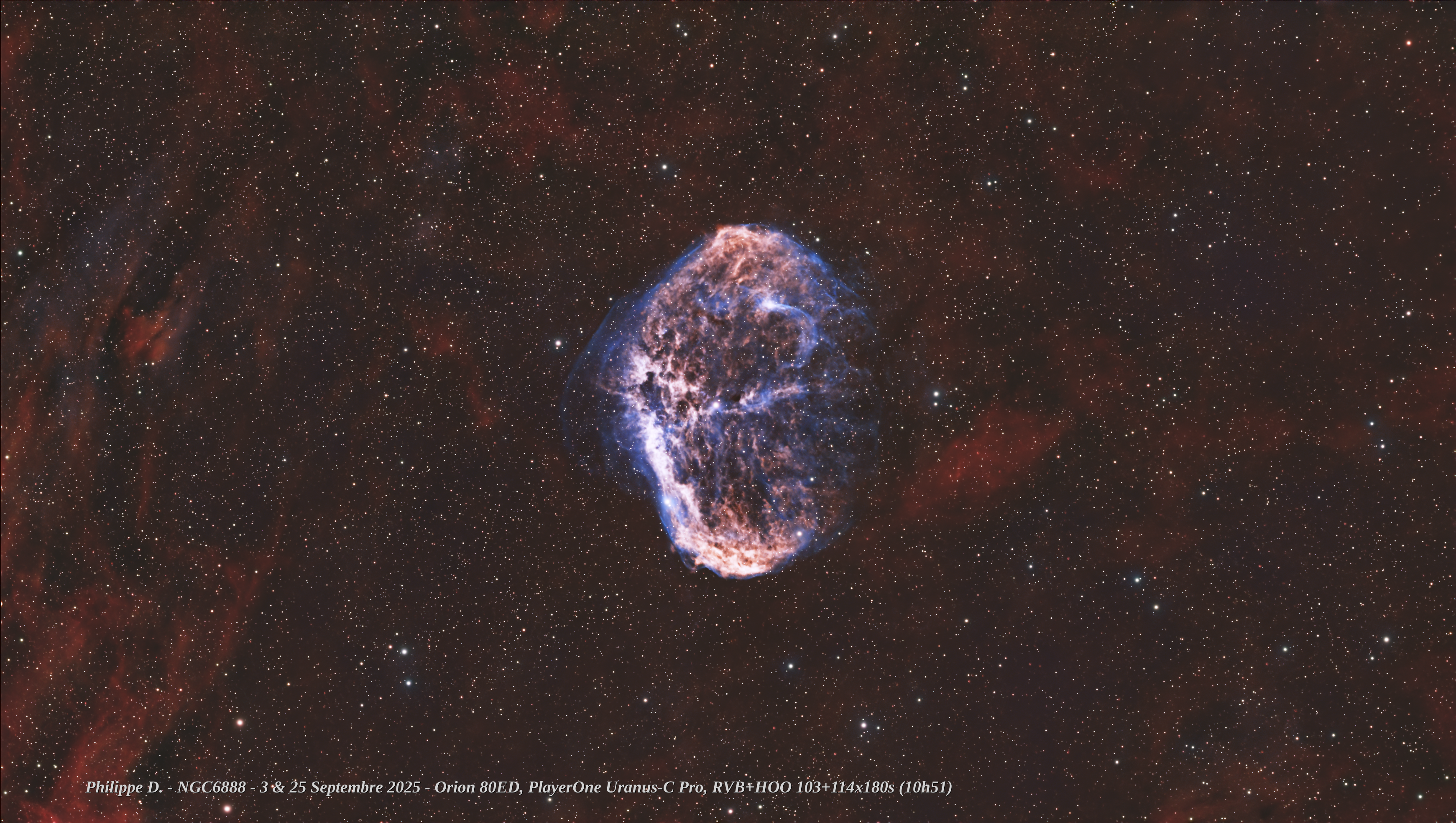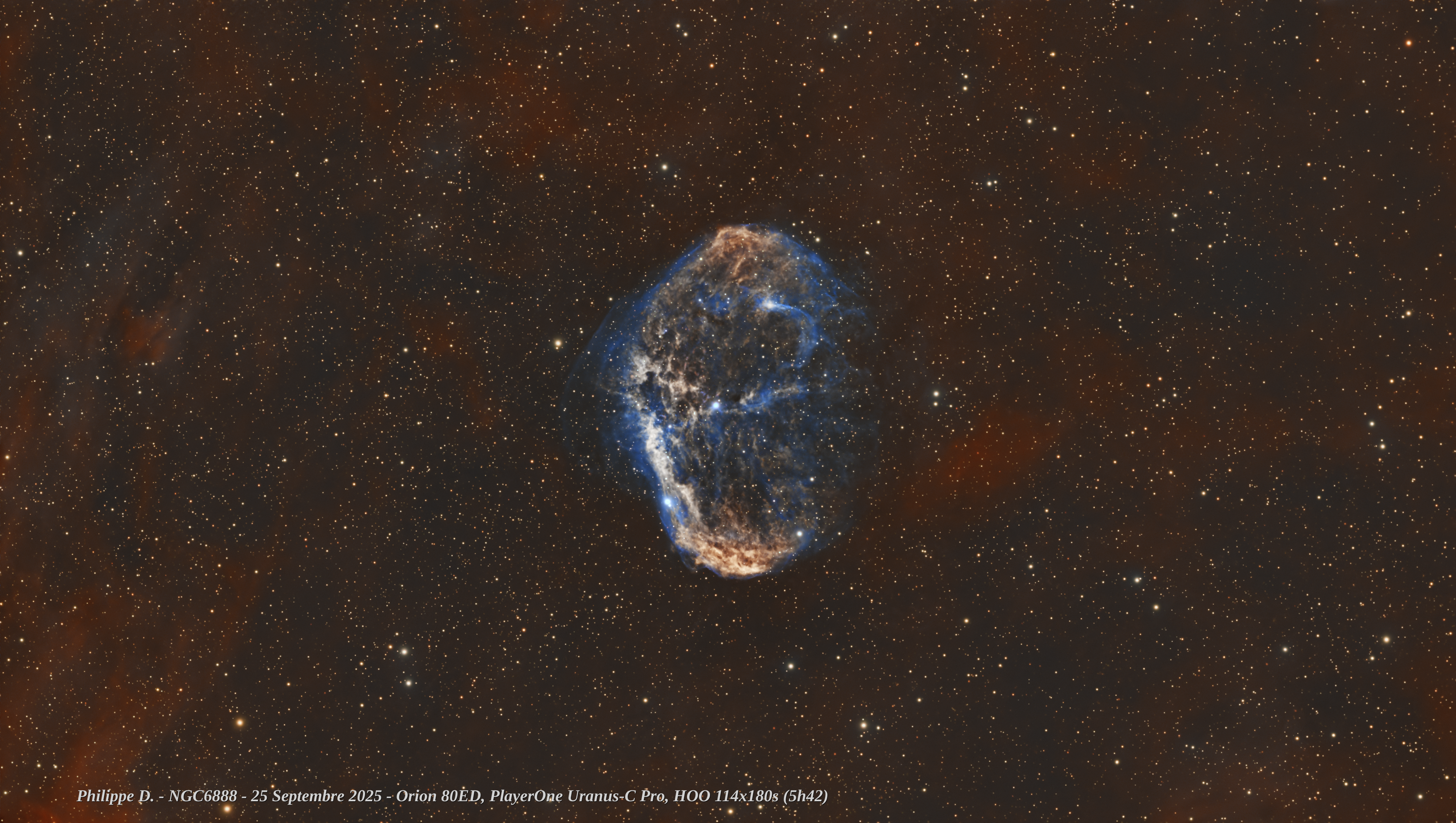 Hello, Dans le lot de l'an dernier retrouvé, j'ai tenté de sortir NGC6888 sur laquelle j'ai normalement pas mal de signal en couleur IRCut et en HaOIII Mais la je sais pas, je n'y arrive pas, j'ai l'impression que je fais fausse route Pris avec l'Orion 80ED & l'Uranus C Pro 114 poses en HaOII 103 poses en IRCut Sur l'IRcut: Graxpert background, Solve, SPCC, BlurX/NoiseX, histo, starnet un peu de curve puis HDRmt et petit boost Colorsaturation puis pixelmath pour etoiles Sur le HOO: Graxpert background, Blur/Noise, histo, starnet, curve, HDRmt, Narrowband norm avec boost OIII, yellow mask/curve red/green, CieL/colorsaturation et pixelmath etoiles pour les 2 StarAlign (dans les process precedents) et CombineRGBNarrowband, un peu de curve Ca ressemble plus a Ironman qu'a une nebuleuse... Comment la traitez vous? Merci! Philippe IRcut: HOO: RGC+HOO: -