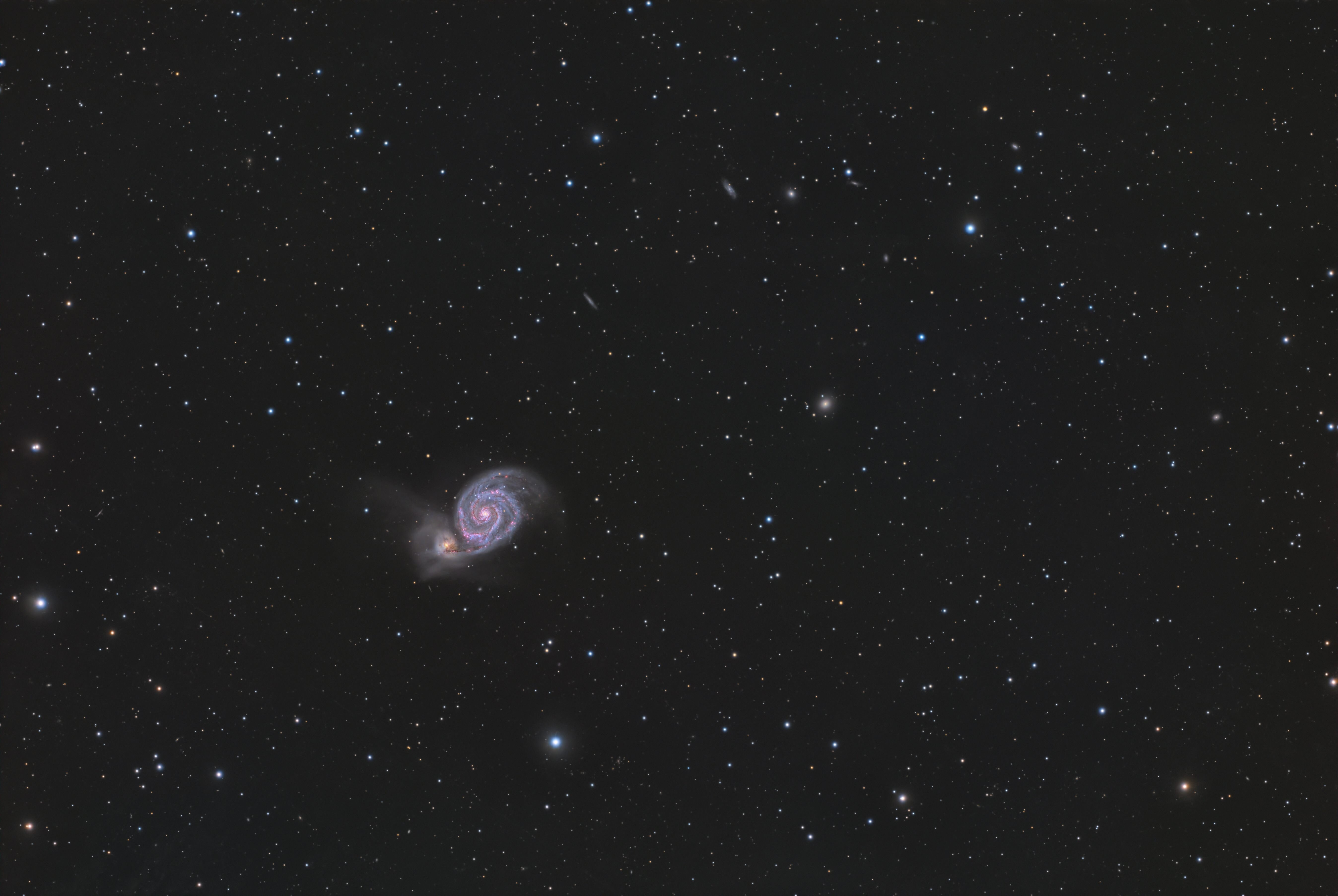 Hello, voici une modeste M51 shootée ces derniers jours, avec une première passe à peu près au moment de la pleine lune en LHaRGB avec un ajout de L supplémentaire hier soir pour augmenter un peu le signal (et sans lune). Sur ma première nuit il y a eu un couac après le retournement au méridien et les poses en L se sont mal recalées j'ai donc une petite perte de signal sur une partie du fond de ciel mais je trouve que ça passe. J'ai sollicité un peu votre aide pour y voir plus clair car je n'ai pas encore fait beaucoup de Ha jusque là (j'ai un filtre depuis). Depuis j'ai bien révisé et je pense que pour les galaxies c'est bon. Je suis donc assez content du résultat même si le signal n'est pas non plus dingue. Ce couple galactique est un grand classqieu mais on a quand même de la chance qu'il soit assez proche de chez nous et visible avec le bon angle ! Altair 183M mono non refroidie + Skywatcher 72ED sur HEQ5, NINA, PHD2, Pixinsight L : 48x5mn soit 4h Ha : 24x5mn soit 2h R : 9x5mn soit 45mn G : 9x5mn soit 45mn B : 9x5mn soit 45mn Total : 8h15 Le lien Astrobin : https://app.astrobin.com/i/5aytvc