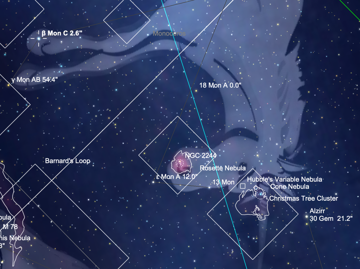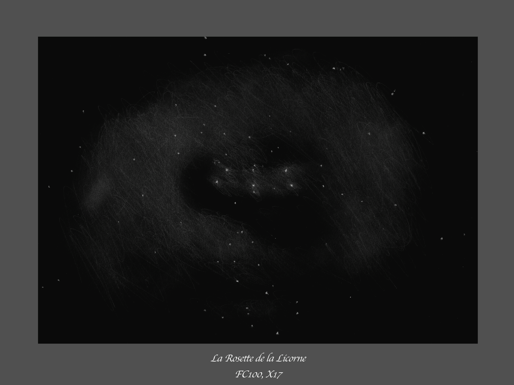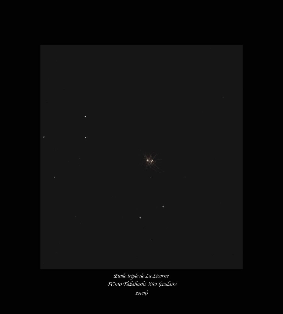 LA ROSETTE ET L'ÉTOILE BETA. Bonjour à tous, Compliqué en ce moment la météo : la saison pluvieuse bat son plein et il faut souvent patienter tard pour voir le ciel se dégager de tous ses nuages orageux de la journée si chaude ! La météo de l'hexagone n'est pas top non plus d'après les nouvelles ! Hier soir, j'ai quand même pu installer ma petite FC100 pour contempler la belle Rosette à très faible grossissement au Nagler 31mm muni d'un filtre afin de faire ressortir les nébulosités. C'est délicat : on se perd en fait dans les différentes zones brumeuses. Ce n'est guère aussi tranché que pour M42 ! Au final eh bien je trouve mon dessin bizarre...Je le mets en ligne mais bof bof je le reconnais et puis j'avais surtout envie de griffonner ! D'ailleurs le positionnement des étoiles (de l'amas notammen) est franchement perfectible ! En fait, j'ai mal "démarré" si j'ose ainsi m'exprimer ! Voici la carte pour repérer à la fois la Rosette et cette sublime petite étoile triple : Beta Monocerotis. Eh puis, ben, le dessin de la Rosette... Je vous avais dit : elle a une drôle de tête ma rosette ! Je suis davantage satisfait de ma Beta Monocerotis en revanche ! L'étoile se résout en trois éléments à partir de 70X environ. On devine disons quelque chose. L'effet est garanti avec un oculaire zoom ! On accentue peu à peu le grossissement et on voir paraître une étoile tout proche du compagnon de la principale. Superbe observation à faire ! Bon ciel à tous ! Peut-être une nouvelle veillée ce soir si la fatigue me l'autorise ! Gildas Oups j'allais oublier : la double éclipse jovienne ! Oh là là, trop beau ! Pas de dessin mais une belle contemplation passive en fin de veillée !