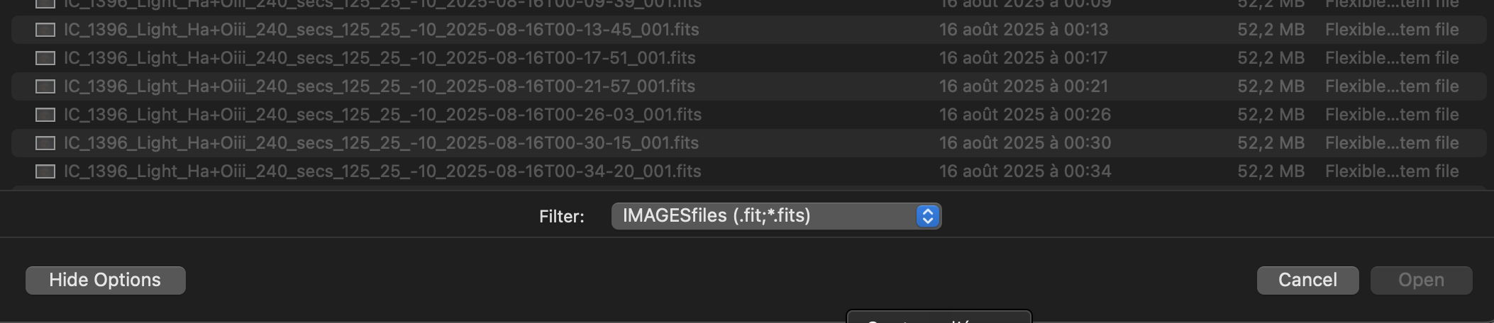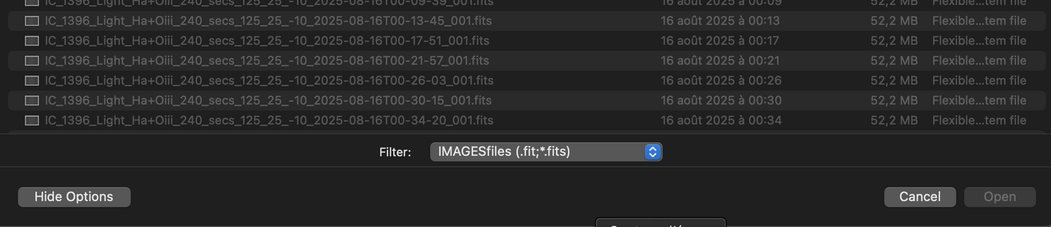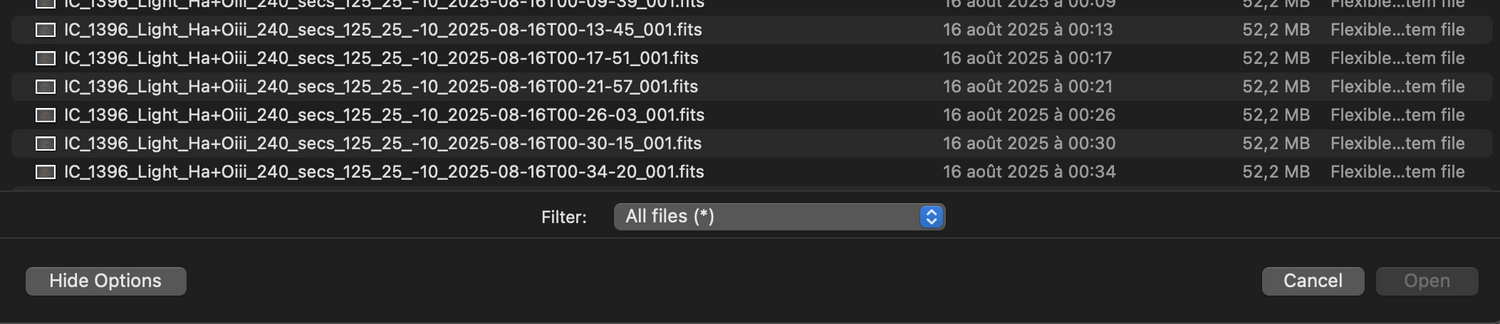 2. Effectivement, je n'ai le problème qu'avec les anciens fichiers projets. D'ailleurs en créant un nouveau projet et en tentant d'ajouter des fichiers j'ai eu un nouveau soucis, voir mon post précedent que j'ai édité (pile au moment où tu postait une réponse..) EDIT: j'ai fait un nouveau projet avec 2 couchers HaOiii et SiiOiii Lors du traitement de la couche HaOiii cela génère au final une image composition HOO via la commande suivante: # HOO compositing rgbcomp ../cHaO3_Ha ../cHaO3_O3 ../cHaO3_O3 -out=../../../final_HaO3_O3_HOO Mais lors du traitement de la couche SiiOiii, la composition est notée HOO au lieu de SOO Si on sait que l'on traite la couche cS2O3 ne serait il pas plus judicieux de nommer cela composition SOO et de générer un fichier nommé SOO ? # HOO compositing rgbcomp ../cS2O3_S2 ../cS2O3_O3 ../cS2O3_O3 -out=../../../final_S2O3_O3_HOO Cordialement