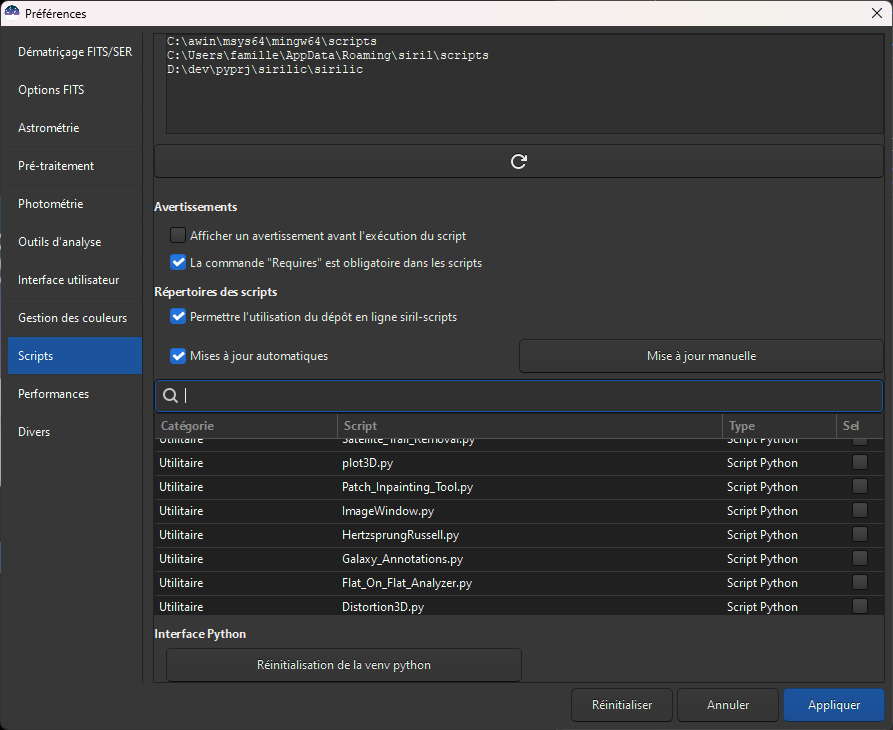 peux-tu remplacer la ligne 40 ( 's.ensure_installed' ) dans sirilic.py par : s.ensure_installed("ttkthemes","tkinter-tooltip","ttkSimpleDialog", "tkinterdnd2", "numpy") et ensuite ré-initialiser la venv python ( bouton en bas des préférences de script) et puis lancer sirilic