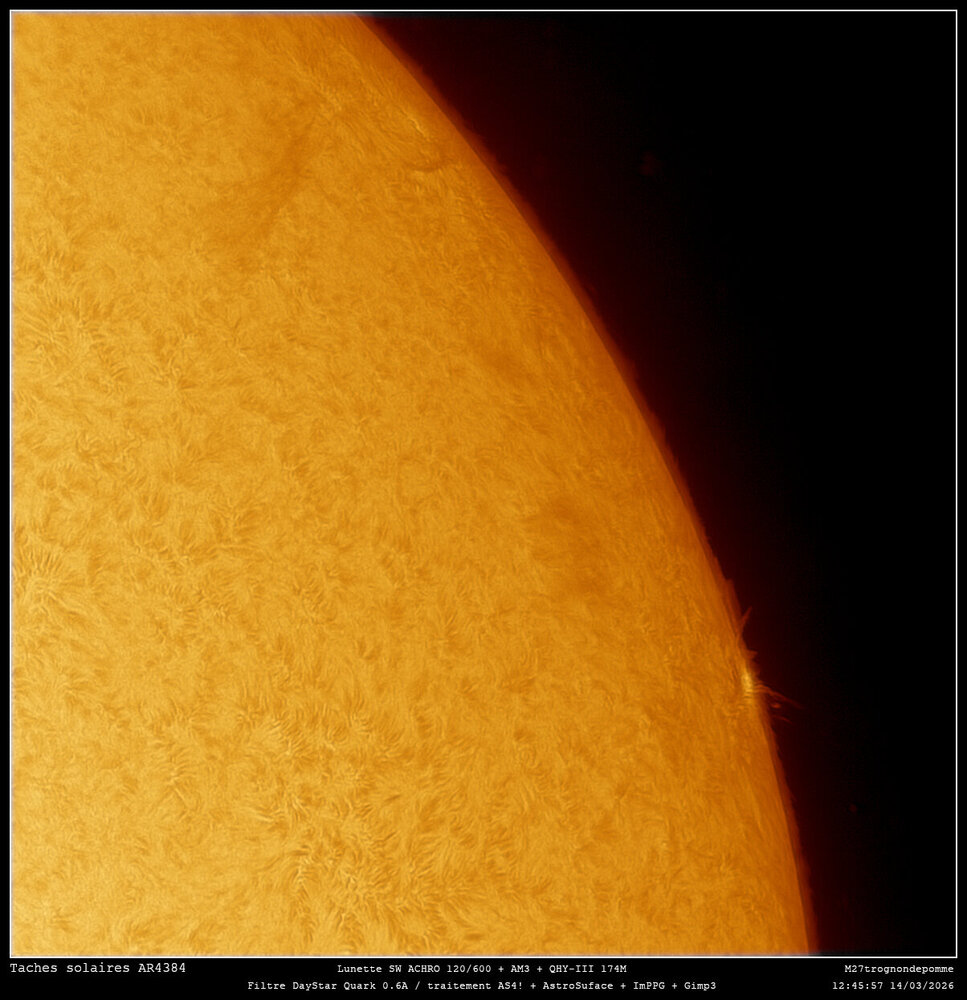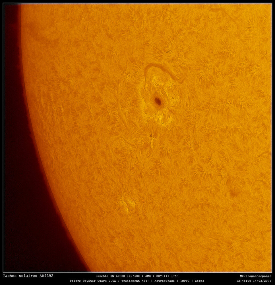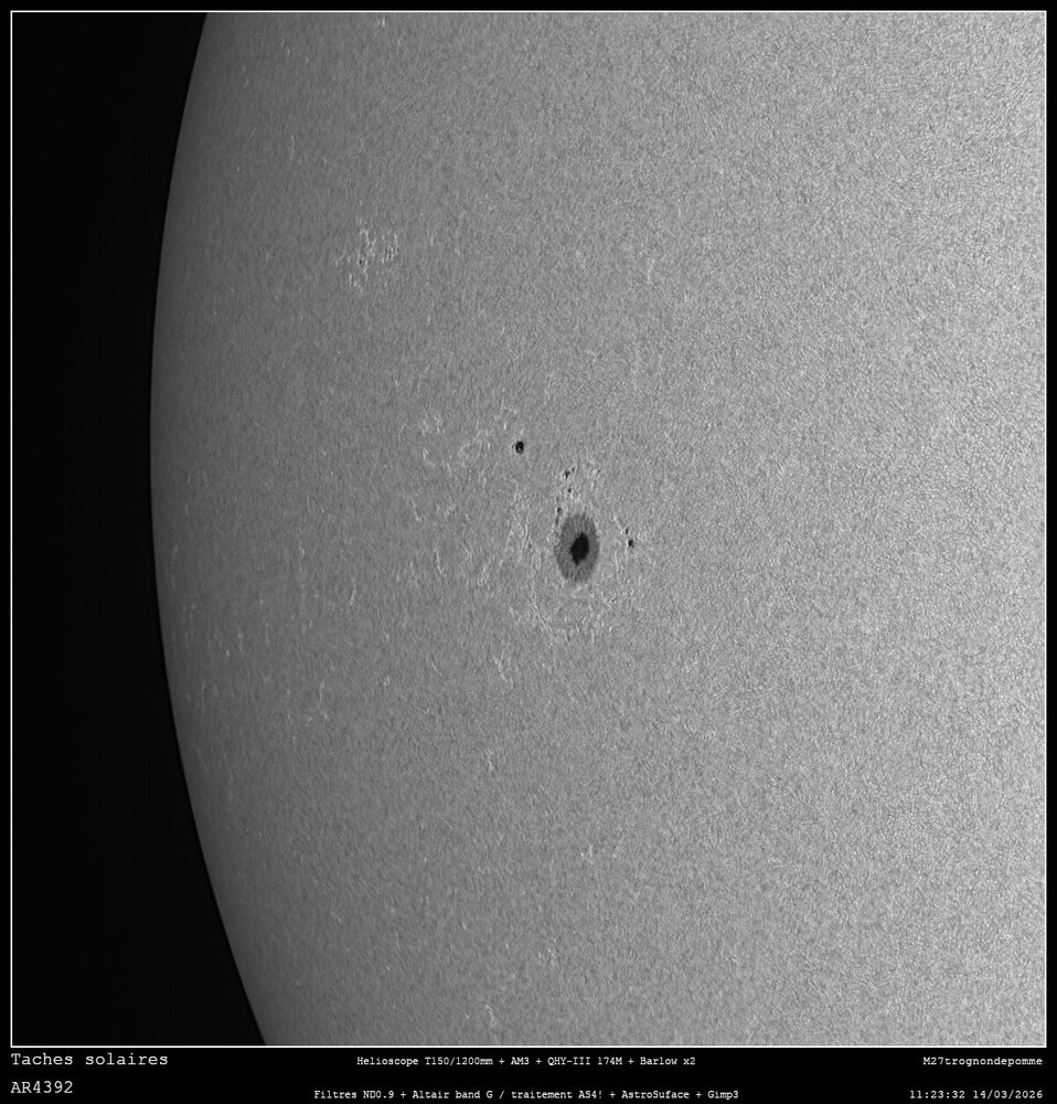 3. Après une pause de 2 mois pour cause de nuages et de pluie les week-ends, j'ai enfin ressorti la lunette mais un peu tardivement: J'ai du slalomé entre les nuages . J'ai pris la tache AR4392 en lumière blanche avec un filtre Altair Band G : Puis, j'ai fait du Ha sur cette même tache : Et pour finir, j'ai imagé la tache AR4384 sur le limbe solaire.