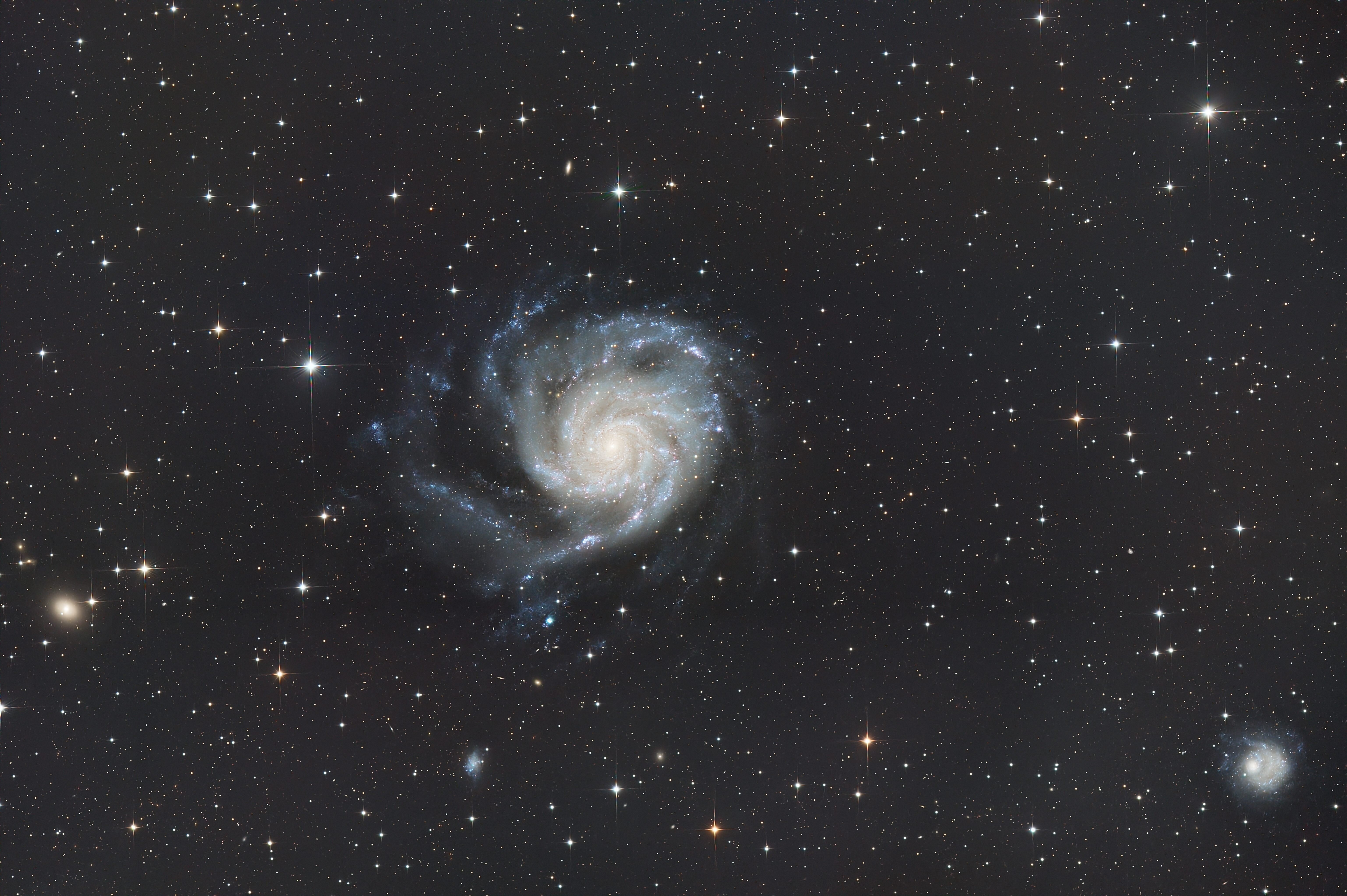 bonjour a tous . toujours en phase d'adaptation avec la cam mono , j'ai refais M 101 en LRGB . malgres un ptit soucis de suivi apres le retournement au méridien , j' ai cumulé presque 5h de poses avec la CEM70 qui a tourné en moyenne entre 0.5 et 0.6 de RMS ( tres content du resultat ) 30x 120s pour chaque filtre RGB 50x 180s pour la luminance newton SW 250 F4 carbone camera touptek ATR 2600 M guidage au diviseur optique avec cam playerone ceres m ioptron CEM 70 traitement avec pix traitement un peu trop agressif a mon gout , le coeur est un peu cramé -