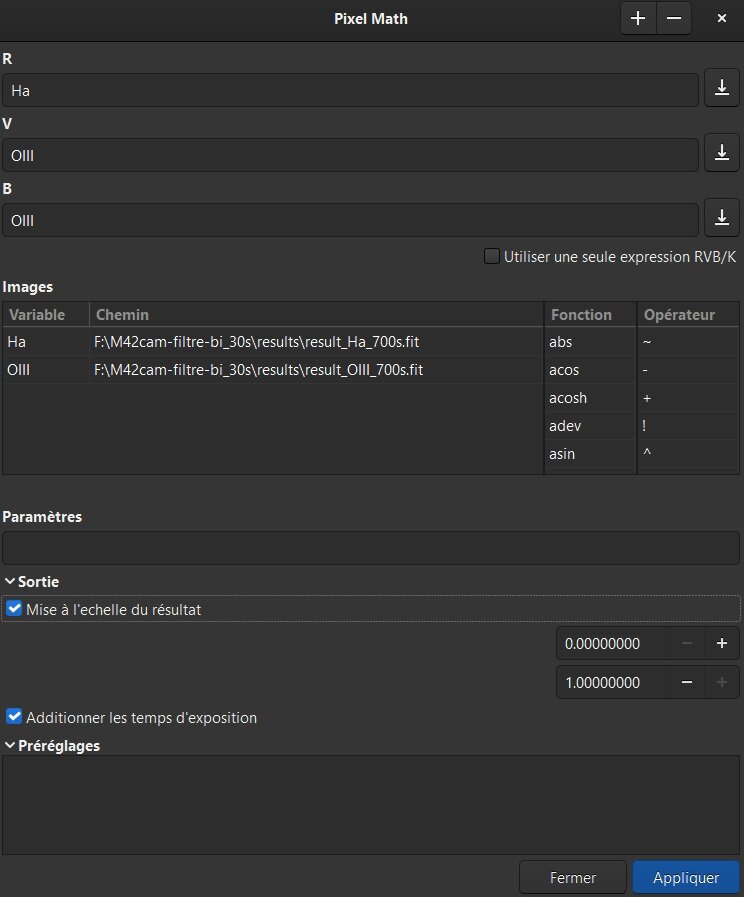Bonjour. Premièrement, je ne crois pas ce soit judicieux de faire M42 avec un filtre dualband Ha/OIII. Tu as séparé les 2 couches Ha et OIII dans Siril, mais à quel moment du traitement ? As tu juste calibré tes images puis séparé le couches ? De mémoire, ce script calibre puis sépare, aligne et stack les Ha et OIII séparément. Il faut donc "construire" ton image RVB à partir de là. OIII sert à V et B. - soit avec Pixelmath : tu importes ton fichier Ha et OIII (le + en haut), tu décoches "utiliser une seule expression" puis tu mets ton fichier Ha (le nom) dans R, et le fichier OIII dans V et B. L'intérêt est que tu peux jouer sur les 3 fichiers en modifiant leur proportion - soit Composition, composition RVB puis tu mets le fichier HA dans (aucun) du rouge et le OIII dans les 2 autres Perso, je ne me sers jamais de ce script. Une fois calibrées mes lights, je fait une extraction sur chaque fichier, je traite les Ha (extraction gradient, alignement, empilement, drizzle x2), idem pour les OIII (drizzlex1), et après je passe chez PixInsight 😁 -