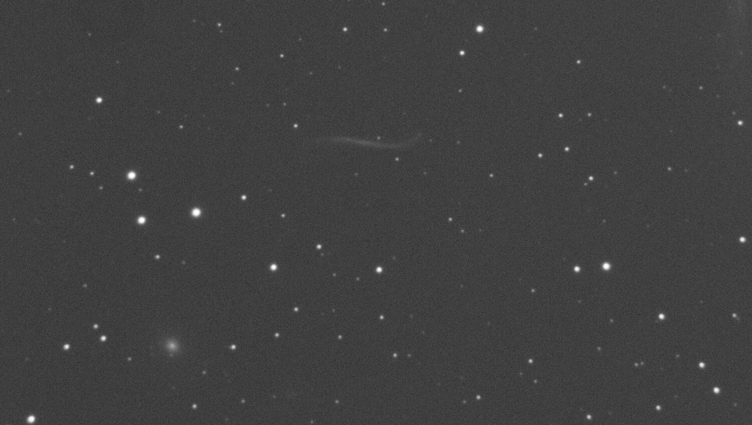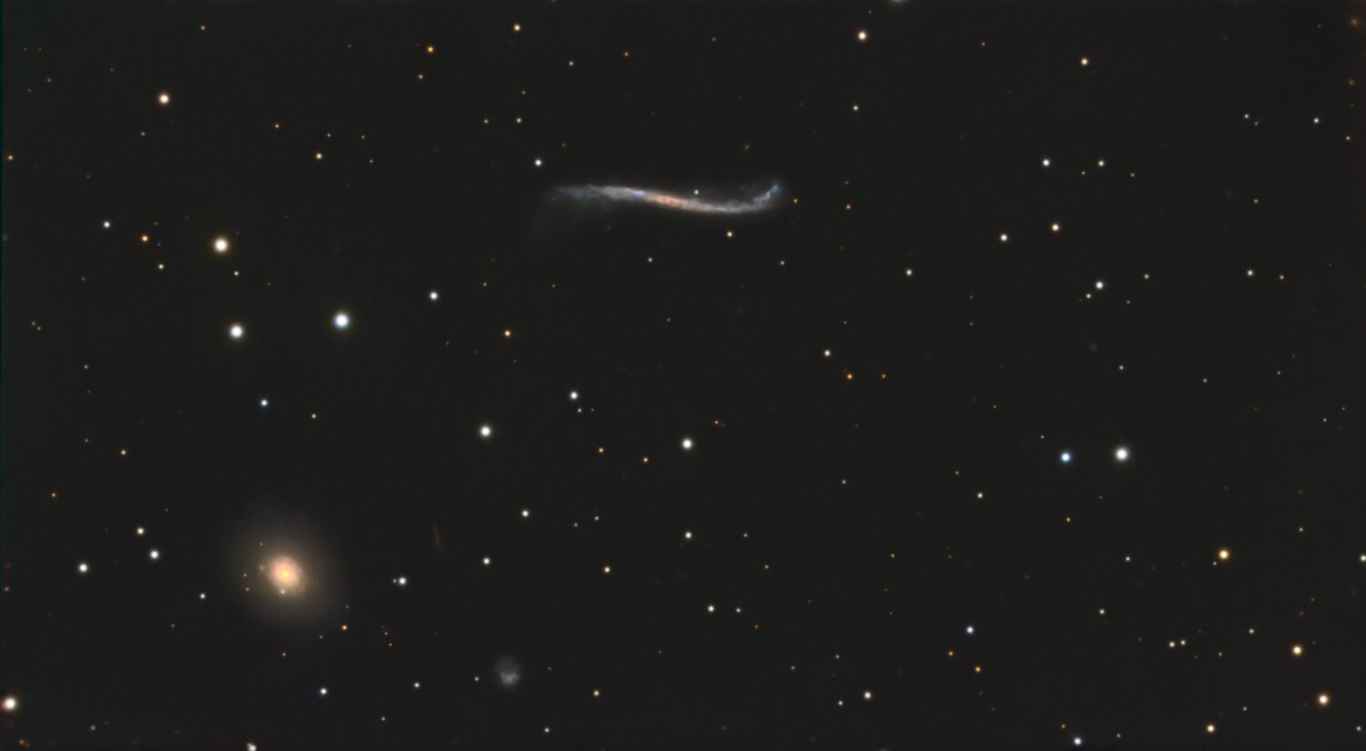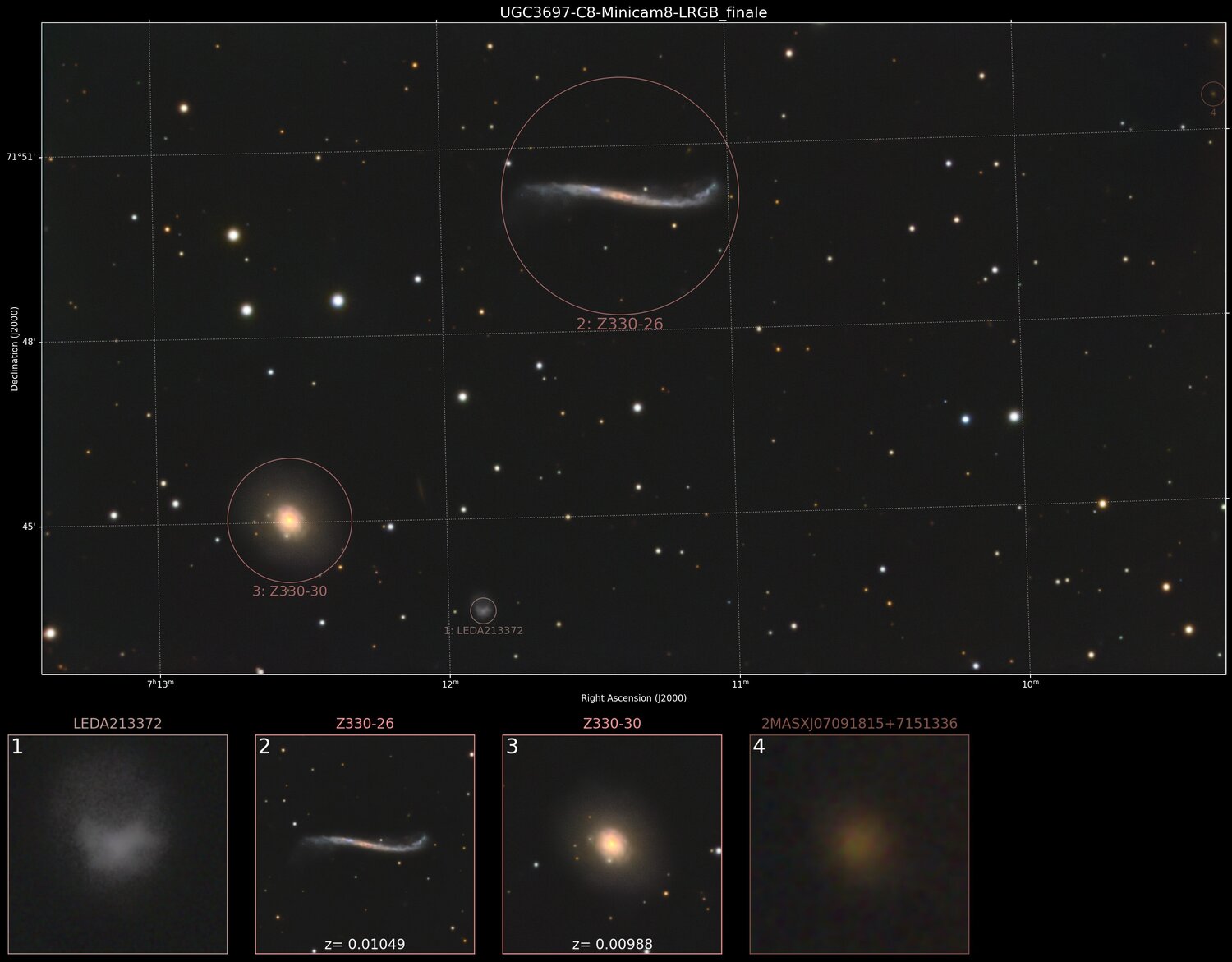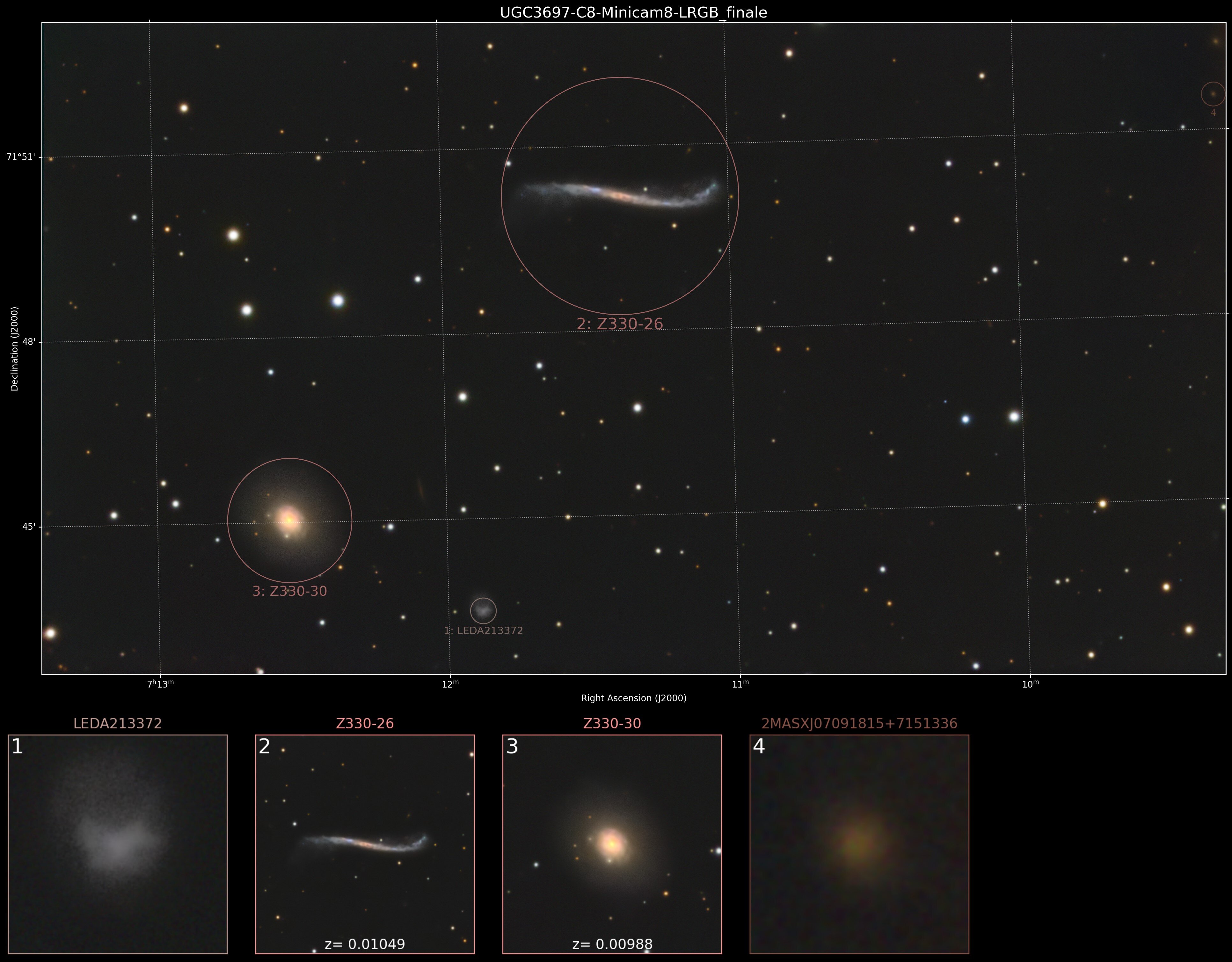Hello, Maintenant que le C8 est opérationnel avec la Minicam8 au foyer, il est temps de s'attaquer à des cibles petites, qui correspondent bien à cette configuration. Je vous propose aujourd'hui la galaxie de l'Intégrale, en rapport au symbole utilisé en mathématiques. Voici un peu d'infos trouvé sur le net. Il s'agit d'une galaxie de magnitude 13,68 située dans la constellation de la Girafe. UGC 3697 est une galaxie spirale « super-mince » vue par la tranche, aux bras déformés, située à environ 151 millions d'années-lumière. Les scientifiques pensent que la déformation est le résultat d'une interaction avec la galaxie naine UGC 3714, la galaxie spirale ronde (magnitude 12,6) située en dessous et à gauche (à l'est) de UGC 3697. Il y a beaucoup d'autres galaxies faibles dans cette image, notamment PGC213372, la galaxie de magnitude 17,7 vue de face à droite et juste en dessous de UGC3714. La « Galaxie du signe intégral » (GB 1) a été découverte en 1967 par Geoffrey Burbidge lors d'un examen fortuit des plaques photographiques de l'observatoire du mont Palomar ». Aucune autre galaxie présentant cette forme inhabituelle de signe intégral n'était connue à cette époque. UGC 3697 est une galaxie spirale de type spectral Sd, de faible masse. Elle présente une morphologie de disque extrêmement mince, que nous observons par la tranche. Sa surface est déformée, à l'image d'une chips ou d'un disque vinyle resté trop longtemps sous l'effet du soleil. Si un certain degré de déformation est observé dans une grande partie des galaxies, rares sont celles qui sont aussi déformées que UGC 3697. Contrairement aux spirales classiques vues par la tranche, où la plus forte concentration d'HI se situe généralement près du centre, UGC 3697 présente une zone d'émission brillante près de son bord ouest. Des filaments de gaz s'étendent également à partir de cette zone, atteignant jusqu'à environ 7 kpc du plan galactique. Ni les filaments ni la zone d'émission brillante du plan médian ne présentent d'homologues optiques évidents. UGC 3697 fait partie d'un petit groupe de galaxies comprenant la galaxie elliptique particulière UGC 3714 et plusieurs galaxies naines. UGC 3714, située à une distance projetée de 39 kpc d'UGC 3697, est la galaxie la plus brillante du groupe et a longtemps été considérée comme responsable de la déformation d'UGC 3697 par le biais d'effets de marée. Cependant, les marées sont des facteurs de déformation relativement peu efficaces. De nouvelles observations ont révélé des preuves solides d'une fusion récente de la galaxie avec une galaxie naine satellite. SCT Celestron C8 (203/2000) focale @ 1897mm f/d 9.3 Caméra QHYminicam8 mono Monture HEQ5 kit courroie Rowan Autoguidage via lunette guide 60/270, Asi290mm / PHD2 Acquisition NINA L= 170 x 60s R= 48 x 60s G= 44 x 60s B= 44 x 60s Mode Full resolution Gain 82 offset 30 T° -10°C Pré-raitement Sirilic/Siril , Pixinsight. SetiAstroSuite Pro. Enjoy