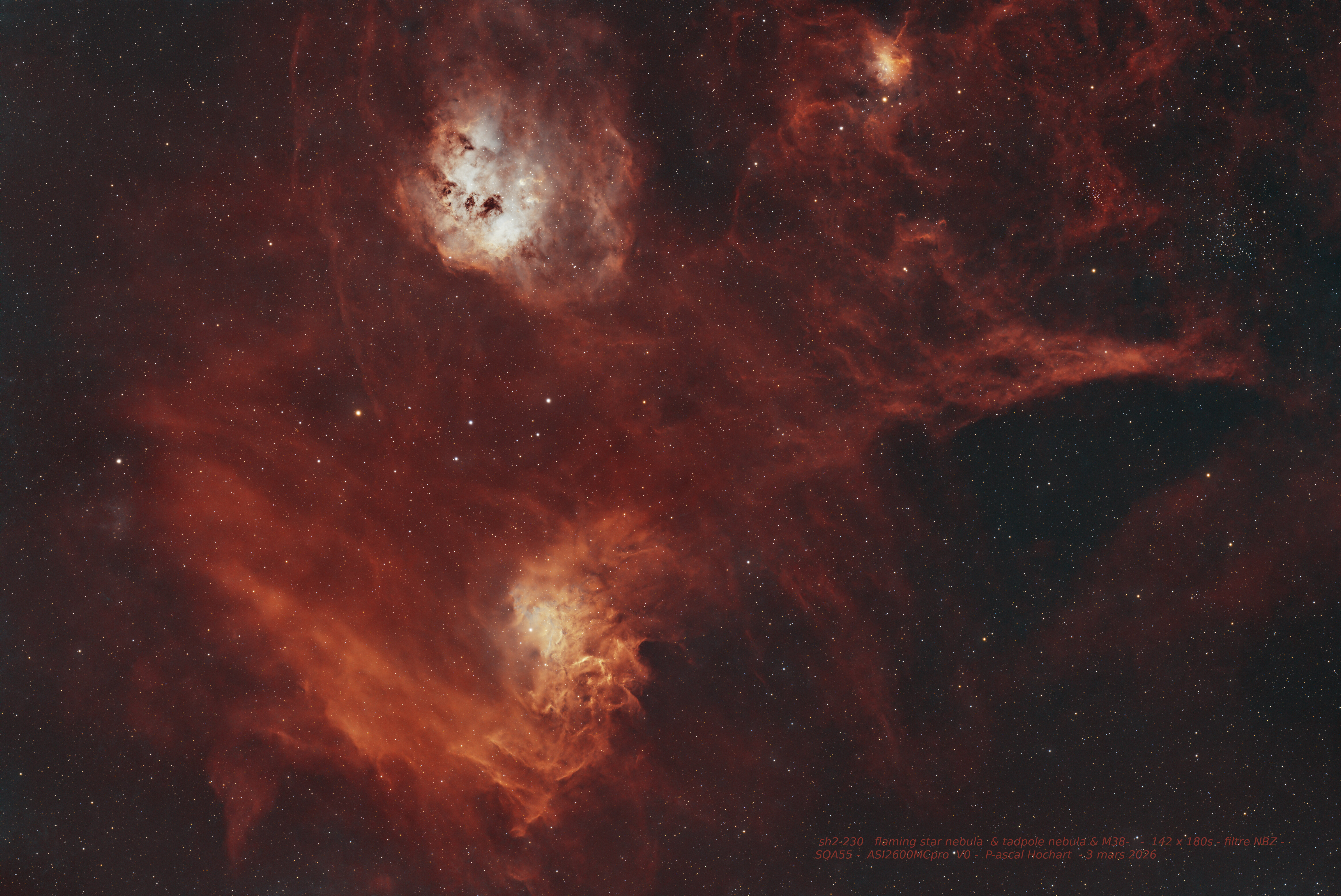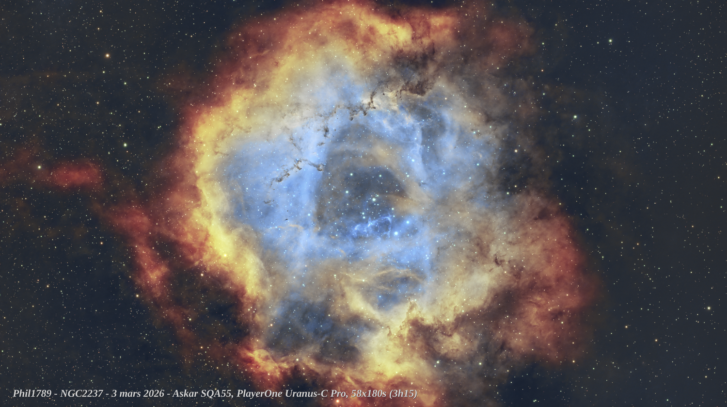 2. Bonjour à tous, enfin une éclaircie les 3 (partiellement) et 4 mars, je n'étais pas sorti depuis octobre 😞. En pleine lune mais si on attend le parfait on ne sort jamais. 7h de prise sur le sujet avec la SQA55 et filtre dual band, et un traitement HOO. Un peu orange mais je n'aime pas trop le côté magenta et je pousse plutôt vers l'orange. Merci pour vos commentaires toujours appréciés 🙂 Pascal SQA55 focale 264 sur EQ6 R pro filtre IDAS NBZ Caméra ASI2600MC pro focuser gemini Guidage PHD2 sur lunette SVBONY 30 et caméra ASI120 Nina – SIRIL – Pixinsight – RC Astro suite – GIMP