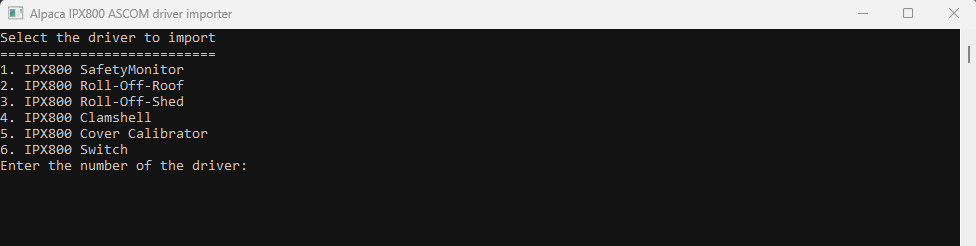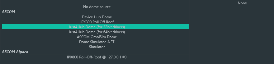 Tu installes le driver ASCOM IPX 800 Tu installes ALPACA Tu vas dans Démarrer tu cherches Alpaca IPX800 ASCOM Importer une fois ouvert tu fais ton choix (mais il faut avoir fait étape 1) Il importe le driver concerné Ensuite tu peux aller dans NINA Tu choisis Dans la rubrique Alpaca l'IPX800 ROR@127.0.0.1 Tu cliques sur les roues dentées de configuration pour tout définir dans l'if web que Julien a développé. La doc est dans : C:\Program Files (x86)\Common Files\ASCOM\Dome\ASCOM.IPX800RollOffRoof.Dome Le PDF : Documentation_fr.pdf La conf du driver par défaut dans http://127.0.0.1:8000/configuration/devices/rollOffRoofDome/edit/1 A+