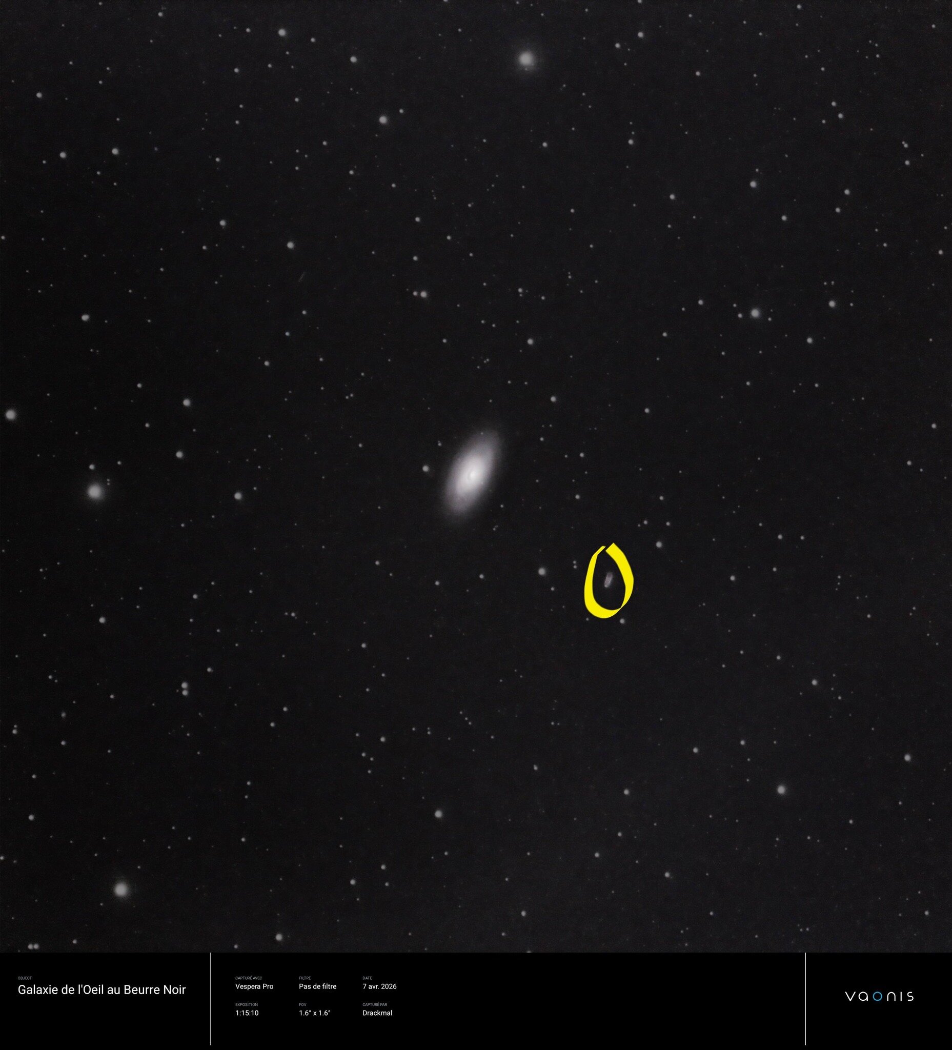 Allez, je rajoute un s au titre Date : 0️⃣7️⃣/0️⃣4️⃣/2️⃣0️⃣2️⃣6️⃣ Matériel : Skywatcher 130/900 sur eq2 et oculaires 3,6mm ; 10mm ; 20mm et 40mm ainsi qu'un filtre anti-PL Ciel : Voilé vers le Sud-Ouest, Bortle 5 Lieu : Charente, en périphérie de ville. Hier soir donc je ressort le matériel. Direction Jupiter. Aussi belle que la veille, et j'ai même réussi à voir la grande tâche rouge, une première pour moi, c'était super. Je suis resté un bon moment à la contempler. Ensuite je lance le Seestar sur M81, M82 et compagnie. On en a parlé, l'esquimau, et bien je l'ai eu ! Comme je le pensais, il était là, sous mes yeux, je l'ai débusqué grâce à l'effet blink (merci @joker0247 ). C'était amusant, en vision directe, je voyais un banal champ d'étoile (au 40mm), mais en vision décalée, il y en a une qui devenait étrangement plus brillante. J'ai pris le 3,6mm, la nébuleuse apparaissait de la taille de Jupiter. Je ne voyais rien de plus qu'une petite boule floue. Alors j'ai mis le filtre anti-pollution lumineuse, et je ne pensais pas qu'il aurait un tel effet. Sur M42, la veille, il n'avait rien donné, mais là, la différence était claire. Je devinais l'étoile centrale entourée d'un premier cercle brillant, puis d'un second, plus fin et plus faible. L'aspect global n'était pas parfaitement circulaire, un côté apparaissait plus lumineux que l'autre. Splendide. Après m'être débattu avec la molette de réglage fin qui tournait dans le vide, j'ai réussi à pointer M51. Je commence au 40mm, comme d'habitude, et je vois une tâche floue. Je passe au 20mm, je commence à voir la séparation entre les deux. Je passe ensuite au 10mm. Je pouvais maintenant clairement distinguer les deux coeurs, entourés d'un vague nébulosité. J'hésite à me mettre au dessin... Encore merci à tous les deux pour vos encouragements.