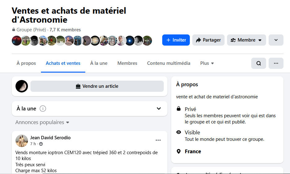 Les 2 forums Astro avec les petites annonces : https://www.webastro.net/petites_annonces/ http://www.astrosurf.com/annonces/ FB s'est bien développé depuis l'ère post Covid : Bon ciel ! -
