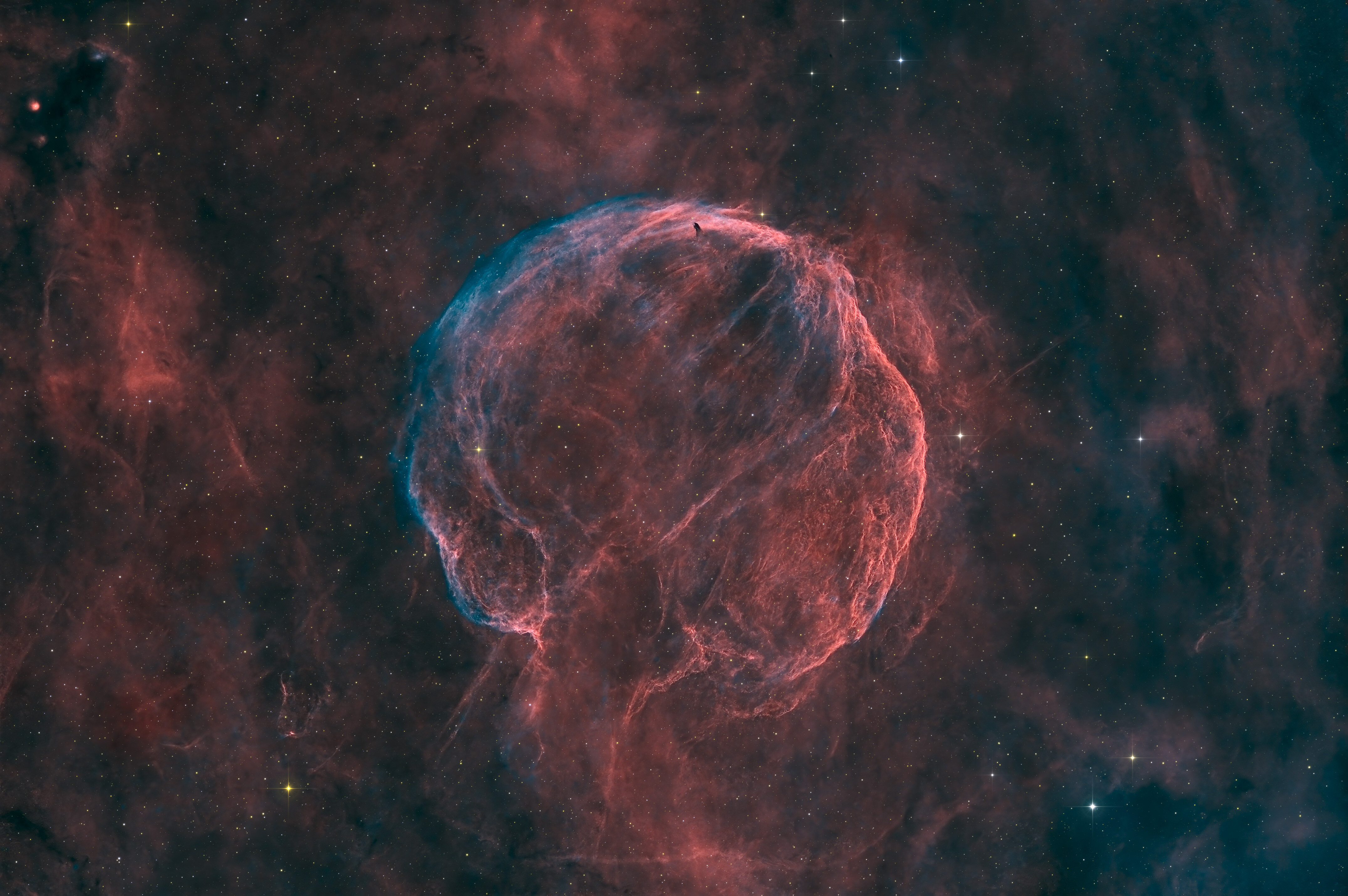 Bonsoir les gens. Bon, voici une image commencée en 2024 avec l'Askar 103/700 et complétée cet été avec la 130/910 ! Au total, environ 15h de Ha et 9h de O3 pour cette image HOO classique donc ! Assemblage de toute les sessions via Siril/Sirilic Traitement classique pix du Ha et O3 : staralign/GradientCorrection/BlurX/LinearFit/EZStretch/NoiseX/StarX LEs étoiles ont été extraite et assemblées sur des clones, en lineaire, avec PixelMath puis SPCC et SetiAstro stretch RGBCombine Ha + O3 + O3 Narrowbandcalibration + Atrouwavelet et LRGBCombine du Ha avec cette couiche couleur HOO Finalisation PL8 + PS Place à l'image et vos commentaires ! -