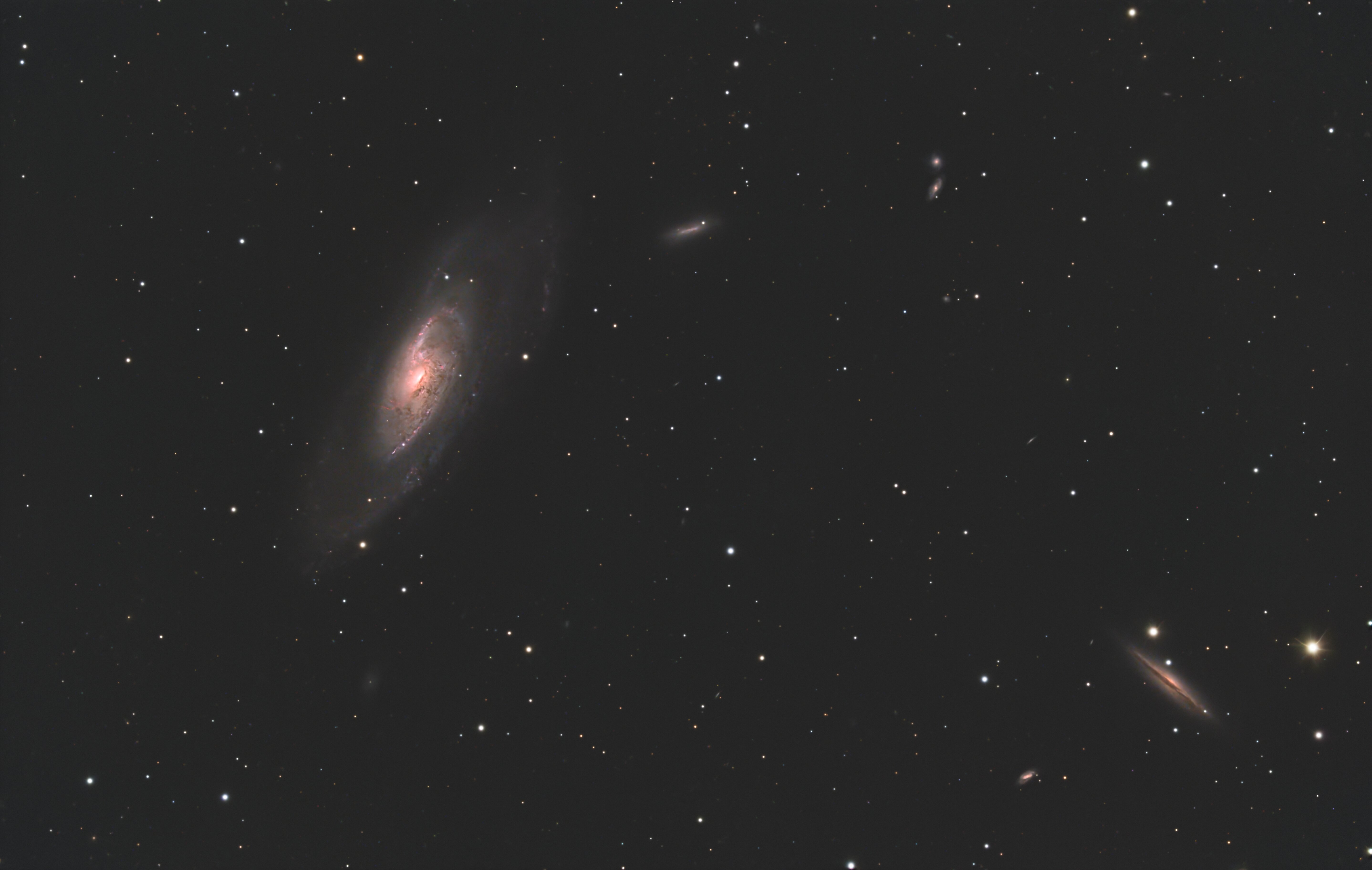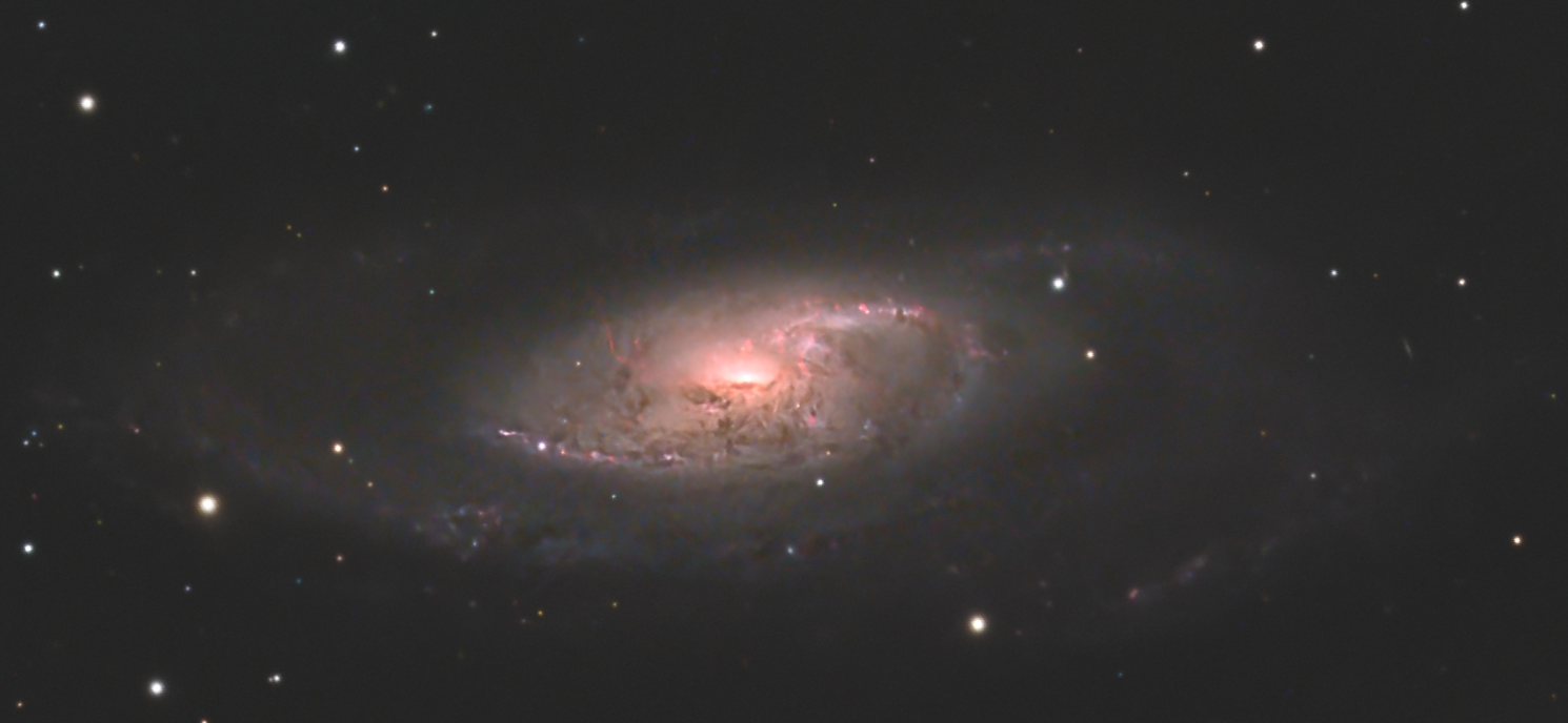 Salut, profitant du beau temps mais avec une lune bien présente encore, je me suis souvenu de M106 avec du Ha passée il n'y a pas très longtemps. Notamment le jet de Ha m'avait interpellé. J'ai donc pointé M106 avec mon filtre Altair HO 4nm et j'ai ajouté ça à mon image de 2025. La recette est donc faite au C8 à F/6.3, Altair 26C sur AZEQ6. J'avais dû faire des poses de 45s en 2025 sans filtre pour le RGB et j'ai ajouté le Ha en poses de 120s. Bortle 6-7 en centre ville Au total, 8h30 en RGB et 5h30 en Ha. Je suis content, le jet Ha est bien visible. Hier soir j'ai repris NGC4725 que je vais ajouter à ma version 2025 et ce soir, je ne sais pas encore, j'hésite à tenter le Ha sur NGC4725... a+ Sam Crop avec le jet Ha bien visible