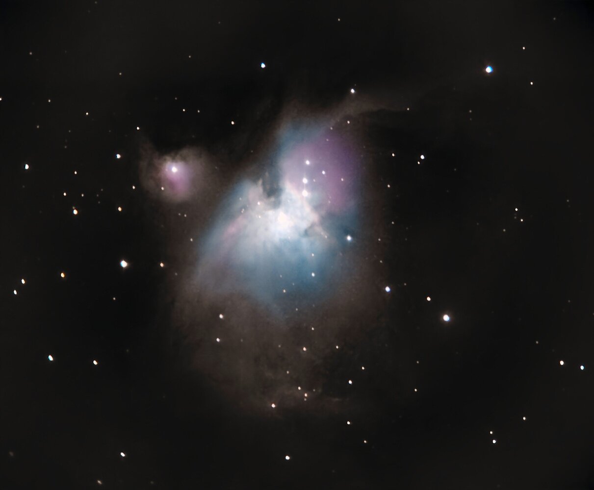 2. alors quand ca veut pas ! Orion est arrivée juste avant les nuages, mais j'ai pu faire une bonne vingtaine de poses de 10 secondes au smartphone, j'en ai gardé 18 car c'est pas évident avec la monture d'origine du vieux C8. Je les ai empilées sur DSS et ensuite pré-traitement rapide sur SIRIL et petite retouches avec GIMP. On commence à voir ce que cela pourrait donner avec plus de poses et des poses plus longues. Prise de vue à travers l'oculaire xcel-lx 25mm + réducteur de focal F / 6.3