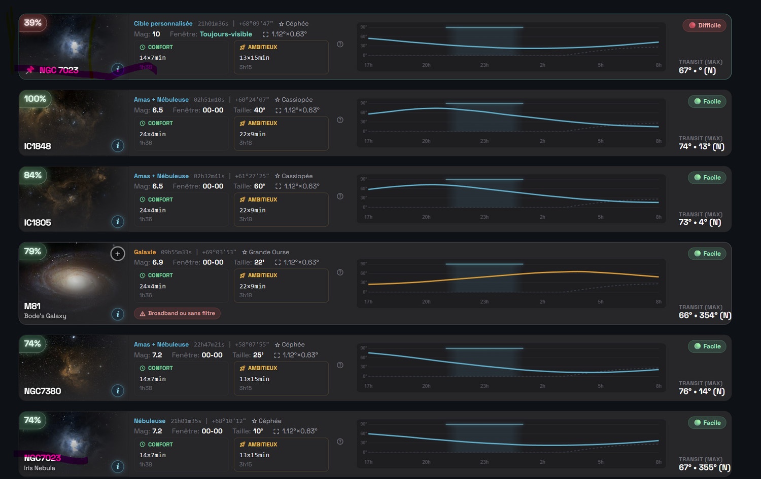 Hello @cefabien, je continue à regarder et j'ai trouvé ce qui ressemble à un bug, j'ai ajouté via la recherche un objet et cet objet n'a pas les mêmes information que quand il apparait dans la liste, et de plus il n'y a pas l'information taille cf ngc7023 dans la capture d'écran (premier et dernier objet de la liste) -