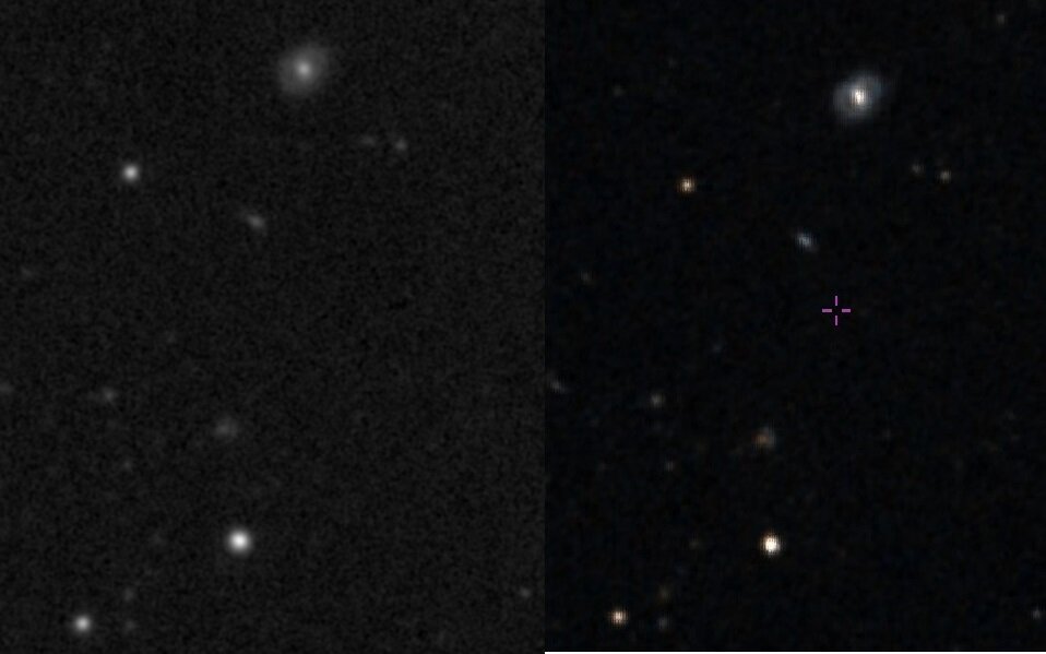 Salut, profitant du beau temps persistant (à défaut d'être très stable), j'ai été inspiré par la très belle image de @La Louche du Nord en face, j'ai consacré la nuit de jeudi à vendredi à la supernova découverte récemment dans la faible galaxie spirale vue de face NGC 3913, dans la direction de la Grande Ourse à environ 53 millions d'a.l. de nous. https://rochesterastronomy.org/sn2026/sn2026dix.html Le champ comprend également la galaxie lenticulaire tourmentée NGC 3921 or Arp 224, reste probable de la fusion de deux galaxies à envirion 290 millions d'a.l. et la spirale NGC 3916 à peu près à la même distance. En tout, 313*60sec pour la luminance avec le filtre clair et 35*60sec par filtre couleur, et l'équipement habituel (astrographe newton 250*1200 optiques Mirrosphère maison, correcteur de Wynne 2,5 pouces, camera ASI183mm sur monture AP900) depuis mon jardin de banlieue parisienne La supernova pointée (sa couleur est curieuse d'ailleurs) : Et enfin la luminance annotée : Bon WE, Dan -
