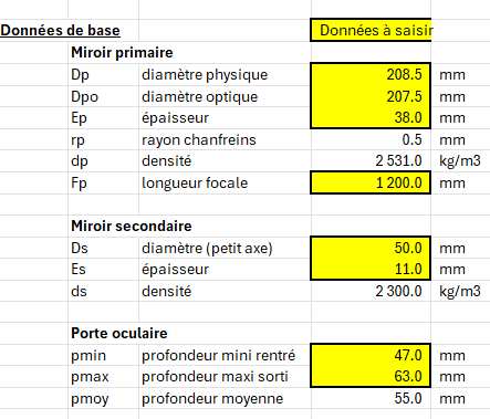 Bonjour, Voici une feuille de calcul qui donne toutes les dimensions à partir des plans paramétrables de Magnitude78 . Il suffit de saisir les valeurs des miroirs et porte oculaire, les calculs sur les plans sont faits ensuite automatiquement. J'espère qu'il n'y a pas d'erreur ! Par exemple : Les haches sont alors : calcul strock.xlsx