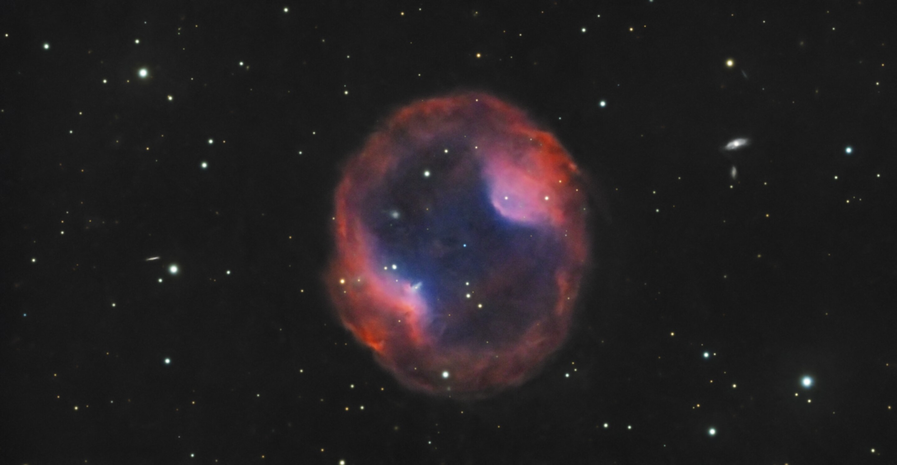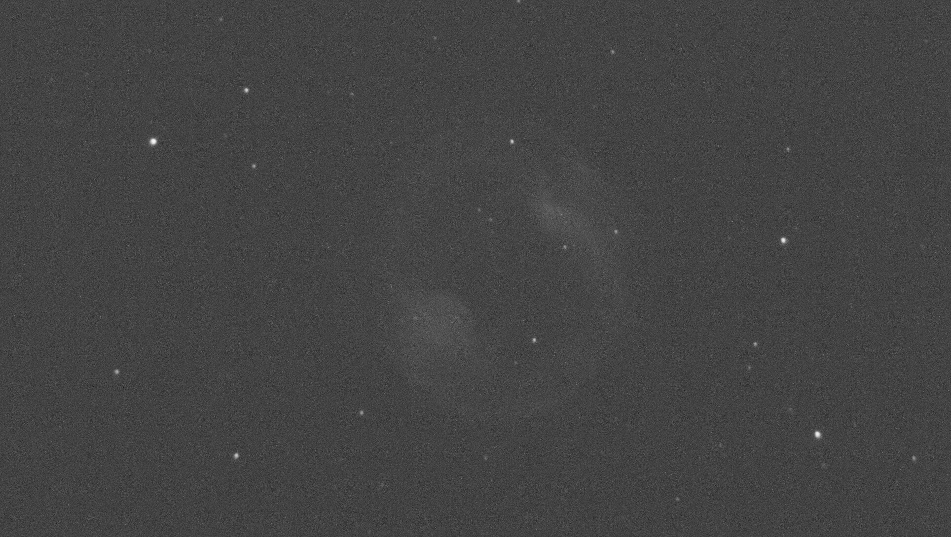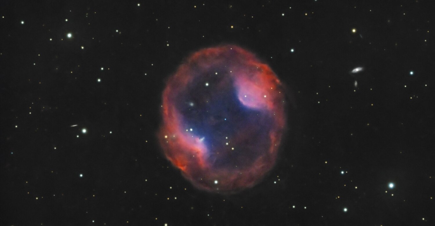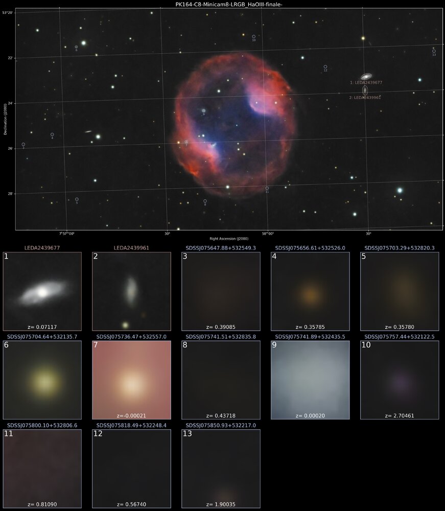 Hello, Voici la prise de ce weekend, dans la nuit de samedi à dimanche: Headphone Nebula 🎧. Spéciale dédicace à @T350, il m'a inspiré avec son image présentée ici il y a peu Jones-Emberson 1, également connue sous les noms de PK 164+31.1 et PN ARO 121 (Simbad), est une nébuleuse planétaire de magnitude visuelle de 14 située dans la constellation du Lynx à une distance de 1600 années-lumière. C'est une grande nébuleuse avec une faible luminosité de surface. L'étoile centrale de magnitude de 16,6 est une naine blanche très bleue. Elle a été découvert en 1939 par les astronomes Rebecca B. Jones et Richard Emberson sur une plaque photographique acquise avec la lunette astronomique de 40 cm de diamètre de l'observatoire d'Oak Ridge. Découverte en 1939 par Rebecca Jones et Richard M. Emberson, sa désignation de PK 164+31.1, provient des noms des astronomes tchécoslovaques Luboš Perek et Luboš Kohoutek, qui en 1967 ont créé un vaste catalogue de toutes les nébuleuses planétaires connues dans la Voie lactée en 1964. Les chiffres indiquent la position de l'objet dans le ciel. « PK 164+31.1 » désigne essentiellement la nébuleuse planétaire qui, en utilisant le système de coordonnées galactiques, a une longitude galactique de 164 degrés, une latitude galactique de +31 degrés, et est le premier objet de ce type dans le catalogue Perek-Kohoutek à occuper cette zone d'un degré carré du ciel. La taille apparente de la nébuleuse est de 6',7 minutes d'arc. Comme beaucoup d'autres nébuleuses planétaires, sa structure et sa forme sont dues à l'expansion d'une couche de gaz éjectée d'une étoile en fin de vie ; au centre se trouve une naine blanche, de type spectral DQ D, dont le rayonnement ultraviolet excite et illumine l'enveloppe gazeuse, composée principalement d'hydrogène, ce qui donne la couleur rouge sur certaines des photographies publiées, tandis que la zone interne apparaît en bleu-vert, signalant la présence d'oxygène. Bien que la nébuleuse en expansion disparaîtra dans quelques milliers d'années, la naine blanche centrale vivra, quant à elle, pendant des milliards d'années. SCT Celestron C8 (203/2000) focale @ 1897mm f/d 9.3 Caméra QHYminicam8 mono Monture HEQ5 kit courroie Rowan Autoguidage via lunette guide 60/270, Asi290mm / PHD2 Acquisition NINA L= 144 x 60s R= 44 x 60s G= 43 x 60s B= 45 x 60s Ha= 45 x 180s OIII= 44 x 180s Mode Full resolution Gain 82 offset 30 T° -10°C Pré-raitement Sirilic/Siril , Pixinsight. SetiAstroSuite Pro. Une brute de 60s filtre L: Une brute de 180s filtre Ha: