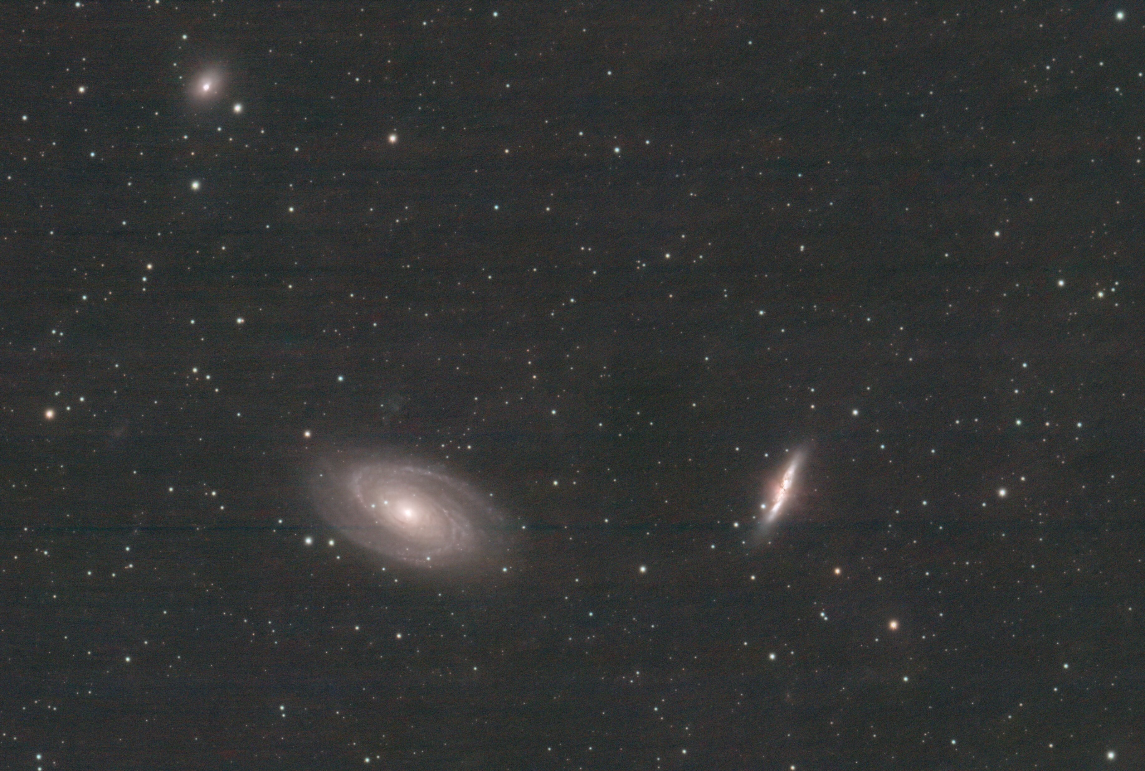 3. Bonjour à tous, Je poursuis mon apprentissage avec des grands classiques. Ici M81 & M82, pris à la lunette de 80mm, dans un bon ciel (Bortle 3 ou 4). Je suis à la fois très content et un peu déçu : Content, car c'est la première fois que je fais des poses de plus d'1h (3h dans ce cas) et que Un peu déçu, car j'ai rencontré d'énormes problèmes au traitement en appliquant le premier-traitement standard, mon image finale était pourri, avec énormément de bruit et des stries horizontales et verticales. Stris que je retrouve dans les offsets et les darks pour obtenir l'image ci-dessous, je n'ai appliqué, ni dark, ni offset, ni flat. Le résultat est bien meilleur, mais on voit encore beaucoup de bruit, et en particulier pas mal de grandes stries horizontales. Vous savez d'où ça peut venir? Merci pour vos commentaires et pour votre aide pour m'aider à comprendre le problème des stries (je peux poster des brutes pour illustrer). Prise de vue : 36 poses de 300" Matériel Lunette TS Optics triplet 80/480 APN CANON 600D Monture : Sky-Watcher Wave 150& Filtres : OPTOLONG L-pro Contrôleur : ZWO ASIAIR Pro Prétraitement et traitement : Siril Seb45