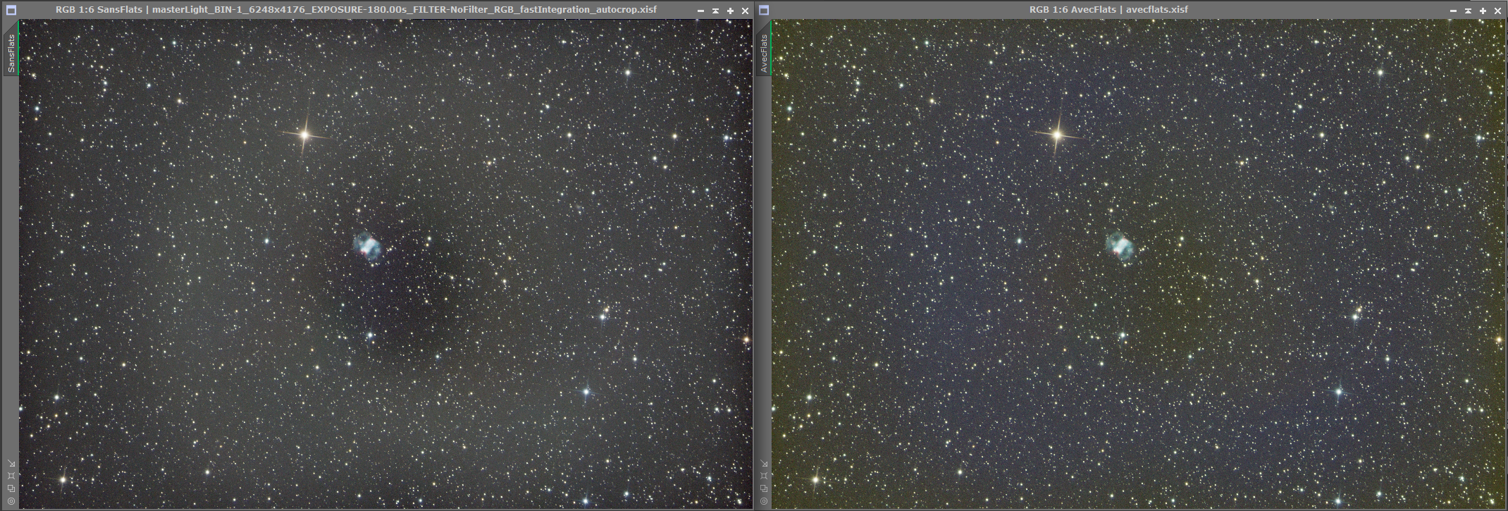 Sans flats et avec flats, retrait de gradiente et calibration des couleurs. Tu as un vignettage étrange au centre, la buée/givre n'est peut être pas à écarter. Tes flats sont probablement à l'origine de tes couleurs bizarres.. Puisque tu as une bonne caméra, tu n'as pas envisagé un vrai logiciel CP comme NINA pour faire tes acquisitions et flats ?