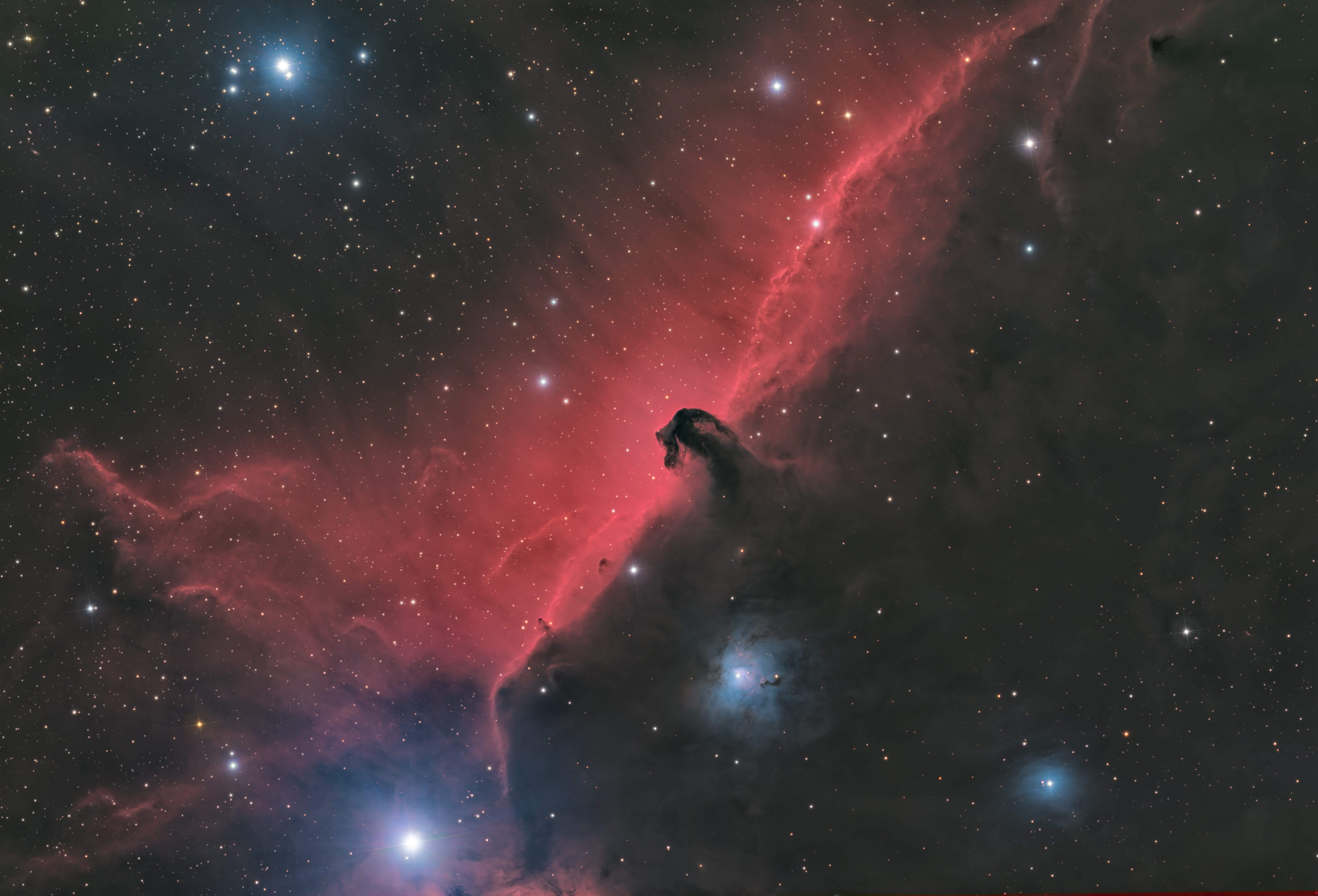 Bonjour la compagnie !! (Je sais, un revenant vont dire certains ) Etant en pleine prod (recording/mix) musicale, difficile de trouver le temps de traiter mes images... Encore pas mal d'images en stock qui datent de plusieurs mois pour certaines Bref, j'ai du coup commencé par la fin histoire d'être quand même dans le ton de la saison !! Malheureusement, peut être pas à la hauteur de ce que je visais car le temps et les conditions ont été plutôt compliquées. J'ai attaqué mi-décembre avec du full LRGB en projet...mais mes 2 premières sessions ont été à chaque fois écourtées par une couverture nuageuse d'une part, et un seeing des plus déplorables (rarement eu aussi mauvais) ! Une humidité relative chaque soir de 100%, guidage affreux, parfois vent, nuages...une misère... Puis...plus de ciel clair jusqu'au 25/12 (le seul soir), pour qq heures seulement... Et la lune s'est invitée ensuite, pleine, lumineuse, etc... Du coup, j'ai du passer en Ha 3nm. Un peu de temps après les fêtes vers 04/01 pour compléter...mais j'ai décidé de sortir une image quand même sans plus attendre. Résultat, 1h par couche RGB, et 8h environ de L, quasi idem de Ha, de qualité très variable et très moyenne Le tout avec la CF-APO 130/910 et l'Altaïr 26M. Filtres Astronomik DeepSky RGB et Askar ColourMagic Ha 3nm J'ai fait différent tests entre tri drastique, perte de signal, cumul de stack Ha/L...la meilleure solution comparative que j'ai trouvé étant celle-ci dessous : Stacks L, Ha, R, G, B via Siril/Sirilic Traitement pix : Alignement des couches entre elles et DynCrop Gradient correction (par défaut) sur chaque. Combine RGB + BlurX + Stretch VeraLux + NoiseX à 0.9 Intégration Ha via Script CombineHaRGB (dosage à 0.5 seulement). BlurX sur L et sur Ha EZStretch de chacune PixelMath AVG(L,Ha) pour une luminance permettant la conservation+définition la meilleure. NoiseX à 0.65 DarkStructureEnhance LRGBCombine avec la couche couleur HaRGB StarX puis équilibrage PS, assemblage + StarPikes Voili voili, à vous de juger avec vos oeils critques ! (clic + zoom pour full)