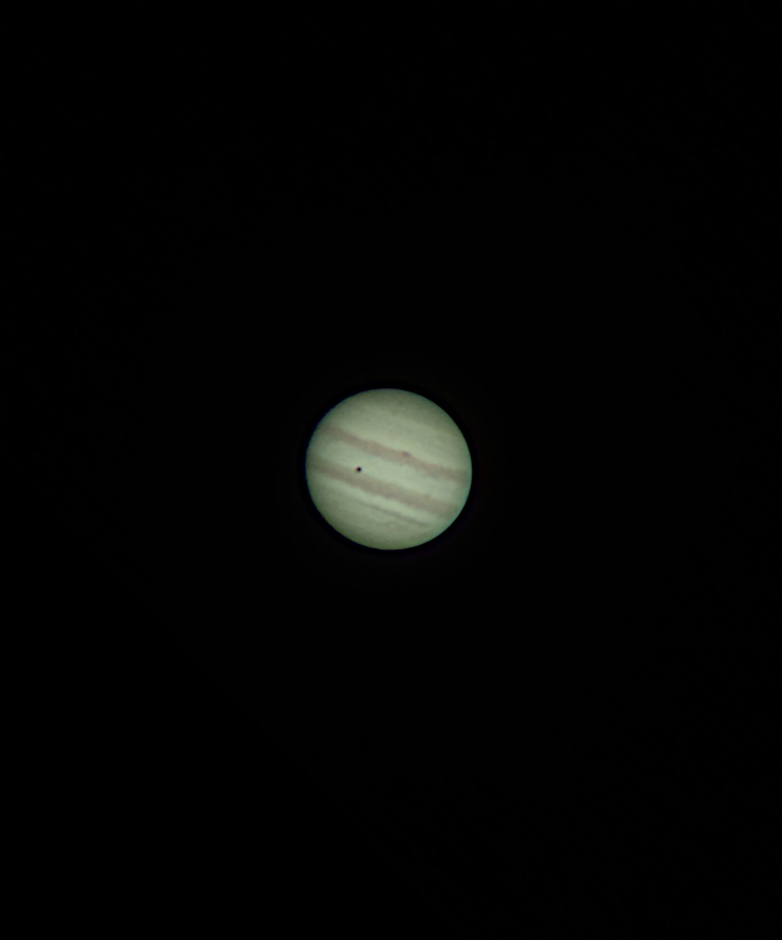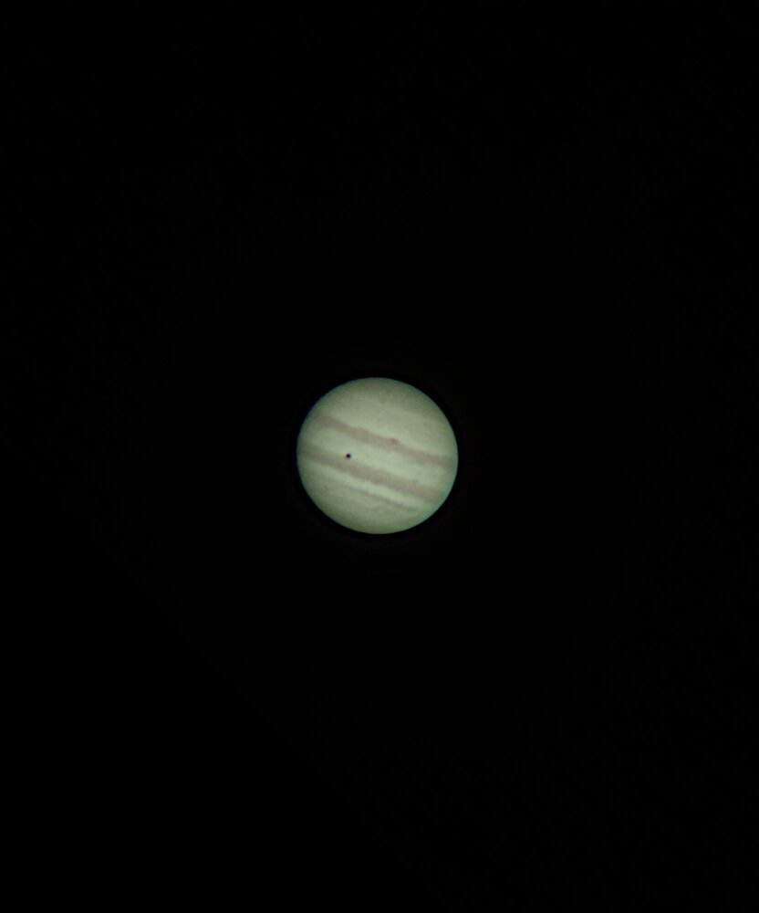 Hier soir après une longue période nuageuse et de fortes pluies j'ai pu ressortir enfin l'evostar 120 EDX. Les conditions atmosphériques étaient moyennes, une turbulence modérée et encore quelques passages nuageux. Mais bon toujours agréablement surpris par les images qu'offre cette lunette. J'ai pu observer l'éclipse de yo pendant la première partie de la soirée, par moment les détails dans les bandes nuageuses étaient très détaillés 😊, un peu de bleu visible entre les bandes et une ombre de Yo bien piquée. Petite photo tirée d'un vidéo de 1mn30s au smartphone mais qui n'est pas aussi belle que ce que mon oeil m'a permis de voir.