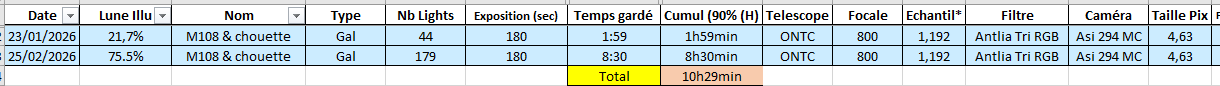 Salut à tous , J'ai shoot avant l'arrivée de mon filtre HOO ces deux galaxies que je n'avais jamais faites Avant qu'on me dise ton fdc est trop foncé, je sais mais j'aime ça Je suis sur une grossssssssse nébuleuse qui nécessite pas mal de temps de pose pour avoir un petit quelque chose, assez basse en ce moment et vers le nord, ce qui explique pourquoi je ne poste pas grand chose. Mais laquelle est-ce selon vous ??? 🔧 Setup : 🔭 Télescope : ONTC 200/800 (Miroirs Mirrospheres) 🔧 Correcteur : Baader MPCC Mark III 📷 Caméra : ASI 294 MC (–10°C, Gain 120, offset 30) + Focusser Génimi 🗺️ Monture : EQ6-R Pro 🎯 Autoguidage : lunette guide 50/180 + ASI 120MM mini sous PHD2 🌈 Filtre : Antlia triband rgb ultra ii 2" 💻 Capture : N.I.N.A : 90% de poses de conservées (10 heures 29 minutes ) Echantillonnage : 1.192 Illumination Lune : 21% et 75.5% Angle de rotation 210 ° Place à l'image : Bon ciel, A plus Nico -
