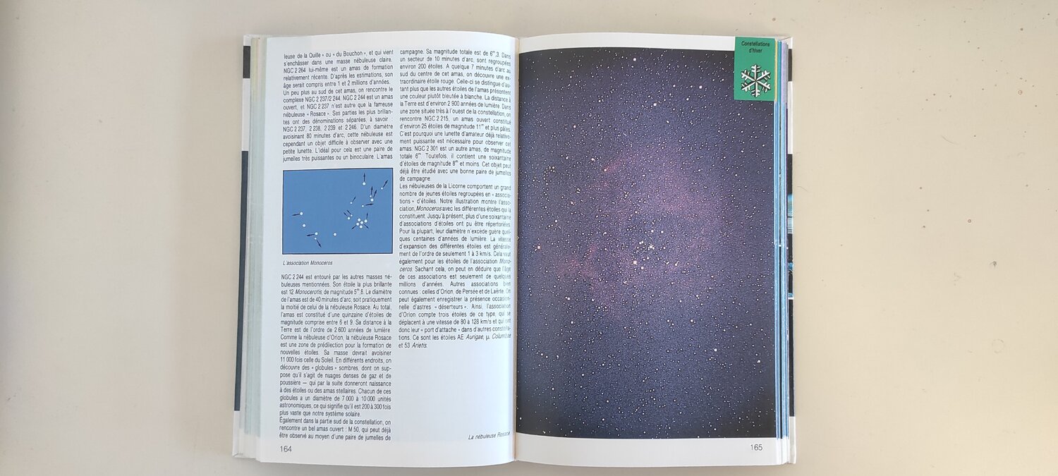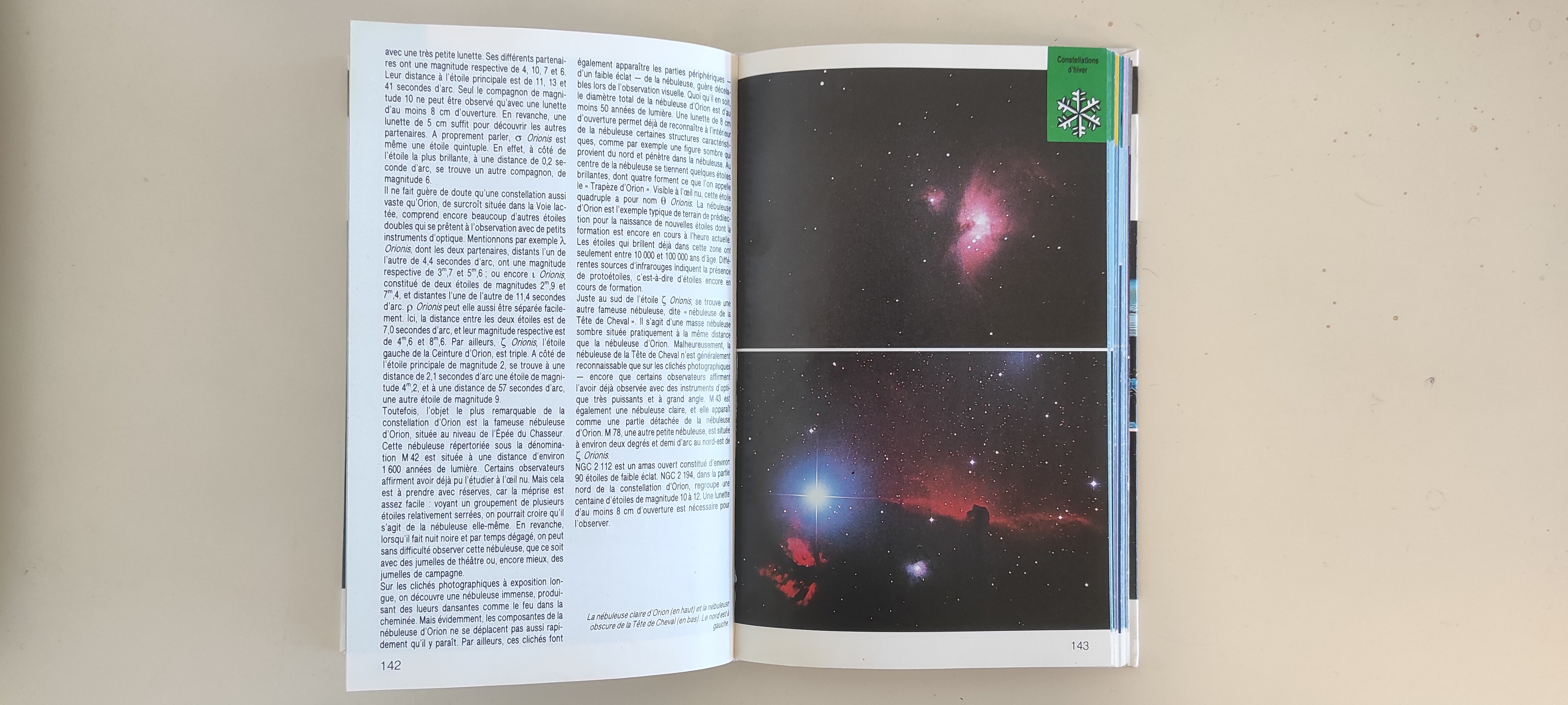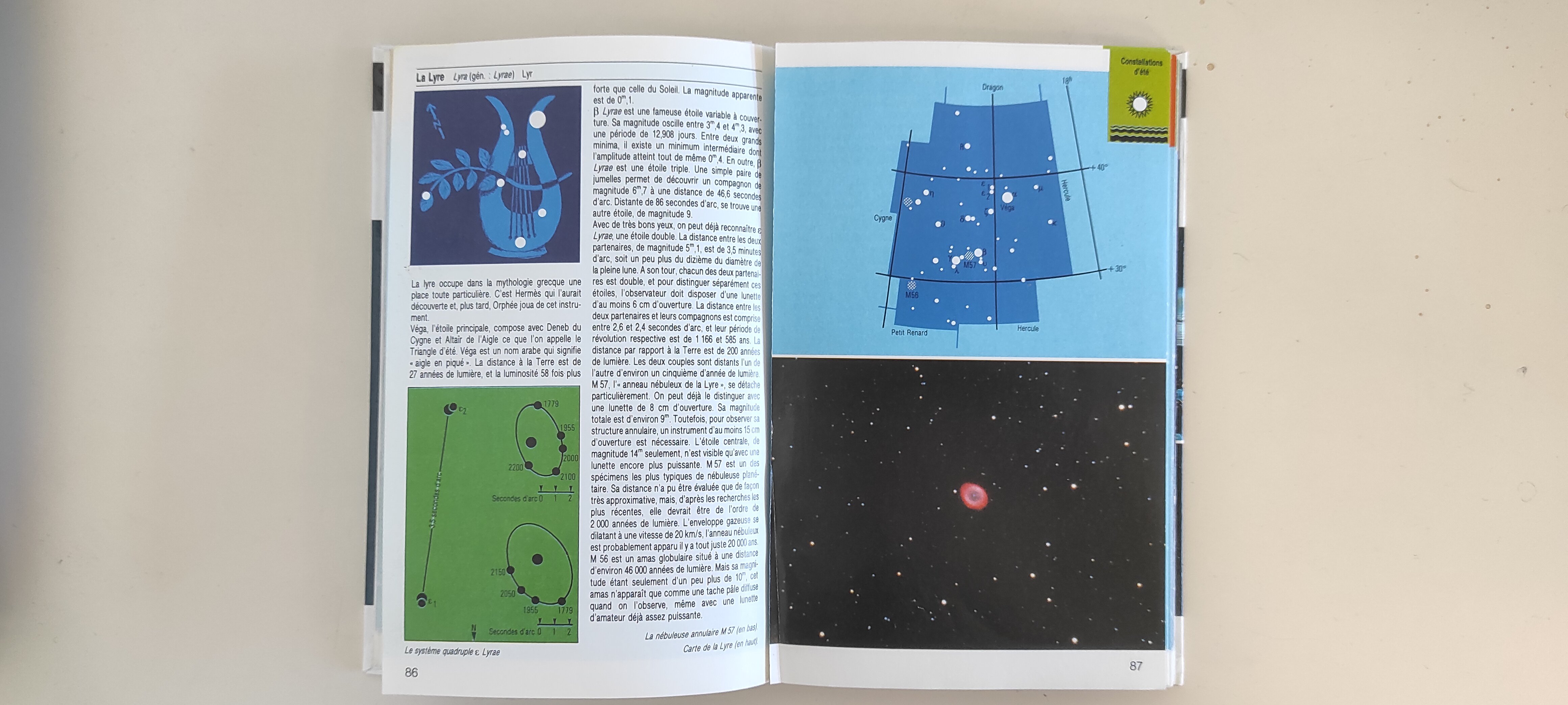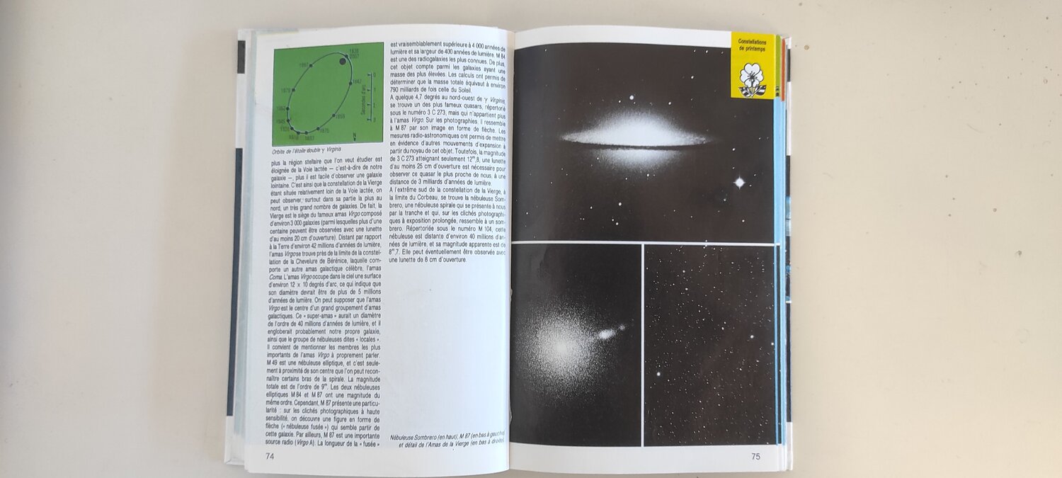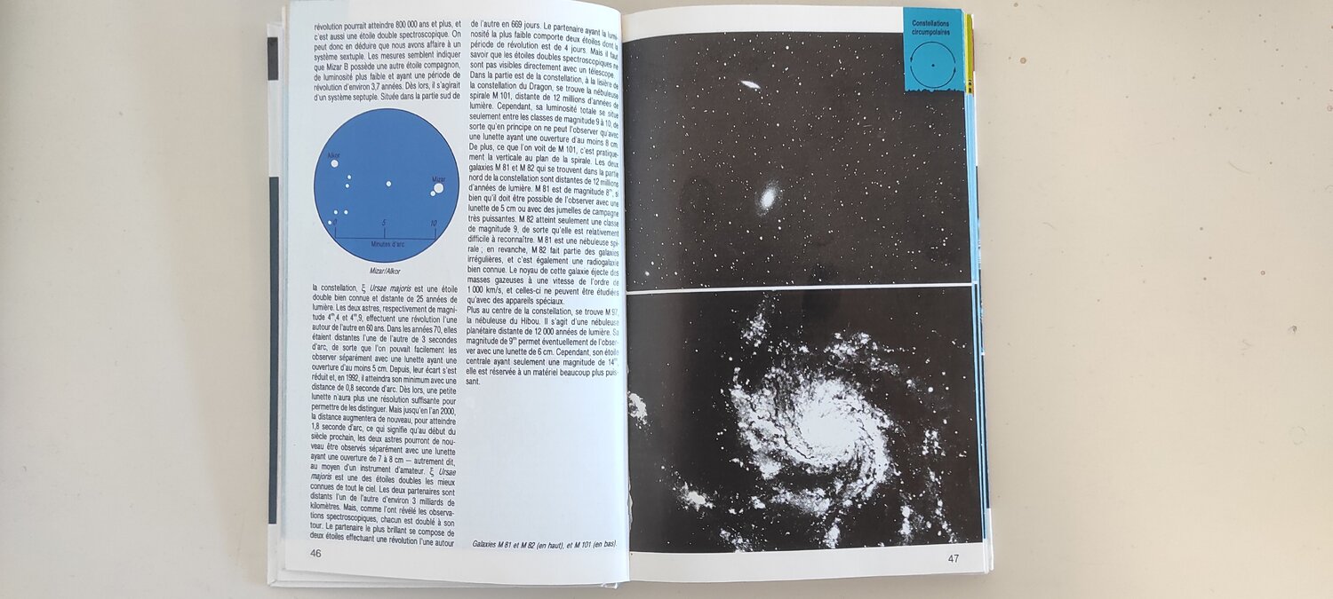 Bonjour, Adolescent je me suis intéressé à l'astronomie, un jour un opticien dans ma petite ville vendait un télescope et après plusieurs mois de négociation (note à l'école, travail pendant les vacances) mes parents m'ont offert ce 114/900 que je suppose beaucoup d'entre vous ont eu. Du coup à l'époque (les années 80) j'avais acheté en librairie un livre pour apprendre les constellations, les galaxies, les planètes et il y a peu lors d'un grand nettoyage je suis retombé dessus. Que de chemin parcouru depuis 40 ans, l'astronomie c'est quand même démocratisée et la technologie à beaucoup évoluée (numérique) pour preuves quelques photos de ce livre et des illustrations qu'il proposait à l'époque. Bon retour en arrière 😁