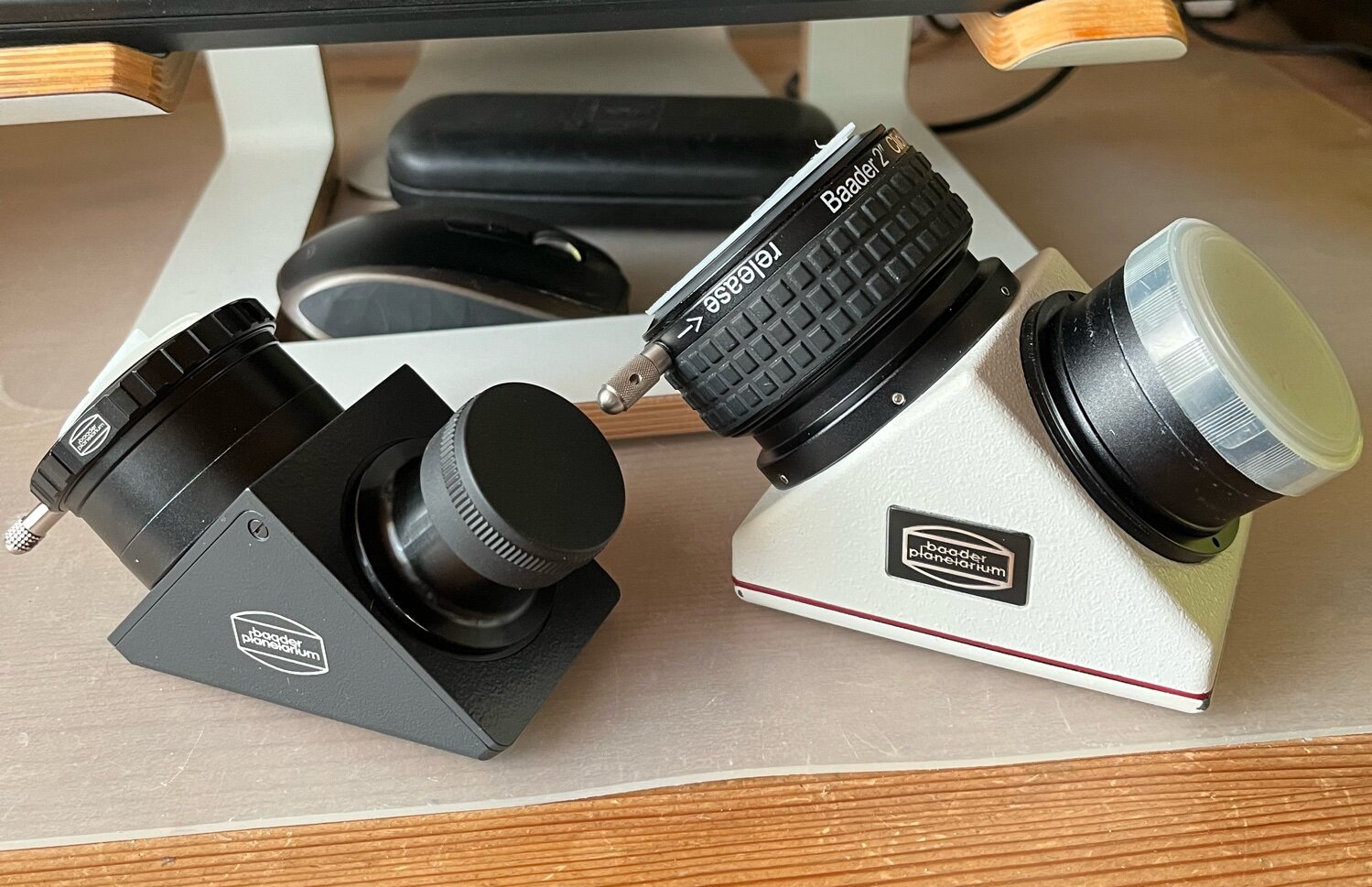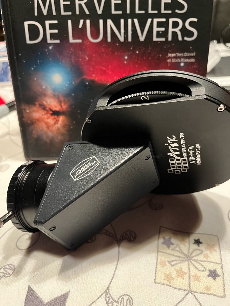 Je cherchai depuis quelques temps à racheter un prisme Baader pour y monter une roue à filtre basique (5x1.25’’) afin d’avoir un ensemble simple d’utilisation avec la 80ED f7 et mes oculaires en 1.25’´, m’évitant ainsi de manipuler mes filtres quand il fait des températures négatives…. Les gants c’est pas top 🙂. J’avais déjà eu cette configuration dans le passé avec un prisme Baader standard et c’était bien sympa. Récemment j’ai eu la possibilité d’acheter un prisme Amici Baader T2 (pour ceux qui ne connaissent pas, un prisme amici permet de redresser l’image verticalement bas/haut et du bon côté gauche/droite). Tout d’abord (sans roue à filtre), c’est petit et léger par rapport à un renvoi coudé de 2’´: Et cela reste relativement peu encombrant avec une roue à filtre: Ce week-end j’ai réussi à l’essayer…enfin du ciel sans nuages après deux mois d’attente !! Première bonne surprise, le fait d’avoir une image corrigée verticalement et du bon côté permet de naviguer très rapidement dans le ciel. Trouver des cibles devient presque un jeu d’enfant 🙂. Vraiment sympa pour l’observation lunaire. L’image est excellente et comparable à mon RC de 2´’. Les étoiles restent ponctuelles et colorées. Le contraste des nébuleuses, sans et avec filtre, est du même niveau. En ce qui concerne le gros défaut d’un prisme amici, à savoir l’apparition d’une raie de diffraction horizontale, cela est légère visible (un voile léger) sur Jupiter. Je n’ai pas constaté de diffraction sur Saturne, ni sur les étoiles brillantes. Sur Jupiter, cette diffraction disparaît visuellement si l’œil est concentré à la recherche de détails sur la planète. Hormis cette légère diffraction sur Jupiter (ce qui peut être un problème pour certains), ce prisme amici Baader T2 est excellent (avis personnel). Seul bémol, son prix en neuf élevé (proche des 300 euro) par rapport à un RC miroir ou à prisme standards de bonne qualité. Si je ne l’avais pas trouvé d’occasion, je serais resté sur le prisme basic de chez Baader.