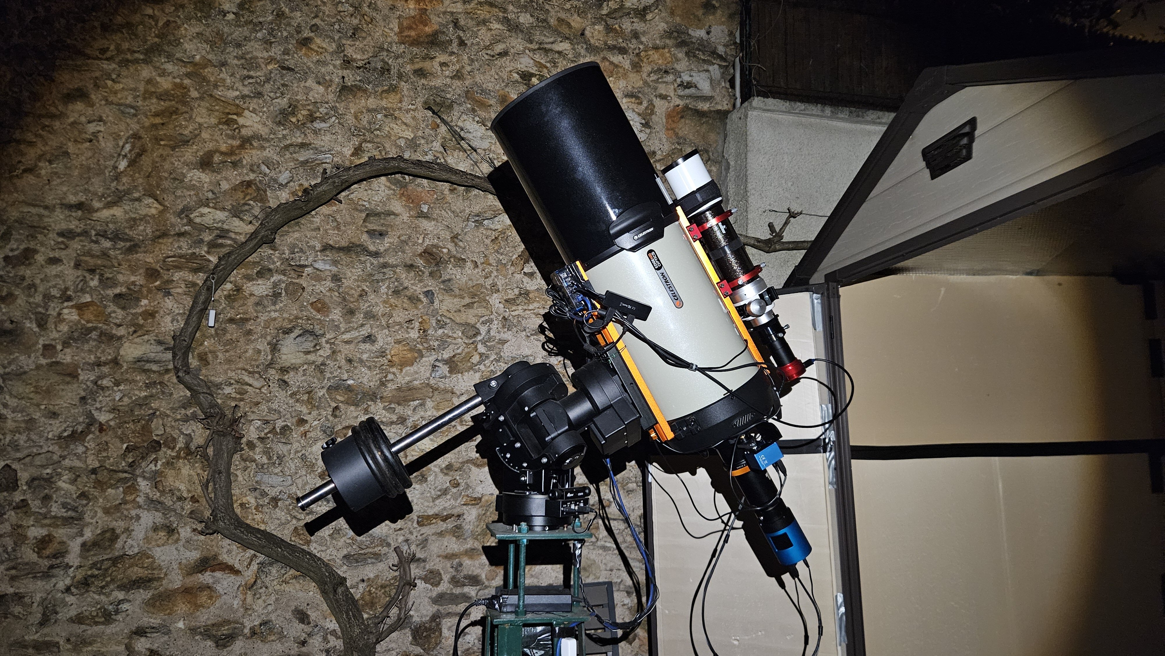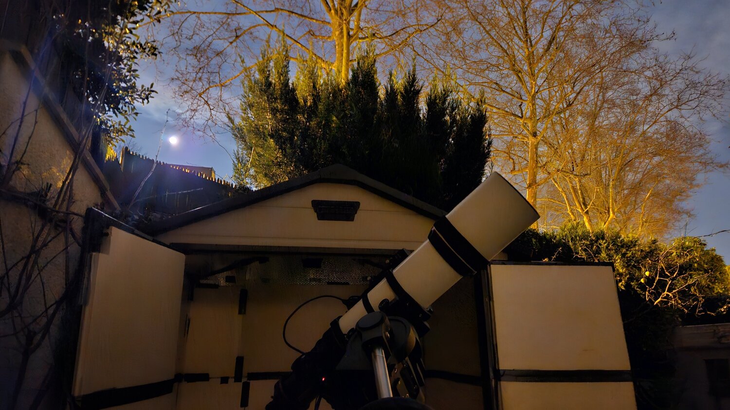 Après plus d'un an d'utilisation, je peux vous dire : un abri, ça change la vie (d'astram) !! 😄 On le pousse, on démarre (bon, il faut toujours vérifier la MAP et faire les flats)... et on observe. That's it!! Pour plier, je "parke" la monture dans une position qui permet à la lunette de repasser par les portes. Je retire la caméra. Et c'est tout : on pousse l'abri pour refermer. C'est fait. J'ai juste mon câble USB (je suis resté en filaire) à replier, mais ça prend 20s... Je l'enroule et le pose sur la barre de contre-poids. Et au redémarrage, je le pose par terre, je le tire jusqu'à ma véranda (là où je suis au chaud avec mon PC), et ça marche. Leçons : - Inutile de se prendre la tête avec l'isolation : ça ne sert à rien... Primo, car on veut que le matériel soit "à température", dès qu'on veut s'en servir (donc s'il fait 2°c dehors, on veut qu'il fasse aussi 2°c dans l'abri)... Deuzio, car sauf à mettre un chauffage, la meilleure isolation ne fera que ralentir le refroidissement (et du coup, aussi le réchauffement) dans l'abri... L'hiver, ça n'empêchera donc pas qu'il gèle dans l'abri... Et l'été, ça ralentira le refroidissement le soir, après un après-midi caniculaire (pas top, ça !)... Bref, ça ne sert à rien : ça n'isole pas, et ça ralentit l'échange thermique souhaitable. Par contre, il faut que ce soit étanche, bien sûr, vu l'électronique qu'on laisse sous abri (la monture !)... - Idem, l'humidité est un faux problème : si c'est bien aéré (et là encore, si trop bien isolé, ça n'empêchera pas le froid, mais ça risque de retenir l'humidité qui rentrera quoi qu'il arrive). J'ai un déshumidicateur, qui pourrait aussi chauffer, en cas de gel... Sauf que non, il se désactive en-dessous de 4°c, donc ça n'aide pas pour le chauffage. Alors, peut-être utile par longue période de pluie continue... Faut voir. J'ai déjà eu du 99% d'humidité dehors, et avec le déshumidificateur, ce n'était "que" à 90% dedans Du moment que l'abri est étanche (pas de pluie qui ruisselle dedans) et que rien ne permet de passer en dessous du "point de rosée" (bonne aération), pas de raison qu'on ait de l'humidité gênante (rosée sur le matériel). En tous cas, je n'en ai jamais eu, et le déshumidificateur est à deux doigts de passer sur Leboncoin, car je le branche très très (très) rarement, voire pour ainsi dire jamais - et aucun souci. Je lui laisse encore jusqu'à cet été pour voir, mais si il s'avère aussi inutile que l'année passée, je le dégage. Morale de l'histoire, pas de prise de tête, du moment qu'on ne prend pas la pluie et que c'est assez aéré. J'ai réouvert les ventilations que l'on voit au dessus de la porte et dans le fond de l'abri. Je les avais colmatées (pour l'isolation) mais c'est mieux que l'air circule... Pour un abri "minimum syndical", le plus petit possible, qui fait son job (protéger le matériel, garder la MES été comme hiver, imager rapidement quand on veuxc), c'est top. Si un jour je déménage en province avec de la place, je me ferai sûrement un chouette abri en dur, genre "toit ouvrant", avec 2 colonnes, pour avoir ma lunette et mon C9 (qui deviendra peut-être C11, si je n'ai plus à le bouger !) à poste fixe à l'année. En l'état, juste pour un instrument, c'est nickel. Rapide à construire, discret dans un jardiner de banlieue. Parfait pour moi (Et dans mon super futur abri "en dur", j'aurai aussi des colonnes béton, plus stables que ma colonne démontable en métal ajouré - obligation du jardin de location, que l'on ne peut pas trop abimer, pour quand il faudra le remettre en état pour le rendre ! 😛 ) -