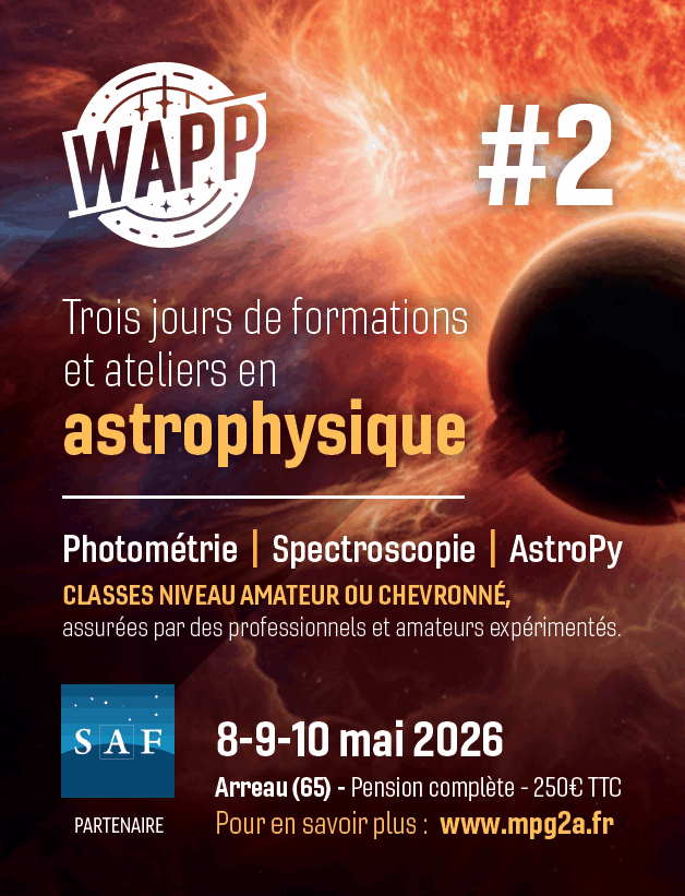 Après un succès avéré en août 2025 (voir ici) la 2éme édition du Weekend AstroPhysique des Pyrénées - WAPP se déroulera les 8, 9 et 10 mai 2026 Trois jours de formations et ateliers en astrophysique observationnelle : photométrie, spectroscopie ou AstroPy. Deux niveaux, amateur ou chevronné, assurés par des professionnels et des amateurs expérimentés. Pension complète dans le cadre enchanteur d'Arreau - 250,00€ tout compris avec activité détente. Il reste encore des places, demi-pension et paiement en 3 fois possibles. Plus d'information sur https://www.mpg2a.fr/information/ Infos : contact@mpg2a.fr