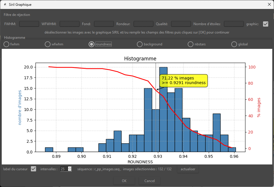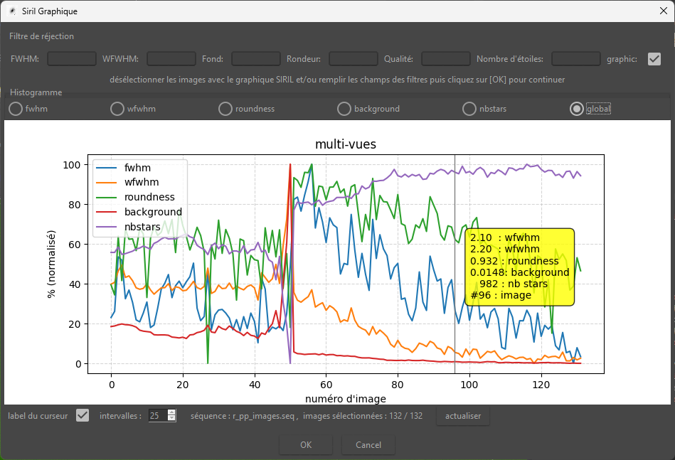 @bou-fon mise à jour en 2.0.3 en prenant en compte ta remarque. Sur l'histogramme, l'étiquette du curseur suit automatiquement la courbe. Sur la vue globale, j'ai corrigé l'échelle normalisée et j'affiche un curseur avec une étiquette qui donne les valeurs ( fwhm, wfwhm, ... ) -