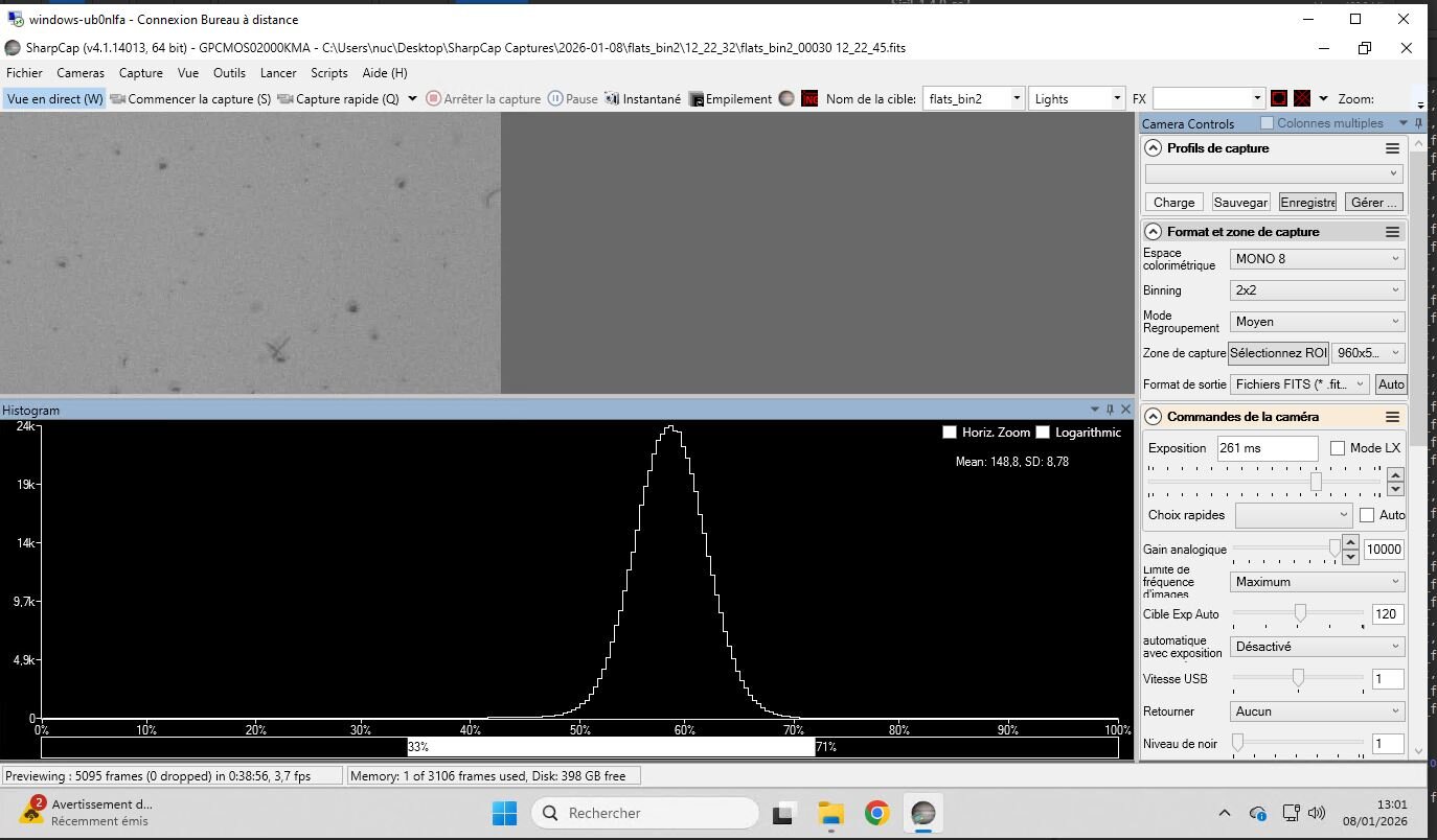17. Le gain n'a aucune importance sur les flats, tu peux même jouer avec pour réduire ou augmenter le temps de pose si besoin. Par contre, il faut ne faut pas toucher à la mise au point, aux filtres (s'il y a en un) ni à l'orientation du capteur / tube optique. Et pour la source lumineuse, le plus simple est le ciel du matin avec une feuille blanche ou un linge blanc qui recouvre l'objectif...