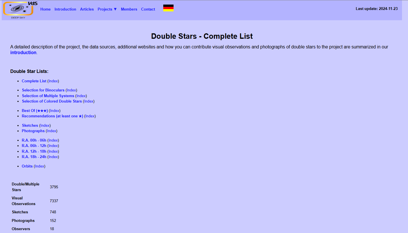 7. Tiens si tu aimes comparer tes observations, j'ai trouvé un site qui semble être une vraie mine d'or aussi, autant pour les étoiles multiples que pour les objets du ciel profond : https://deepsky.vdsastro.de/en/project-double-stars.php?index=True Rien que pour les doubles/multiples : 3795 étoiles listées, 7337 descriptions, 748 dessins, 152 photos... Différentes listes possibles, en fonction de certains critères : complète, jumelles, colorées, recommandées, best of, ... Seul point regrettable : pas de possibilité de filtrer pour faire des listes personnalisées (par constellation par ex) ; elles sont rangées uniquement par ascensions droites croissante. Mais un simple copier-coller dans excel et le tour est joué !