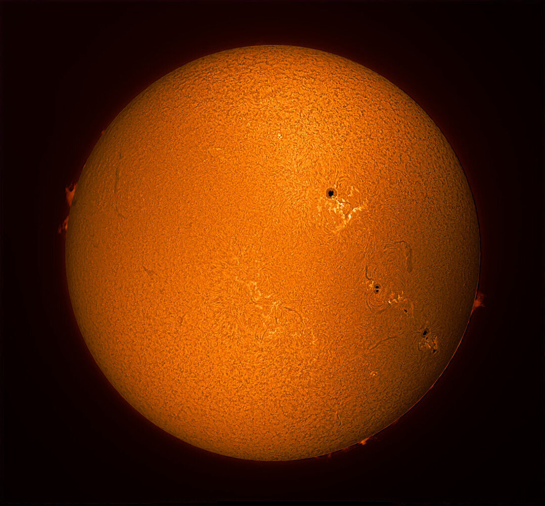 Bonjour, Soleil du 03 mars 2026, Matériels : - HEQ5 PRO GOTO, - SOLARMAX III, - PLAYER ONE APOLLO, - Barlow x2.5 pour la vue zoomée. Traitements : - AutoStakkert, - Registax6 - GIMP, assemblage, négatif, coloration Bon ciel - Aujourd’hui