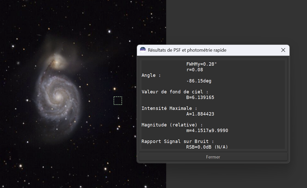 pour être sur : la pipette dans photoshop, ou dans Siril, petit carré dans le fdc -> click droit -> psf ( faut, au minimum, 30 voir 35 / 255 sur le jpeg ) là, tu es à ............ 6 a+ stéphane