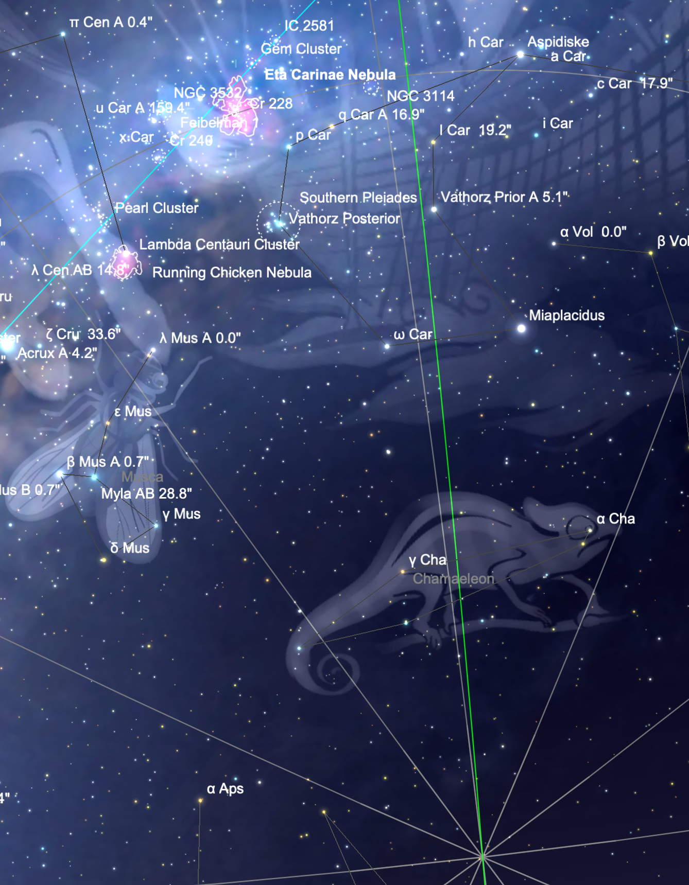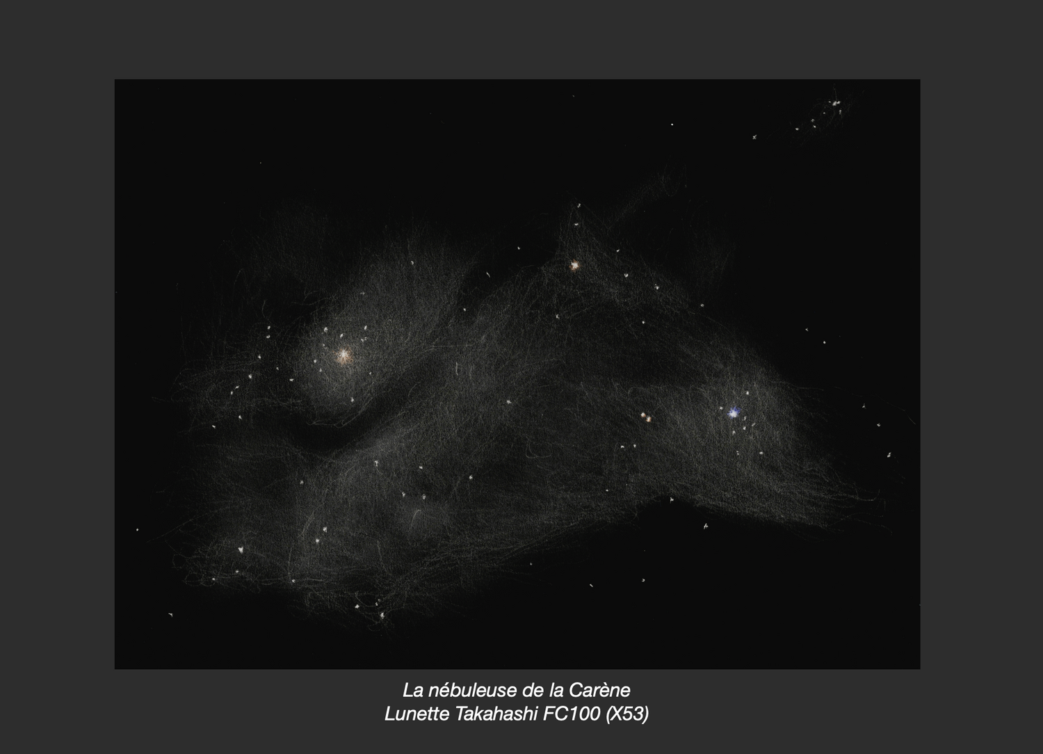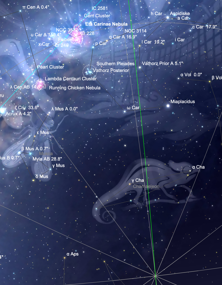 ALLONS NOUS PROMENER AU PÔLE SUD ! Bonjour à tous, Belle observation hier soir, plongé que j'étais dans les méandres du pôle sud céleste. Direction en effet : la nébuleuse d'Eta Carène ! Rien que ça ! Une petite capture d'écran pour visualiser la proximité de l'objet de la zone polaire australe. A 17X, la vue est grandiose ! C'est nébuleux de partout, et un nombre incalculable d'étoiles. Alors on reste sage et on grossit bien plus histoire de mieux cibler la nébuleuse. Et même ça, la tâche reste complexe...On ne voir pas les détails les plus fins d'Eta Carinae : ses fameux lobes qui illustrent bien l'agonie de l'étoile phare de la zone. Mais la couleur orange est bien nette et, comme toujours, à la lunette, l'image est d'une finesse dont on ne se lasse jamais ! Le dessin m'aura pris plus d'une heure et pourtant, il n'y a pas la moitié des astres visibles. loin s'en faut. Petite photo histoire de comparer les silhouettes... Bon ciel à tous !!! Gildas