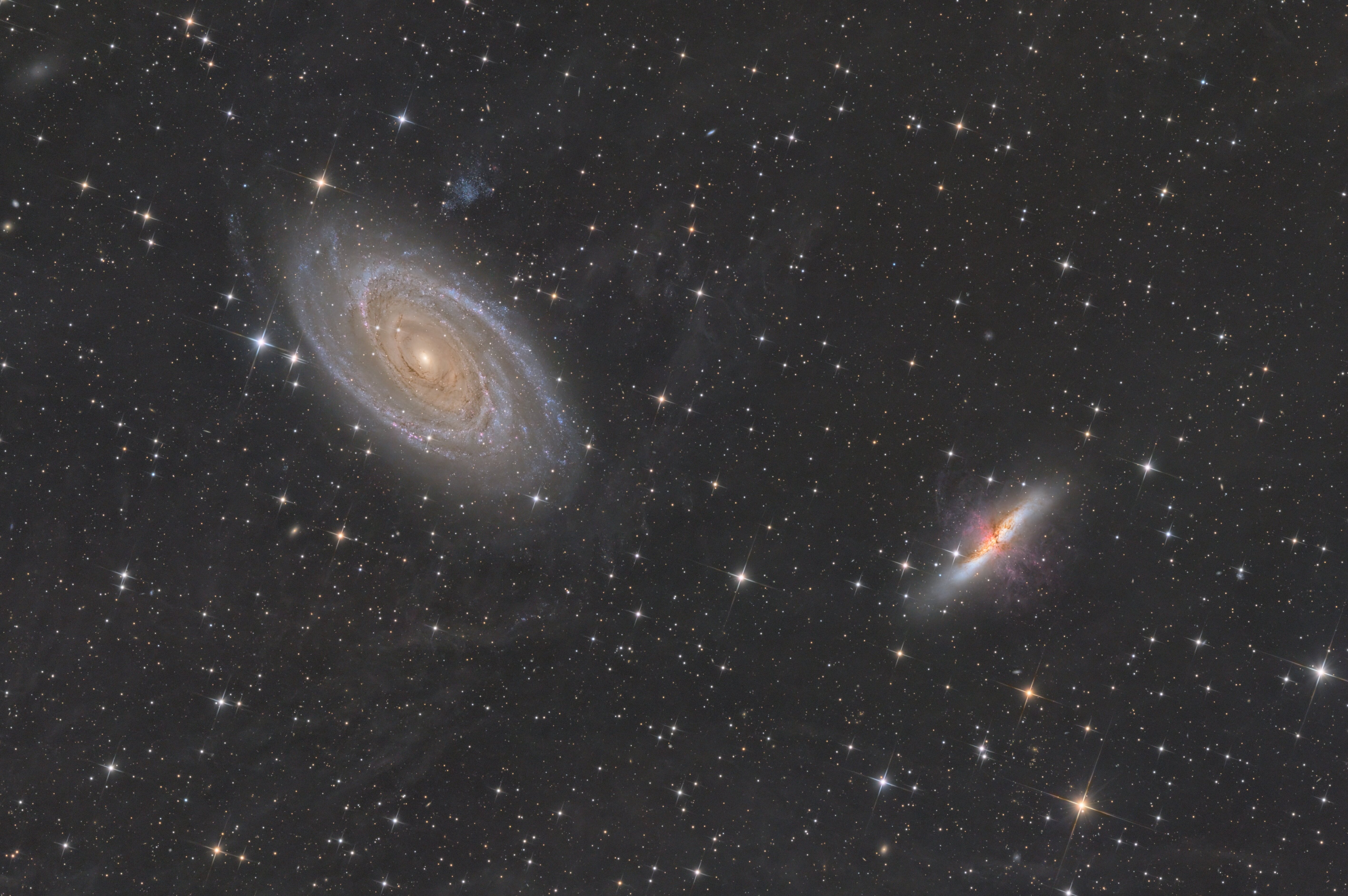 Bonjour à tous. J'ai profité du beau temps actuel en région parisienne pour shooter ce fameux couple de galaxies et tester ma nouvelle stratégie d'acquisition à base de deux caméras ASI2600, l'une couleur et l'autre monochrome. J'ai donc pu shooter 90x120s de luminance. Malheureusement, j'avais oublié le par soleil de mon newton et le secondaire s'est embué, ce qui m'a empêché d'en faire plus… Le matériel est le suivant: Newton ONTC 200/900 avec son correcteur Caméra ASI2600MM + filtre UV/IR cut Guidage au diviseur optique + caméra ASI290mm Monture Ioptron CEM40 Pilotage avec un Asiair Pro J'ai combiné cette luminance avec une image couleur acquise en 2022 avec la ASI2600MC et un autre newton (un 200/800). La couche de luminance, bien que de 3h seulement (contre 6h pour la couleur), ajoute incontestablement de la finesse et de la profondeur à l'image d'origine. Pour comparaison, elle est ici : https://www.webastro.net/forums/topic/204065-la-saison-des-galaxies/ Je pense compléter cette image avec des acquisitions en Ha, notament pour mettre en valeur les éjections incroyables de M82 Nico