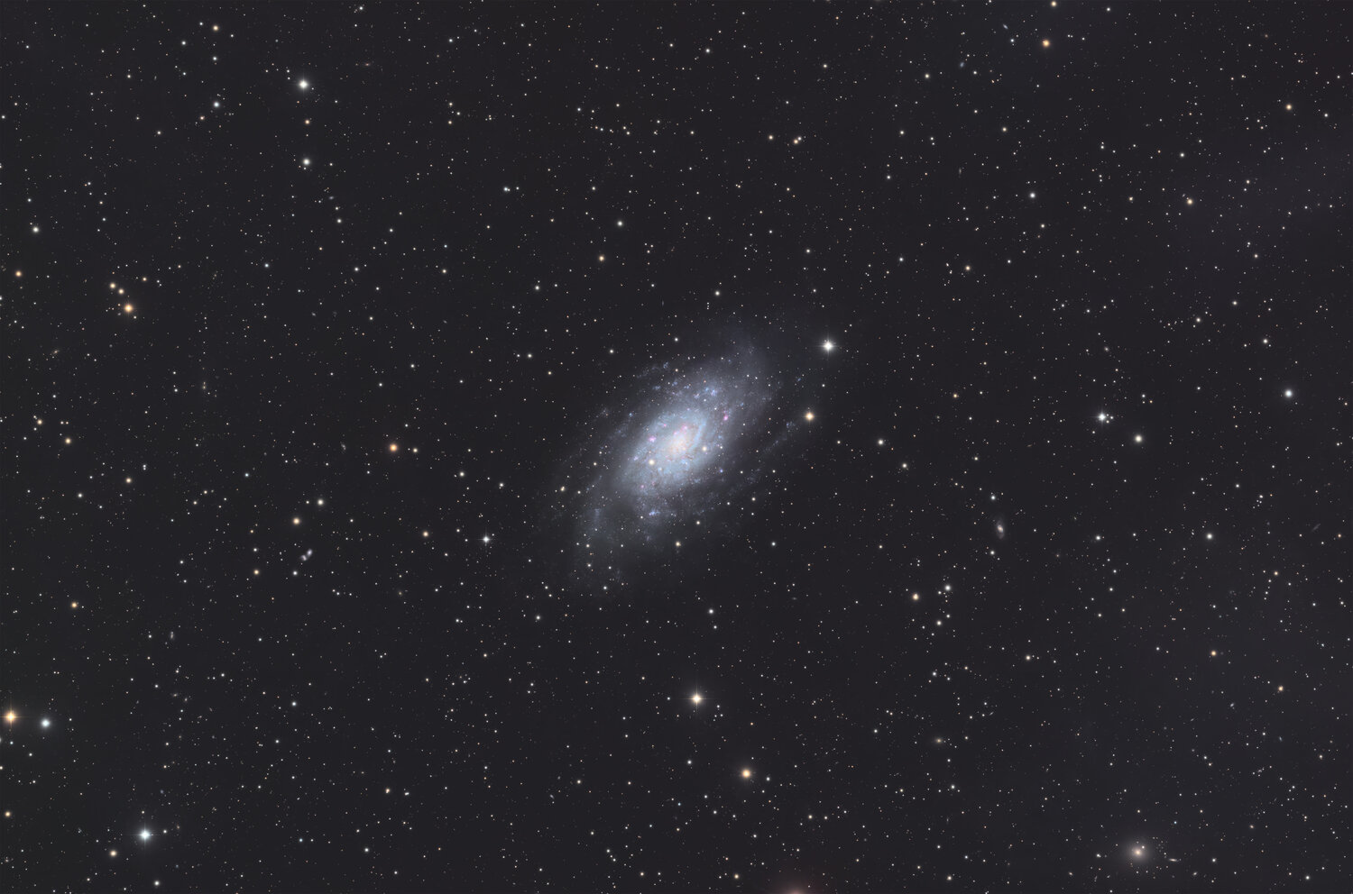 Et BIM, la prise d'hier soir, tu vois Serge @T350, moi aussi, en direct ! NGC 2403 "La fausse galaxie du triangle" Bon, J'avais installé ma nouvelle monture Dimanche sur le pillier, avec qq tracas forcément...et apprivoisée début de semaine (prises à venir). (Pour tout dire, j'ai opté pour une CQ350, étant arrivé à quasi 17kg de charge, ajout du rotateur récent et du PC+ powerbox sur le tube a contribué...) Hier soir, changement de la caméra de guidage (La SEDNA-M remplace la vielle Altaïr 290 qui me donnait du fil à retordre). Réglages, darks, calibration...et go vers NGC 2403 ! Au contraire de la veille (couvert puis découvert donc mouvements d'air) où le seeing n'était pas au rdv, ça partait plutôt pas mal...bon évidemment au zenith. La session s'enchaine, HFR 1.85 dans NINA, croisons les doigts ! Bon, ce n'est pas resté aussi calme tout le temps, mais j'ai fait des sondages et suis resté bien souvent vers 0.5" la nuit, hors gremlins et post-dither (ça déborde un peu parfois chez mois la remise en guidage...). Résultat ce matin : 350 x60" en L et 30' de chaque R/G/B comme prévu. En conservant 5h30 (90%), plutôt bonne session. FWHM finale 2.35" (pas loin de la limite chez moi) Après un traitement LRGB assez simple (j'utilise maintenant l'AMS de pix pour le stretch que j'aime bien), j'ai aussi compris une erreur grossière faite ces derniers temps sur certains objets (cf mon dernier commentaires sur ma M101). Place à l'image !