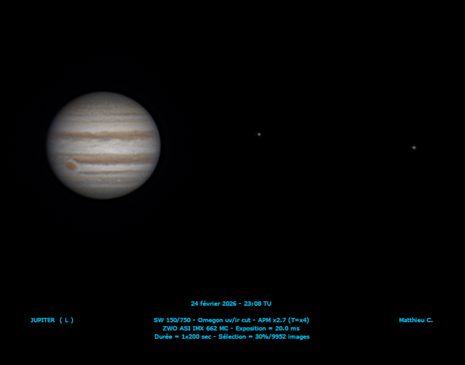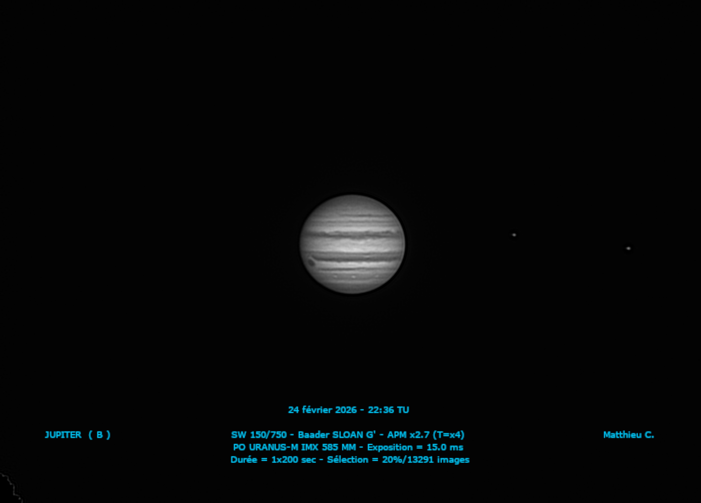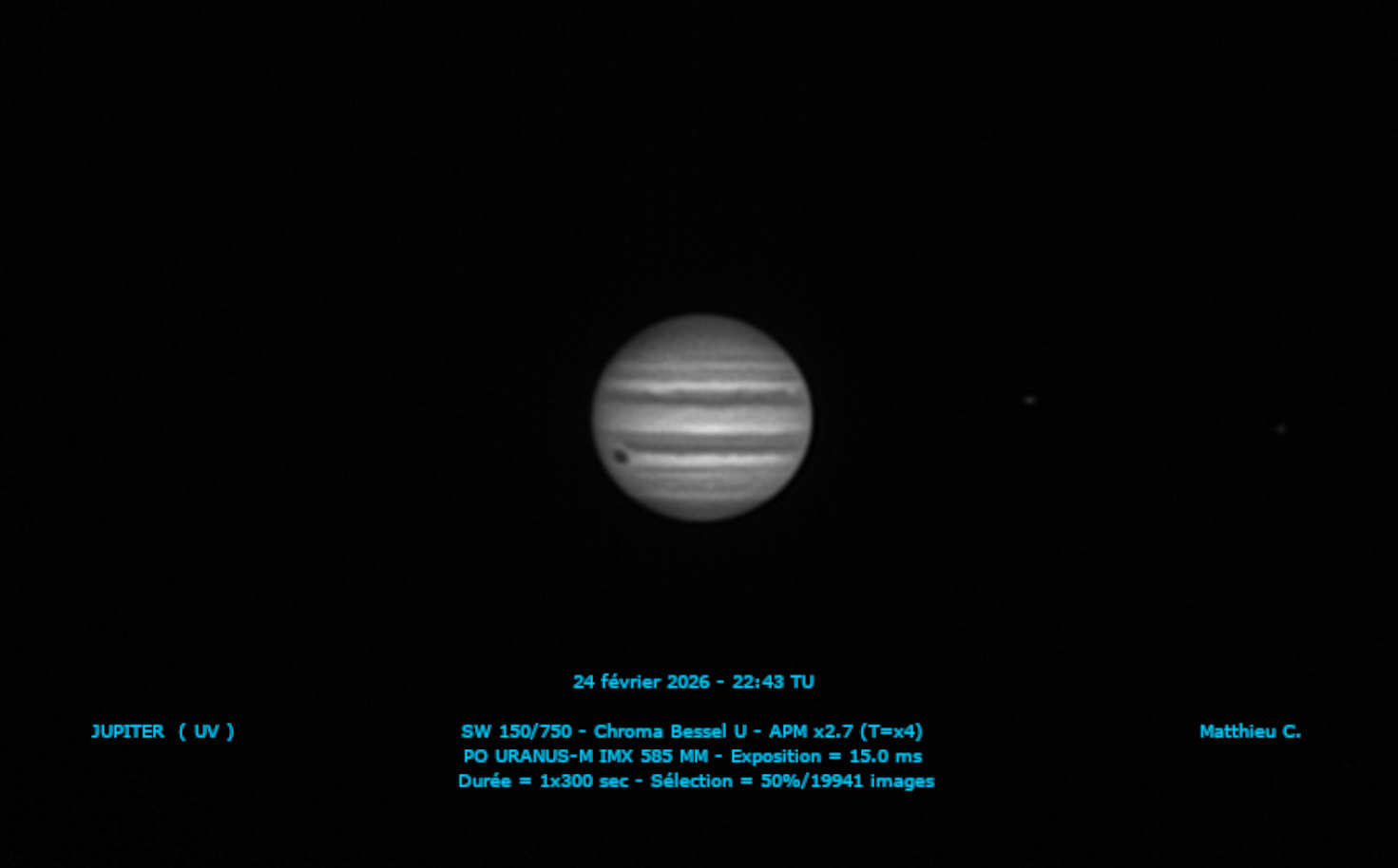 Voici la première série issue de deux nuits d'observation consécutives et plutôt fructueuses. De fait, le 150 reprend du service en planétaire, accompagné de son lot de filtres qui va bien. Le beau temps est de retour et ça fait plai'z ! Les courtes longueurs d'onde passent moyen sur ce premier jet. Par contre, il est intéressant de noter la différence de contraste entre la bleue et l'UV concernant la NTB. Elle semble indiquer la présence de composés soufrés à haute altitude, corrélée au jaunissement de la bande dans le visible. En luminance, il faut faire attention. Par moments, un point central sombre a tendance à s'inviter au GRS. C'est un artefact qui adore s'incruster sur les images à faible résolution et au traitement souvent poussé. Pour ma part et comme le montrent les images suivantes, tantôt là, tantôt pas là...